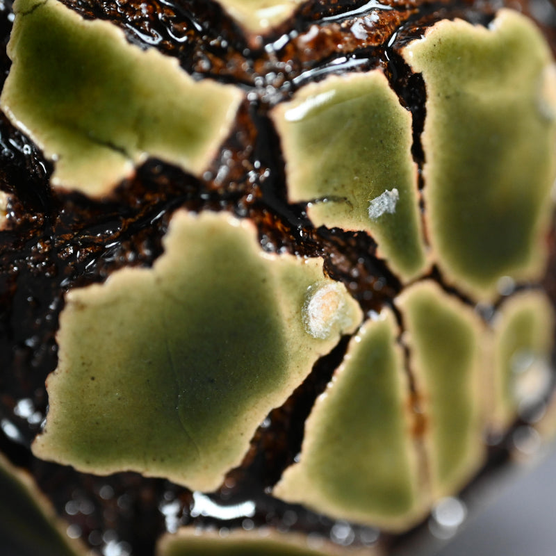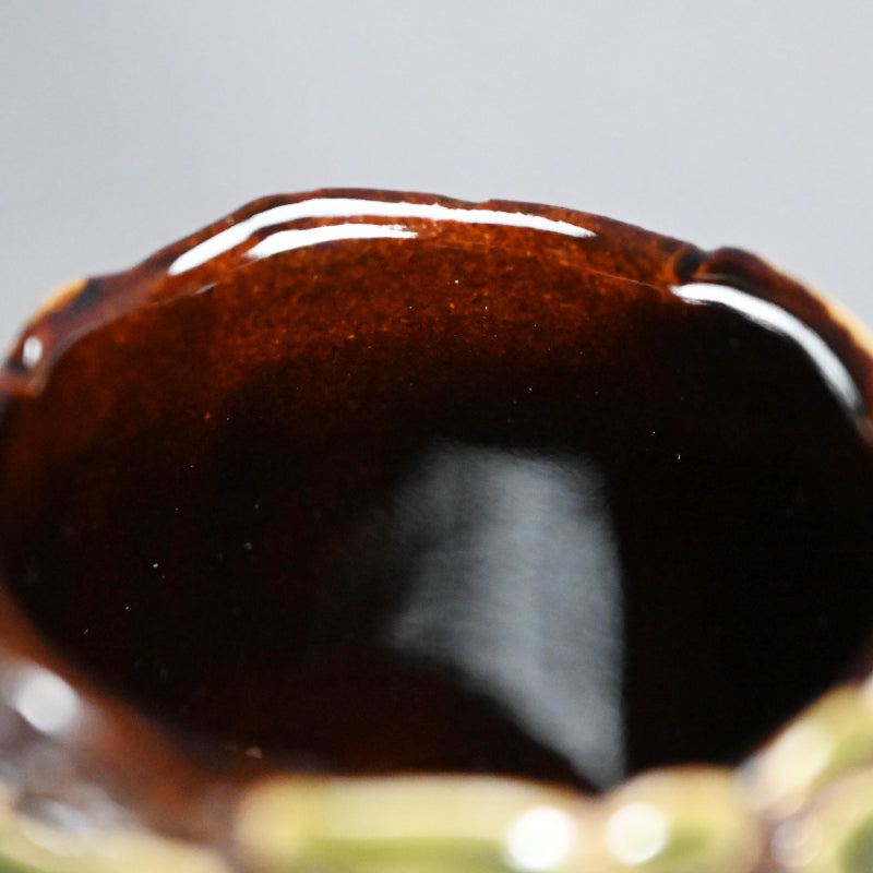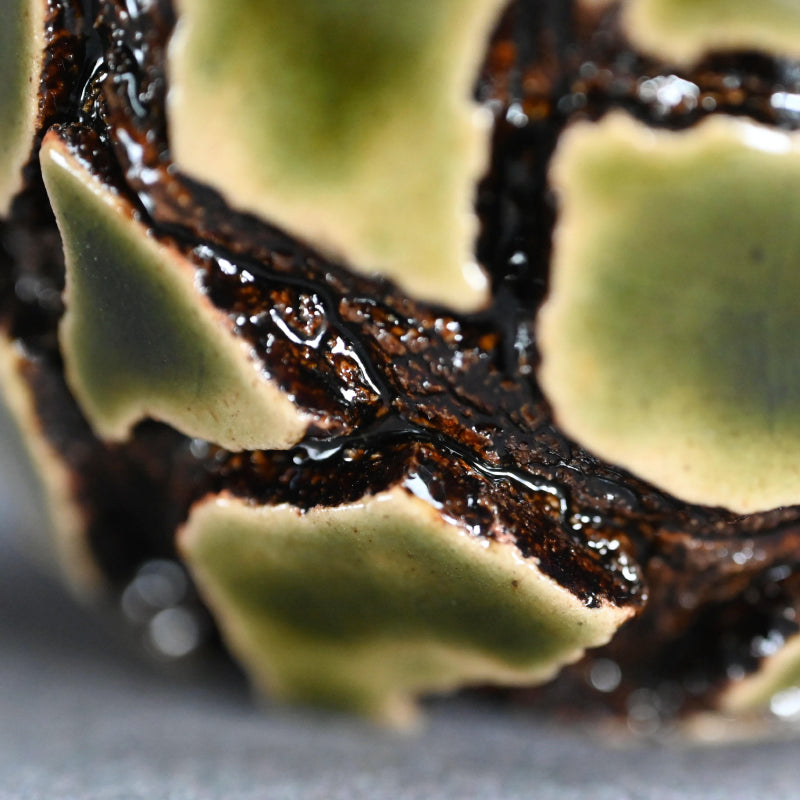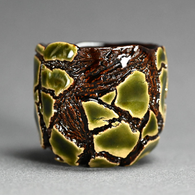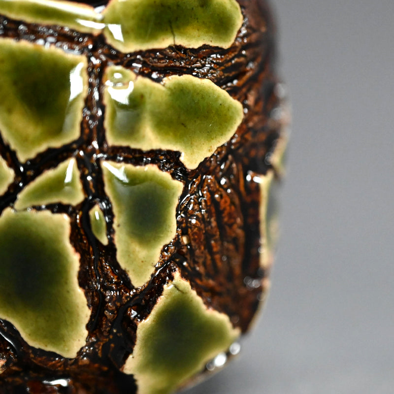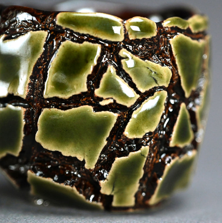 A guinomi sake cup by popular young female artist Kashima Aya in her newly developed green glaze enclosed in the original signed wooden box, The technique is deceptively complex. In fact, the initial form is created, then a thin layer of ceramic is made separately, dried, then cracked, and the individual pieces are applied like mosaic to the prepared form. The space in between the tiles is then abraded, the tiles glazed with color and the space n between glazed with iron. Each piece requires a great amount of painstaking dedication to complete. It is 7 cm (just less than 3 inches) diameter, 6 cm (2-1/2 inches) tall and in excellent condition, directly from the artist.