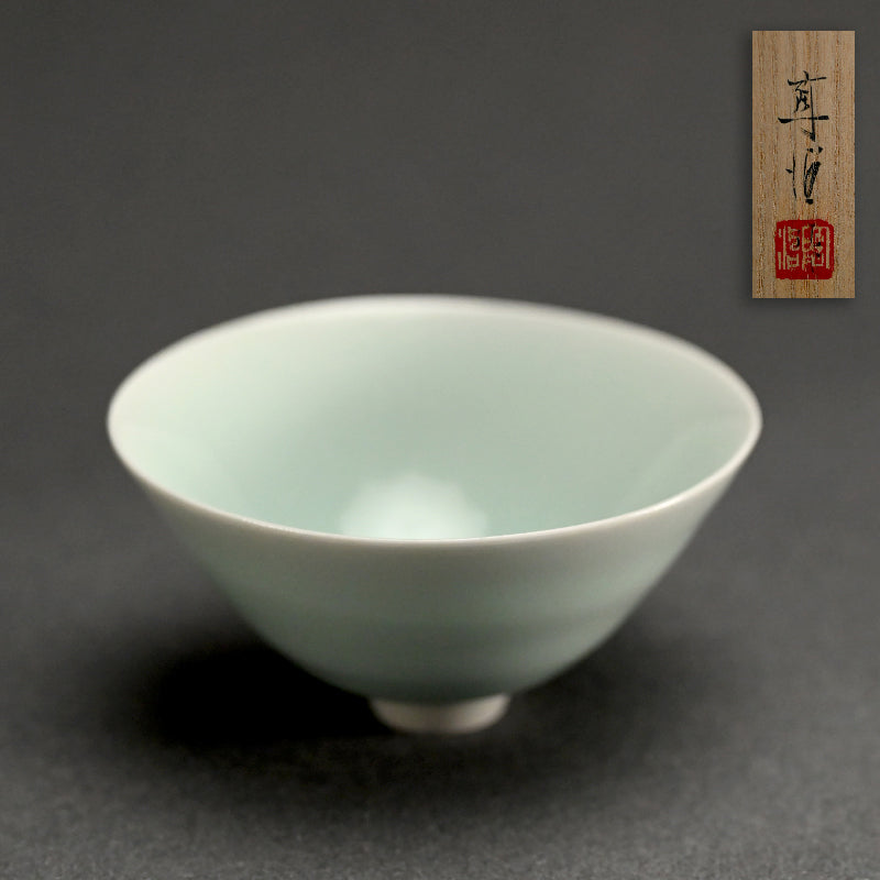 An exquisite inverted cone-shaped celadon sake cup supported by a tiny ring foot by Fukami Sueharu enclosed in the original signed wooden box titled Seihakuji Guinomi. It is 7.5 cm (3 inches), 4 cm (1-12 inches) tall and in perfect condition.