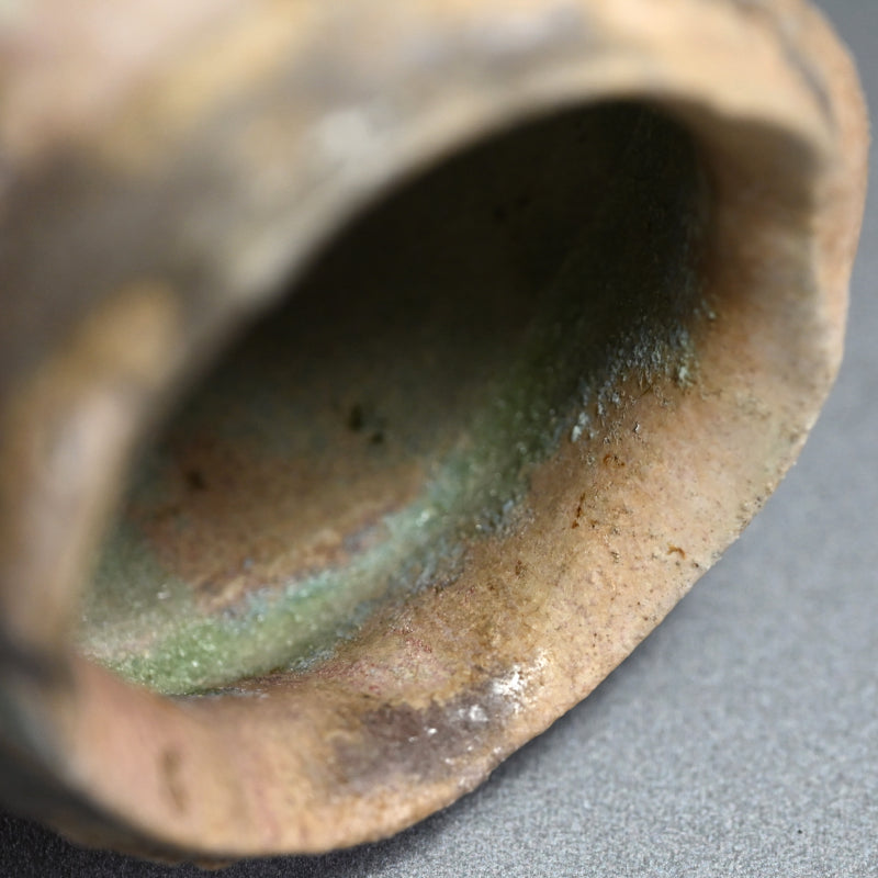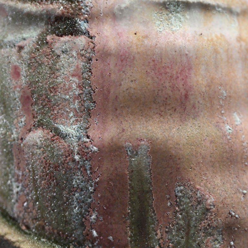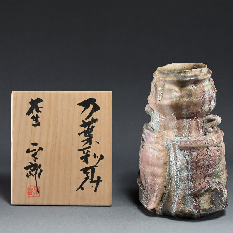 A spectacular crispy Tsubo by Hayashi Shotaro enclosed in the original signed wooden box titled Manyosai Mimitsuki Hanaike. This is the work that Shotaro may be best known, and is the only one able to acquire these colors. It is 25.5 cm (10 inches) tall, 17 x 14.5 cm (7 x 5-1/2 inches) across the base and in excellent condtion.