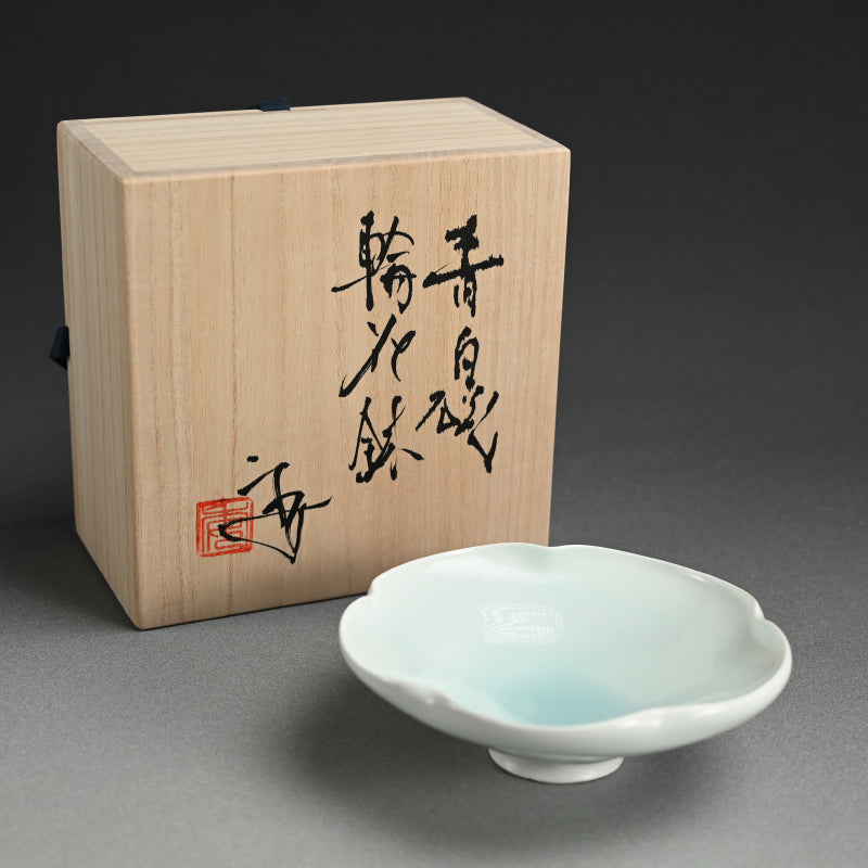 An elegant porcelain bowl in the traditional lobed Rinka Flower form by Kato Tsubusa enclosed in the original signed wooden box titled Seihakuji Rinka-bachi. It is 16.5 cm (6-1/2 inches) diameter, 6 cm 5-1/2 oinches) tall and in perfect condition, directly from the artist.