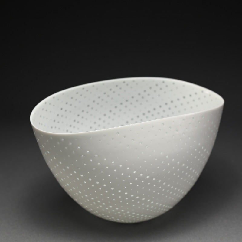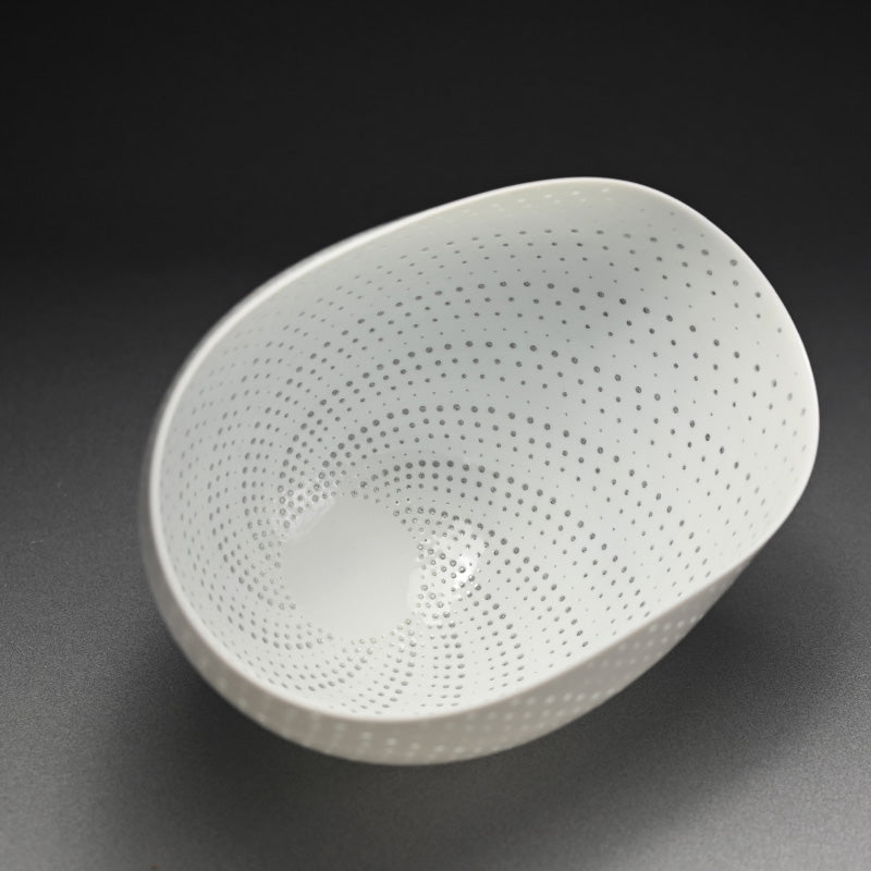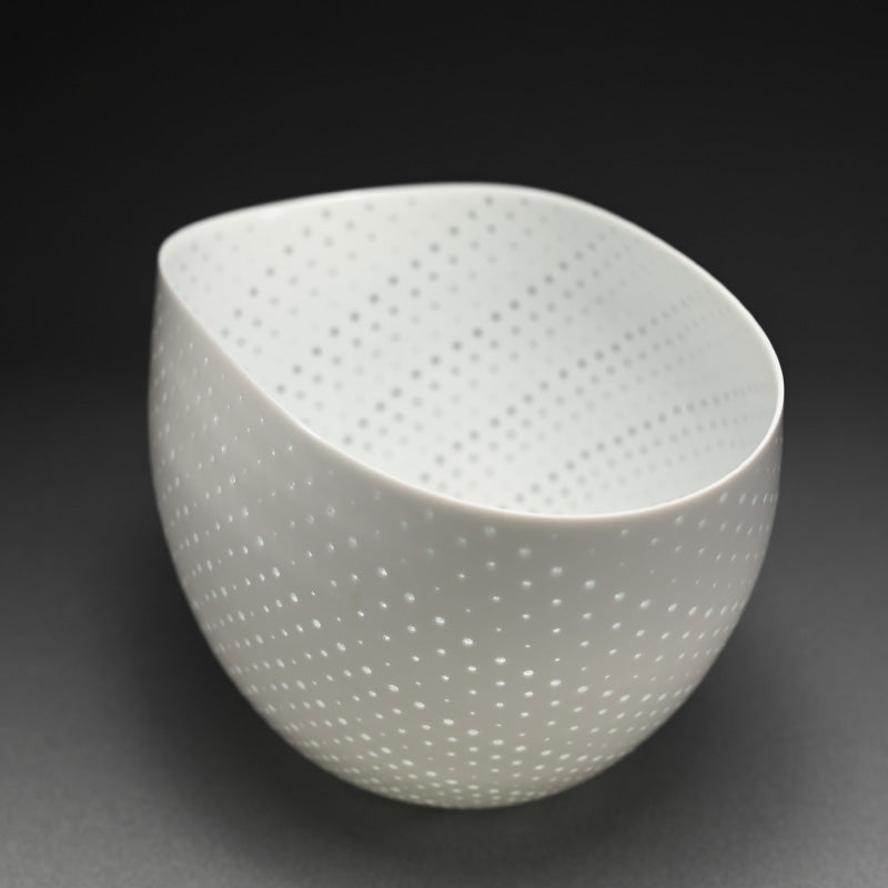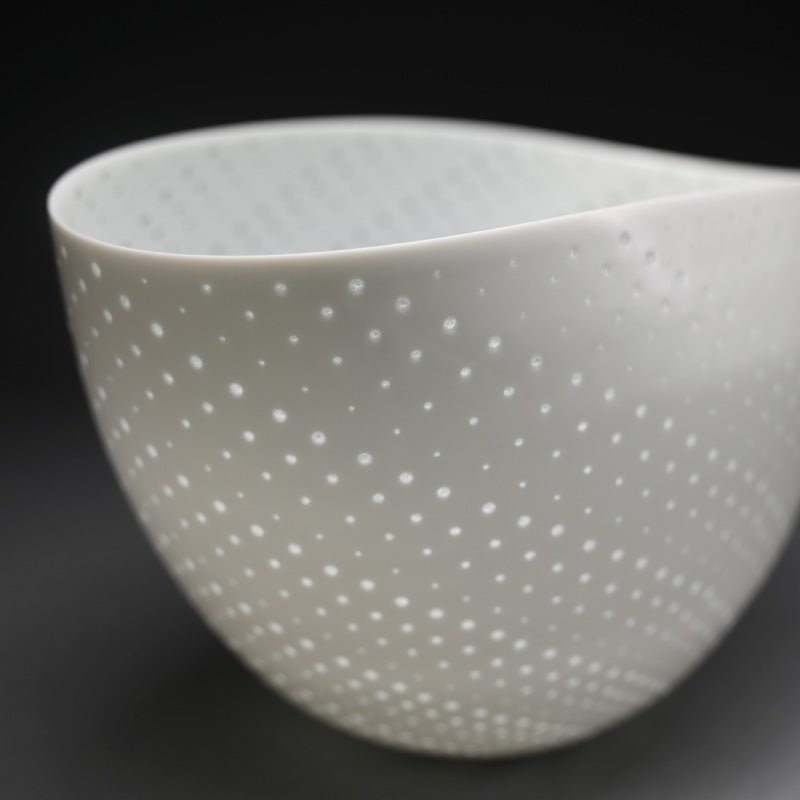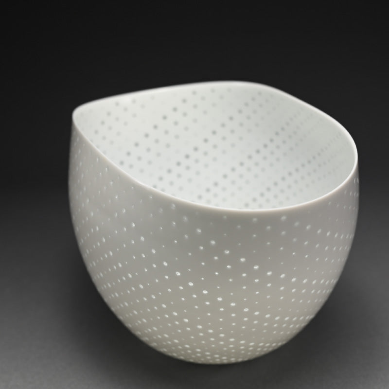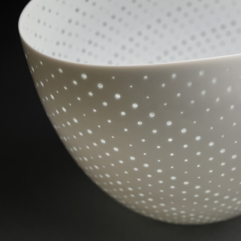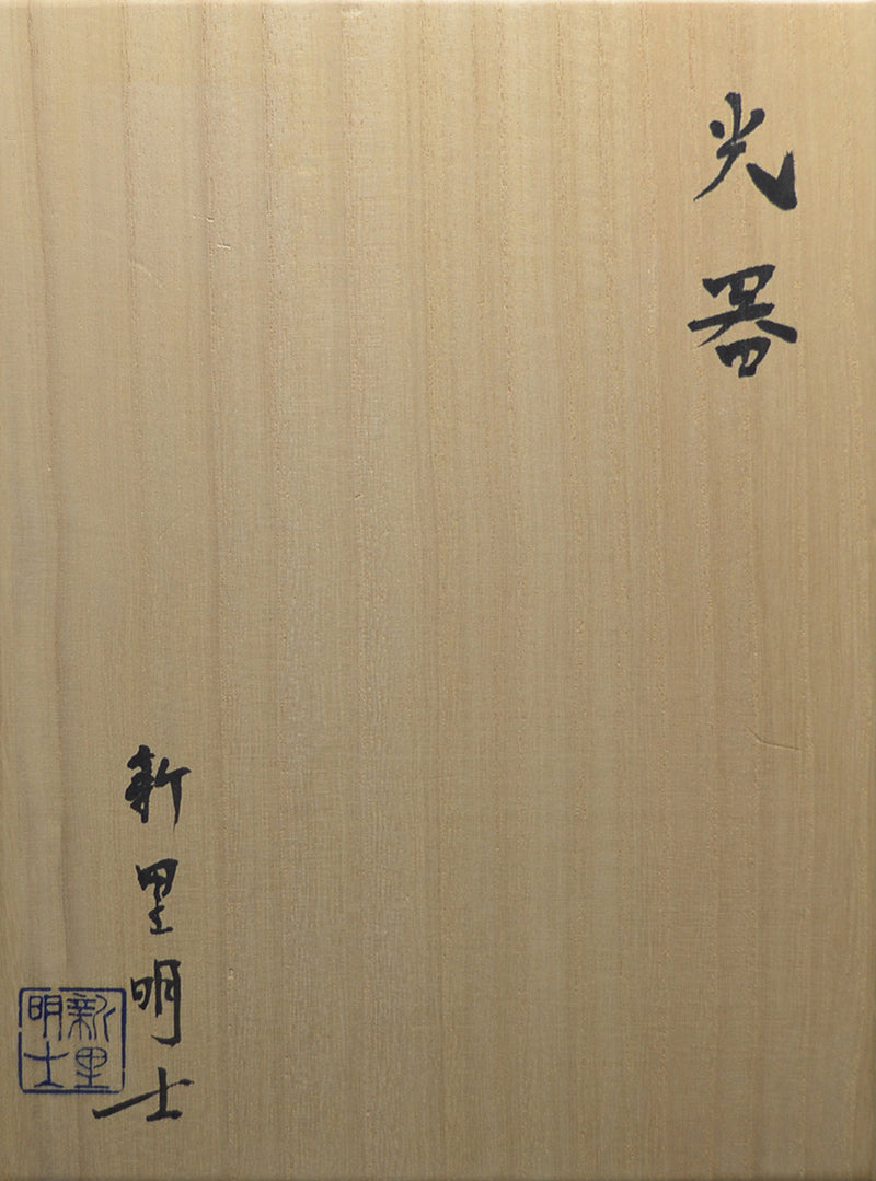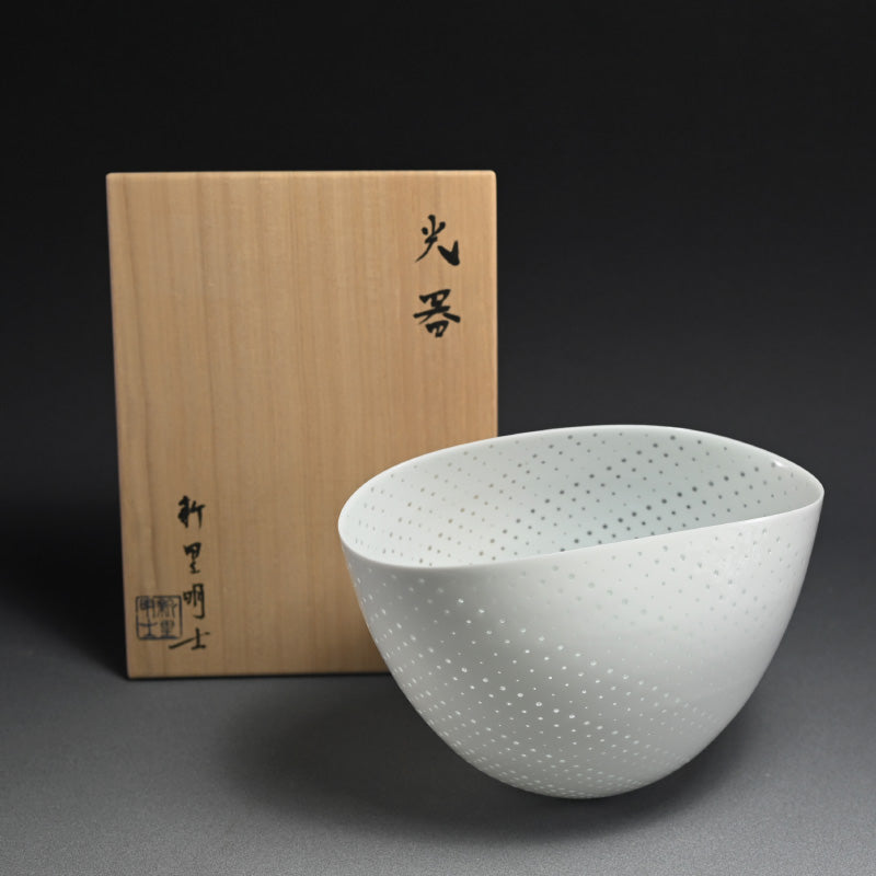 An incredibly delicate bowl of pierced white porcelain by Niisato Akio enclosed in the original sgned wooden bo titled Hikari Utsuwa. It is 23 x 16 x 14.5 cm (9 x 6-1/2 x 5-1/2 inches) and is in excellent condition.