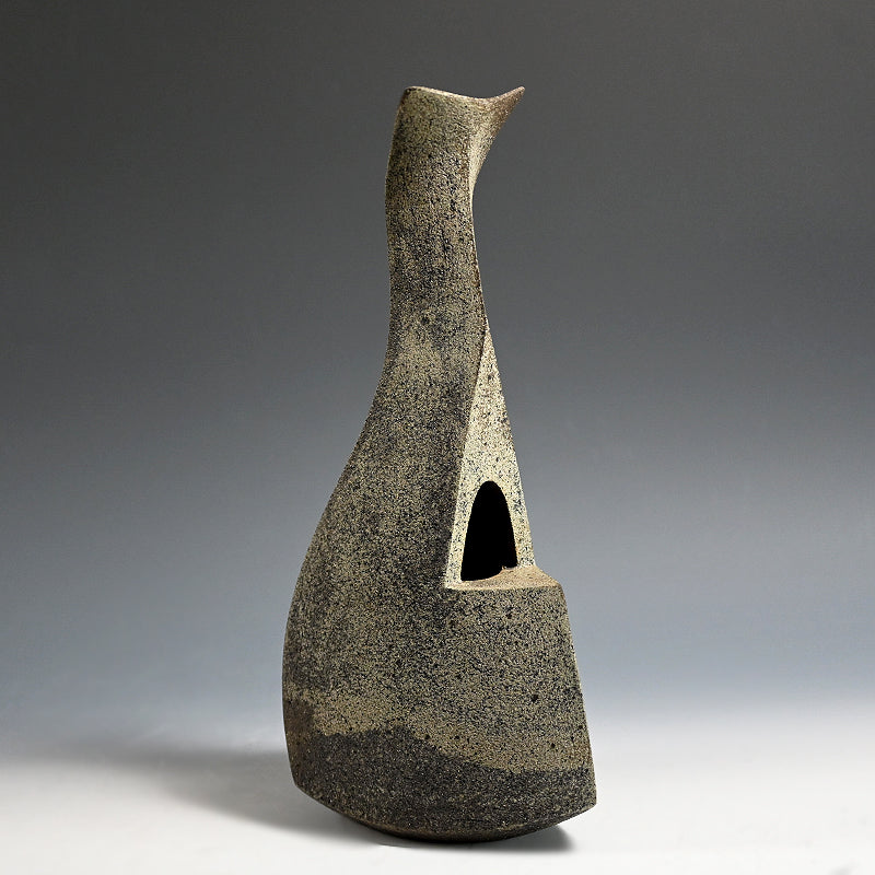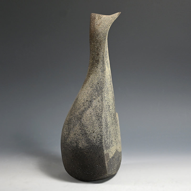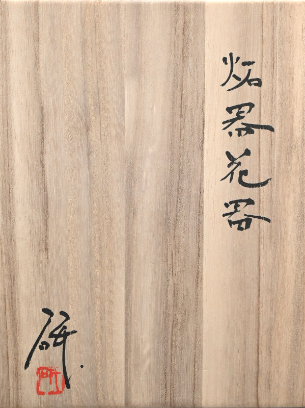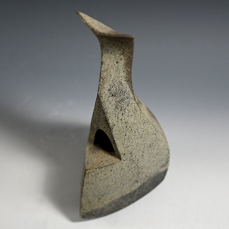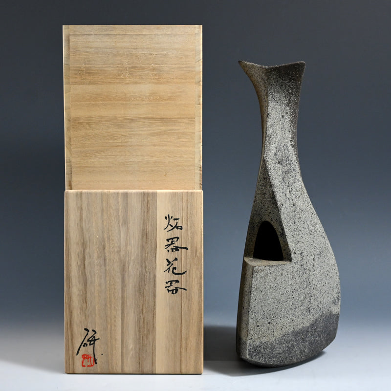 A pointed tower in burnt gray clay by Mihara Ken enclosed in the original signed wooden box titled Seki Kaki. Three slabs curvaceously rise to an unconventional horn, slotted on one side to accept a flower. A single camellia blossom in rich red, a few green leaves pitted against the gray body in the dark corner of a Tea Room would be incredible. It is 36.5 cm (14-1/2 inches) tall and in fine condition.