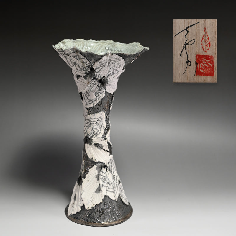 A tall trumpeting form by important contemporary potter Shingu Sayaka enclosed in the original signed wooden box. It is 16.5 cm (6-1/2 inches) diameter, 32.5 cm (13 inches) tall and is in excellent condition, directly from the artist.