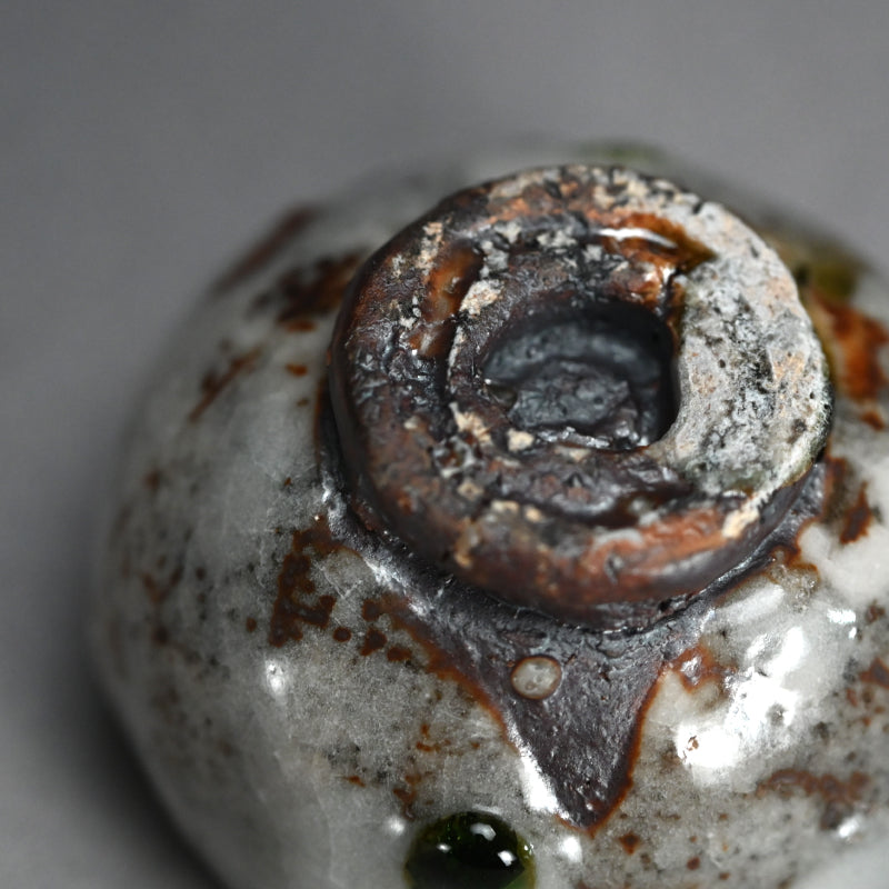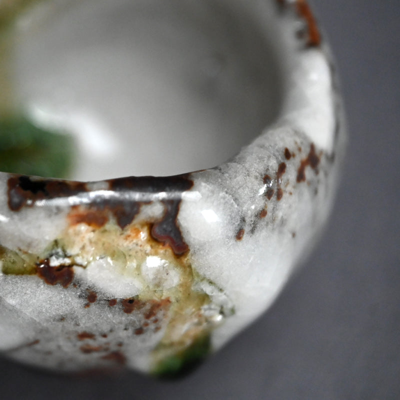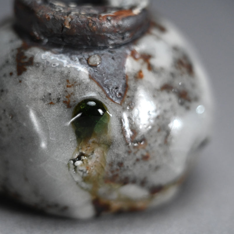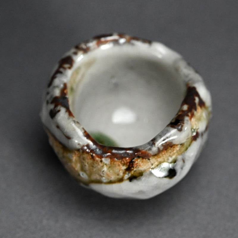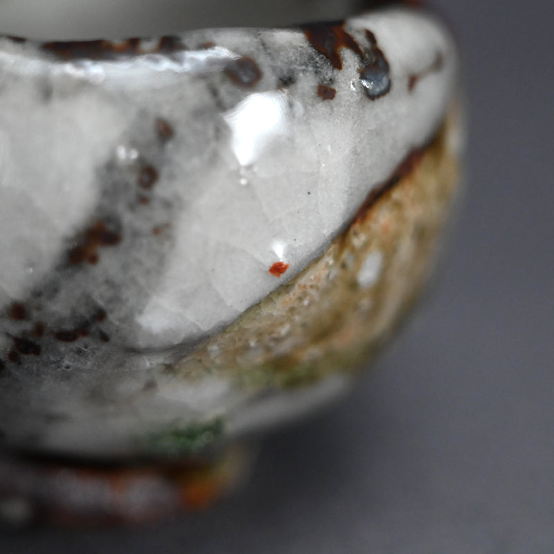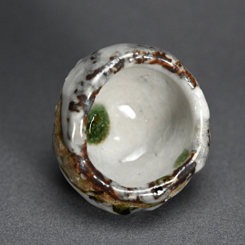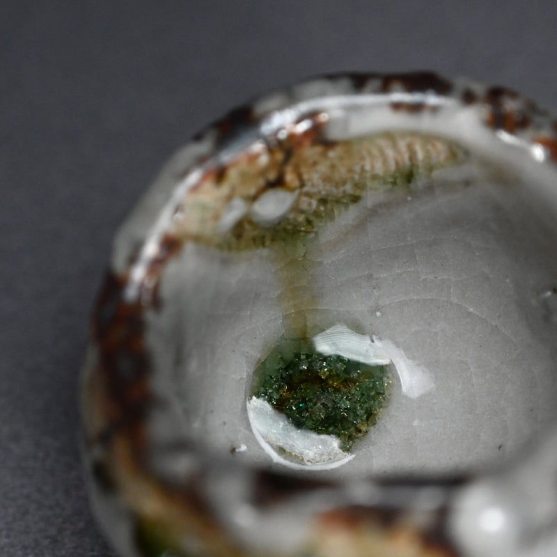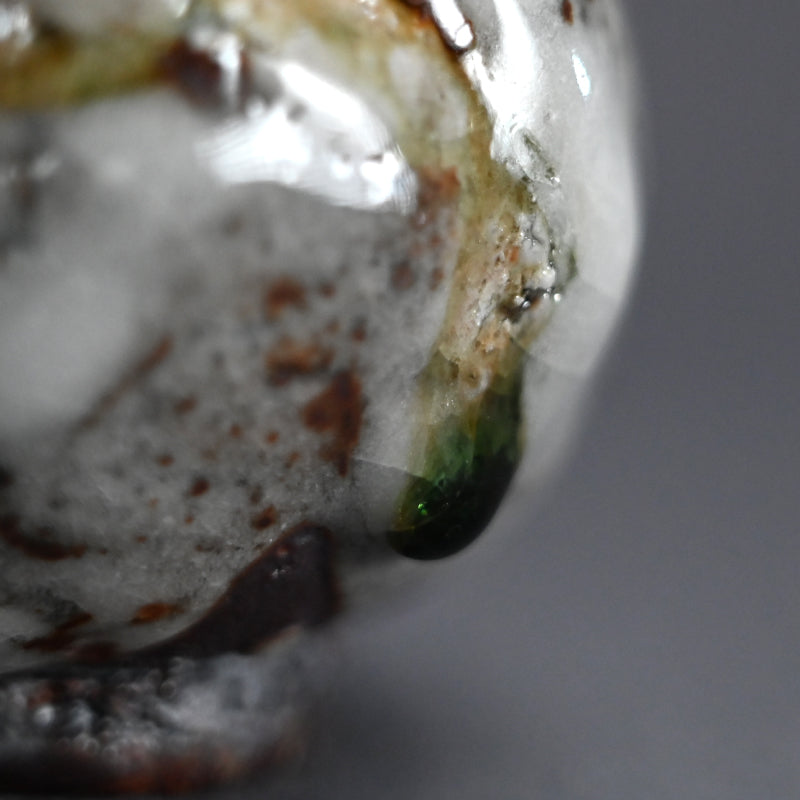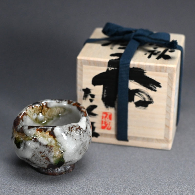 One of the great joys of drinking sake is the act of filling the glass. There is plenty of time for that with this gorgeous little gem by Murakoshi Takuma covered in his signature Shunju glaze enclosed in the original signed wooden box titled Shunju Guinomi. It is thick and low, a bowl not easily be spilled, with a single emerald drop inside which will glisten in the precious clear liquid. The cup is 7 cm (just less than 3 inches) diameter, 5.5 cm (2 inches) tall and in perfect condition, directly from the artist this year.