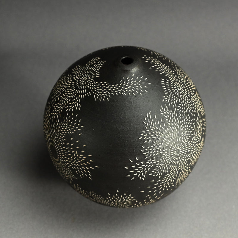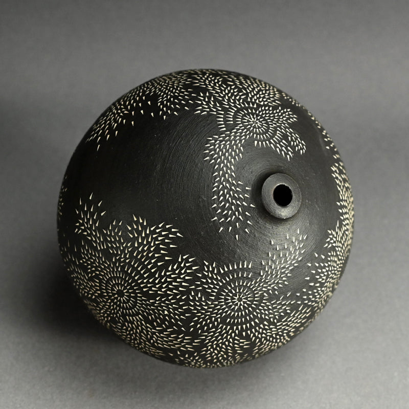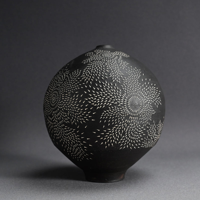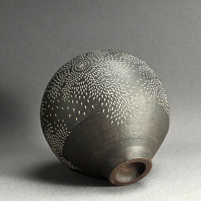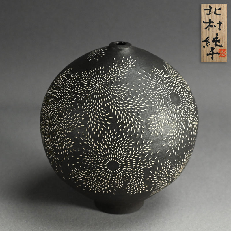 Kitamura Junko (b. 1956, Kyoto) is a celebrated contemporary Japanese ceramic artist known for her intricate slip-inlay decoration inspired by 15th-century Korean Buncheong ware. A graduate of Kyoto City University of Art, where she studied under Suzuki Osamu and Kondō Yutaka. Like Mashiko artist Shimaoka Tatsuzo, her work is influenced by Jomon pottery, however her approach is very different. She employs a hand-carved bamboo tool to impress delicate geometric and dot patterns into dark stoneware, inlaying them with creamy white slip to create luminous, textile-like surfaces. The daughter of an abstract painter, Kitamura blends painterly sensibility with rigorous craftsmanship, producing vessels of refined form and mesmerizing detail. Works by the artist are held in many public collections, including the National Museum of Modern Art, Tokyo; the Boston Museum of Fine Arts, British Museum, Brooklyn Museum of Art, Houston Museum of Art, New York Metropolitan Museum of Art, Musée Guimet in Paris and San Francisco Asian Art Museum among many others.
