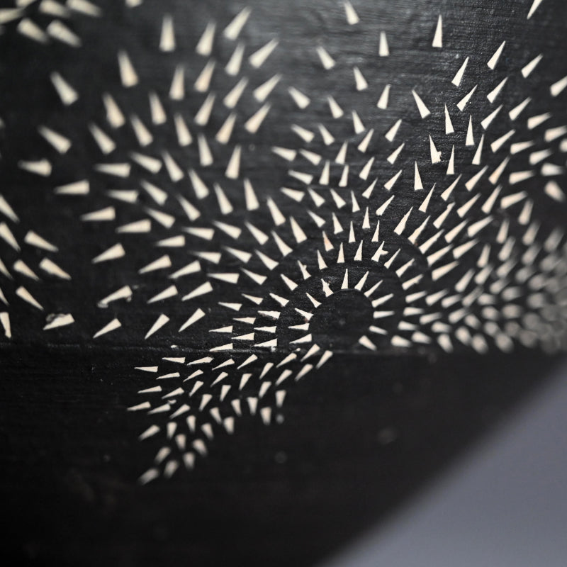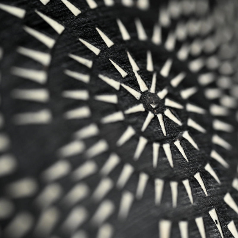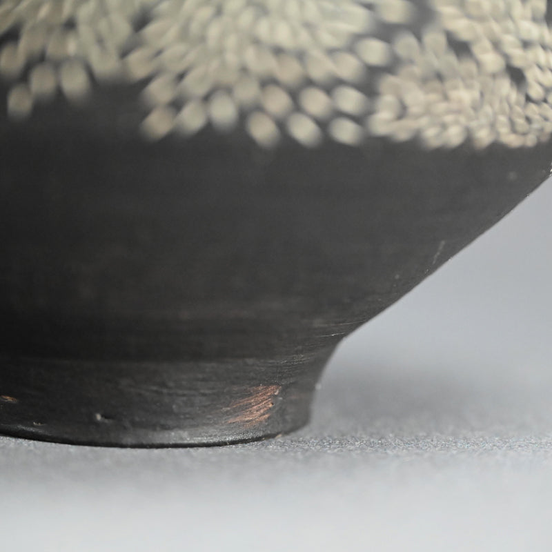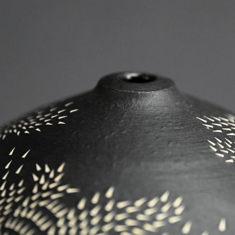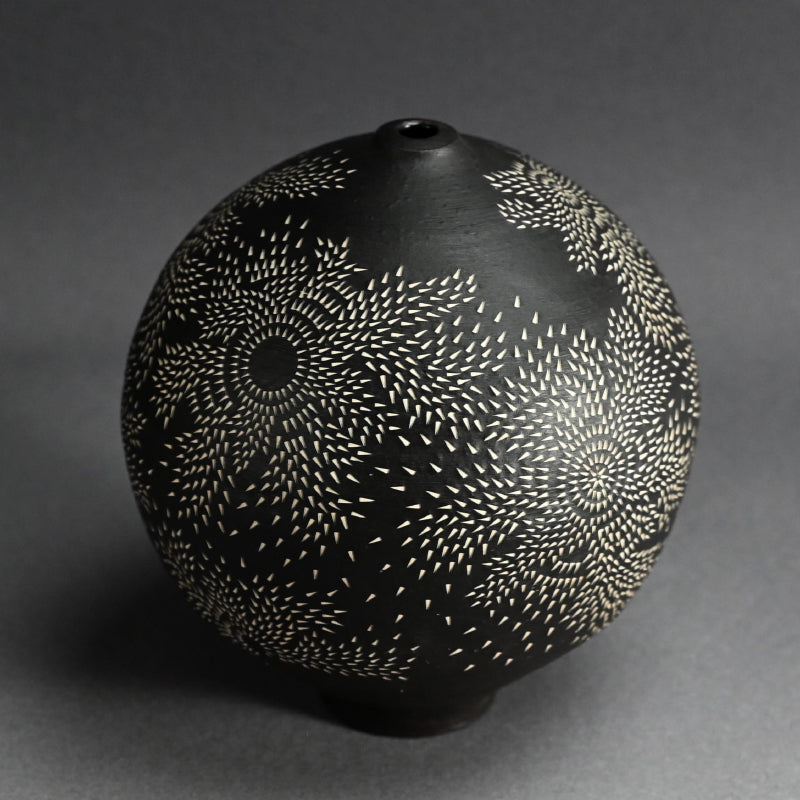 Kitamura Junko (b. 1956, Kyoto) is a celebrated contemporary Japanese ceramic artist known for her intricate slip-inlay decoration inspired by 15th-century Korean Buncheong ware. A graduate of Kyoto City University of Art, where she studied under Suzuki Osamu and Kondō Yutaka. Like Mashiko artist Shimaoka Tatsuzo, her work is influenced by Jomon pottery, however her approach is very different. She employs a hand-carved bamboo tool to impress delicate geometric and dot patterns into dark stoneware, inlaying them with creamy white slip to create luminous, textile-like surfaces. The daughter of an abstract painter, Kitamura blends painterly sensibility with rigorous craftsmanship, producing vessels of refined form and mesmerizing detail. Works by the artist are held in many public collections, including the National Museum of Modern Art, Tokyo; the Boston Museum of Fine Arts, British Museum, Brooklyn Museum of Art, Houston Museum of Art, New York Metropolitan Museum of Art, Musée Guimet in Paris and San Francisco Asian Art Museum among many others.