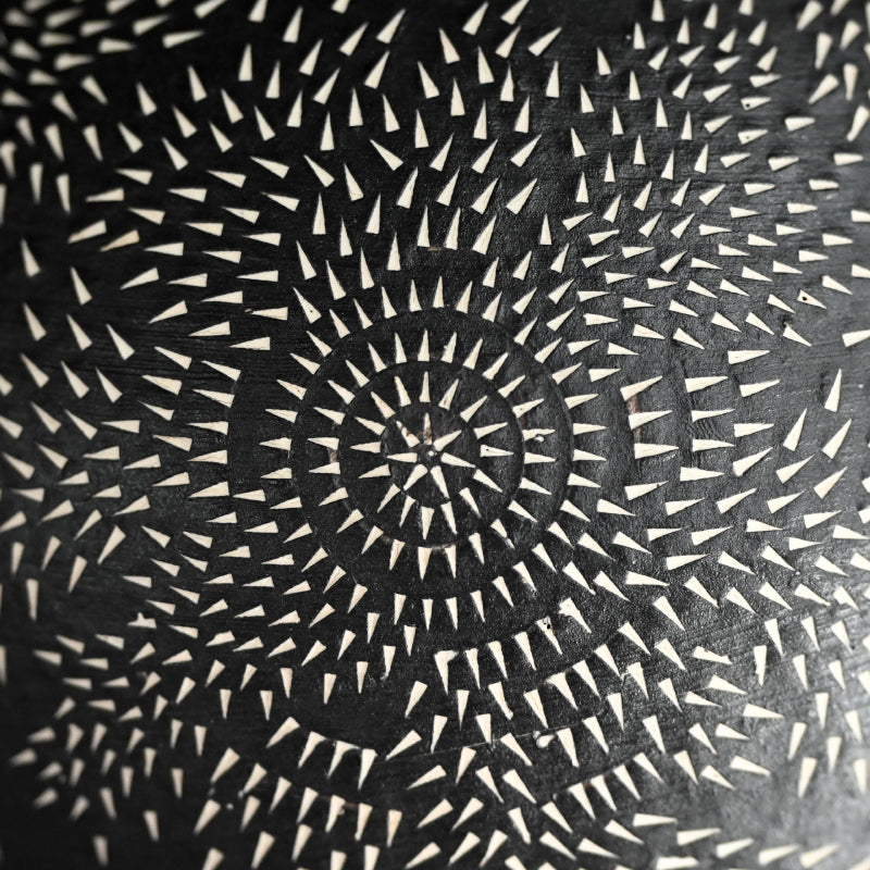Aboriginal designs are inlayed into the dark surface of this orb by important contemporary female artist Kitamura Junko enclosed in the original signed wooden box titled simply Hanaire.  It is 17 cm (7 inches) diameter, 19 cm (7-1/2 inches) tall and in excellent condition.