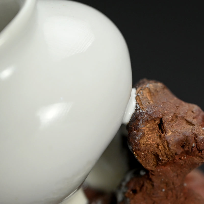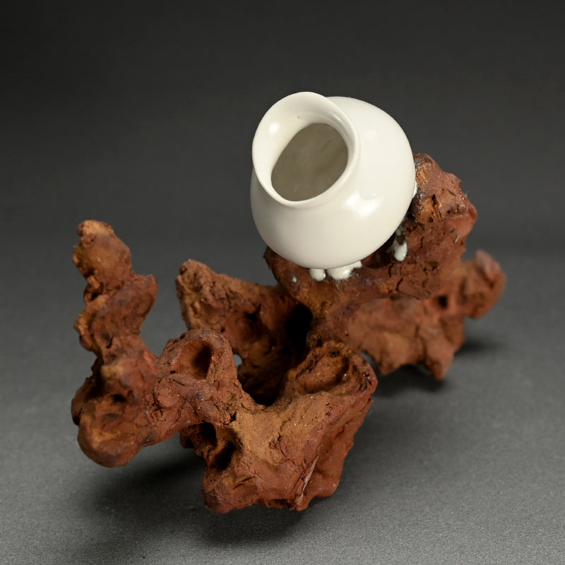 This series began with my graduation exhibition at the Design Institute. The different textures (the rugged base and the soft white vase) are fired separately and then glazed during the firing process to unite them.