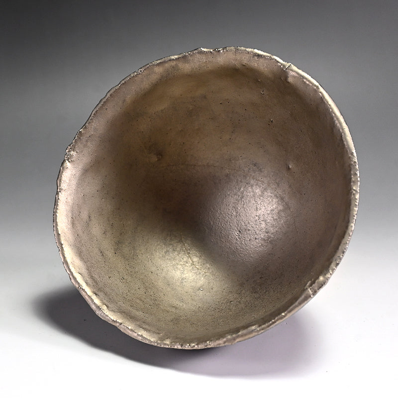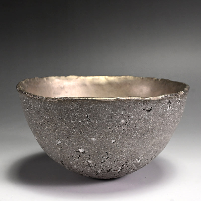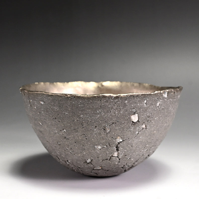 The inside of this bowl has been glazed, the exterior left in raw clay before the entire was dipped in white gold, creating a stark contrast between inner and outer surfaces by Ogawa Machiko enclosed in the original signed wooden box titled Hakukinsai Hachi. It is 14.5cm (just under 6 inches) wide 8cm (3-1/4 inches) tall and in excellent condition.