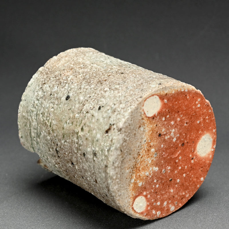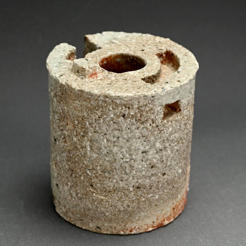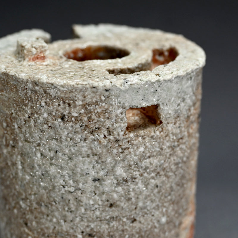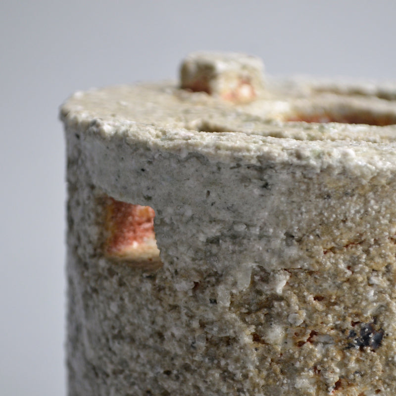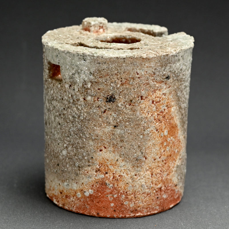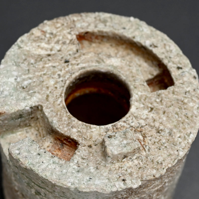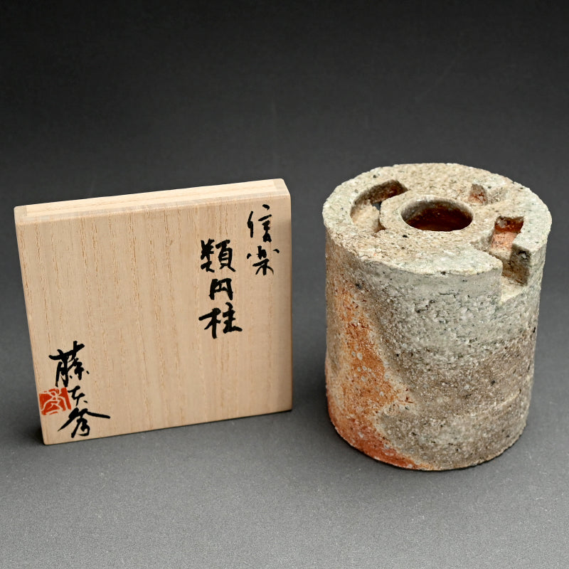 A mysterious carved cylinder of beautifully textured Shigaraki clay displaying HI-iro flame colors, light charring and a light dusting of flying pine ash by Fujimoto Hide enclosed in the original signed wooden box titled Shigaraki Tagui Enchu (Round Pilar). 13.5 cm (5-1/2 inches) diameter, 16 cm (6-1/4 inches) tall and in perfect condition, directly from the artist.