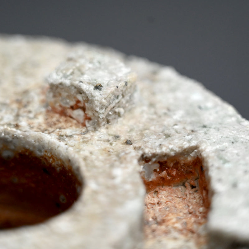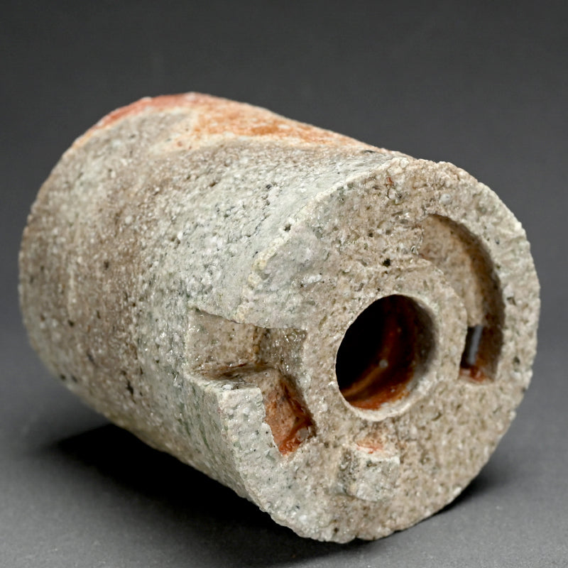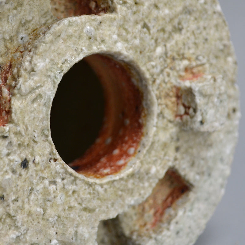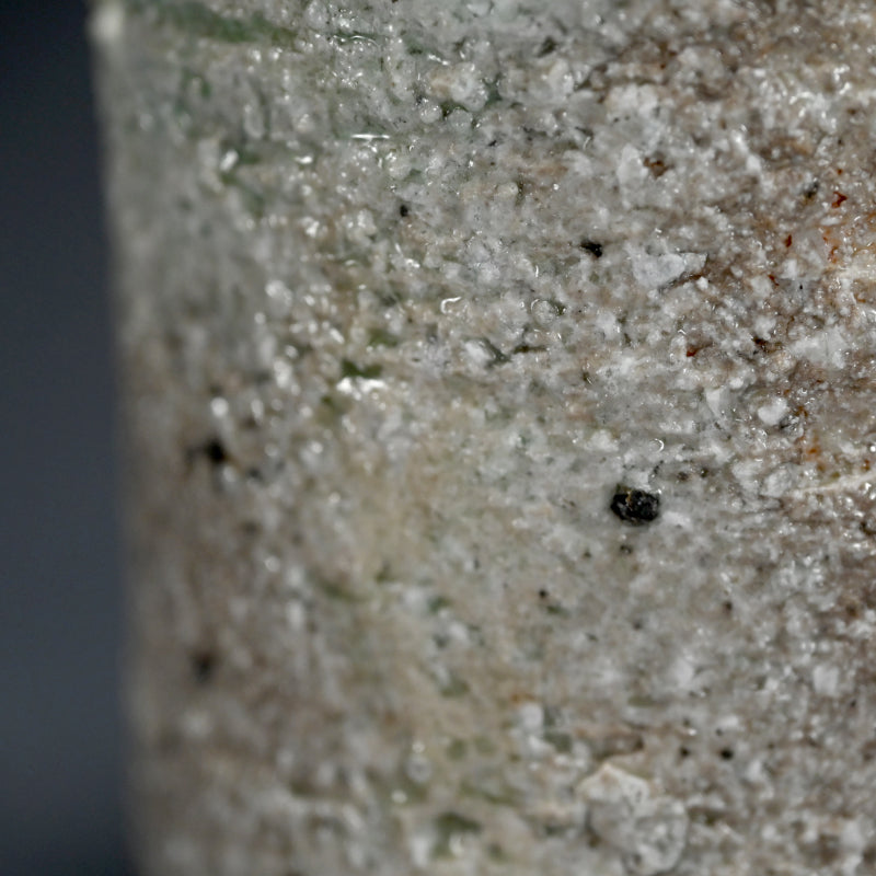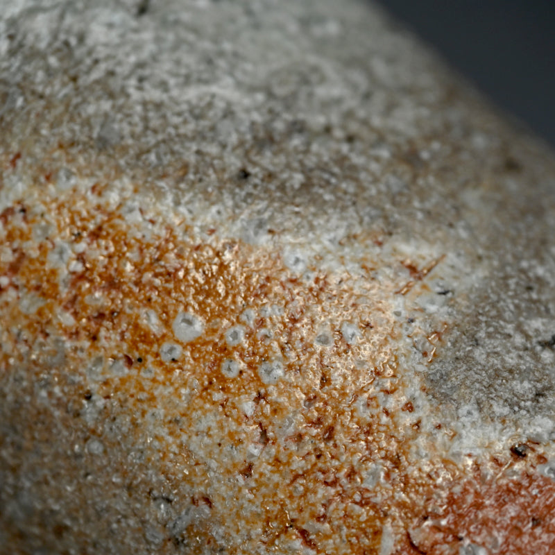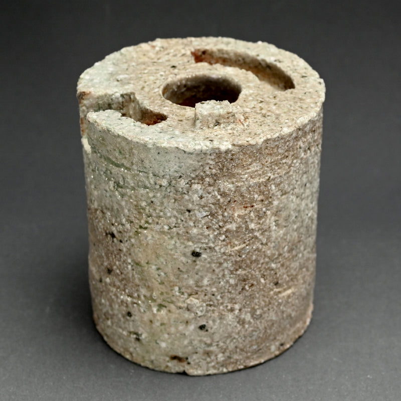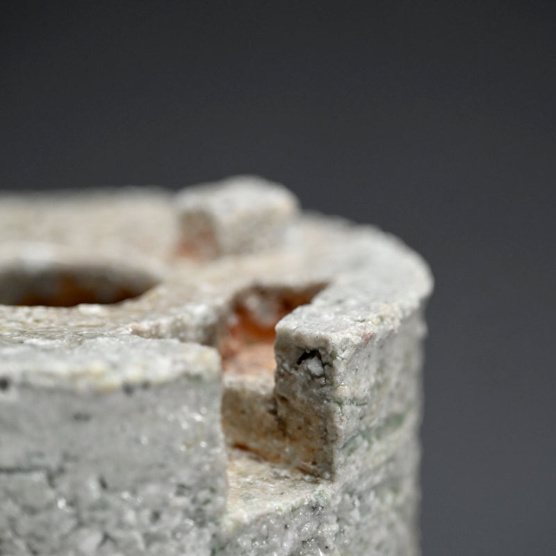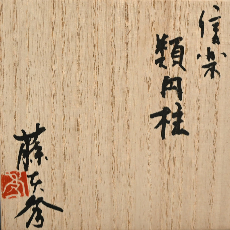 A mysterious carved cylinder of beautifully textured Shigaraki clay displaying HI-iro flame colors, light charring and a light dusting of flying pine ash by Fujimoto Hide enclosed in the original signed wooden box titled Shigaraki Tagui Enchu (Round Pilar). 13.5 cm (5-1/2 inches) diameter, 16 cm (6-1/4 inches) tall and in perfect condition, directly from the artist.