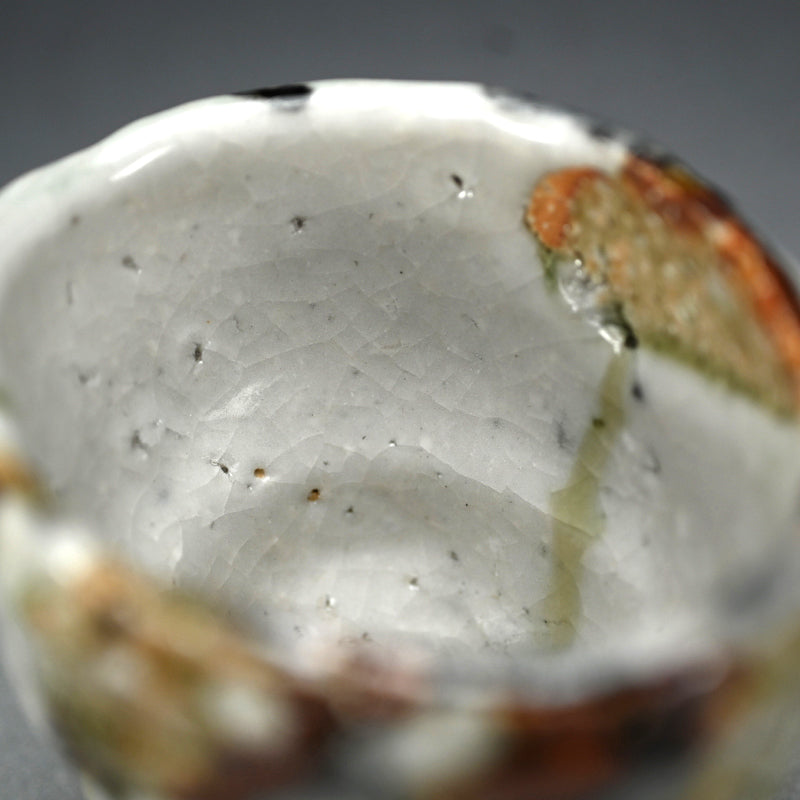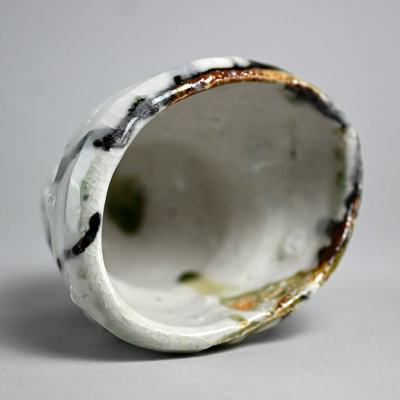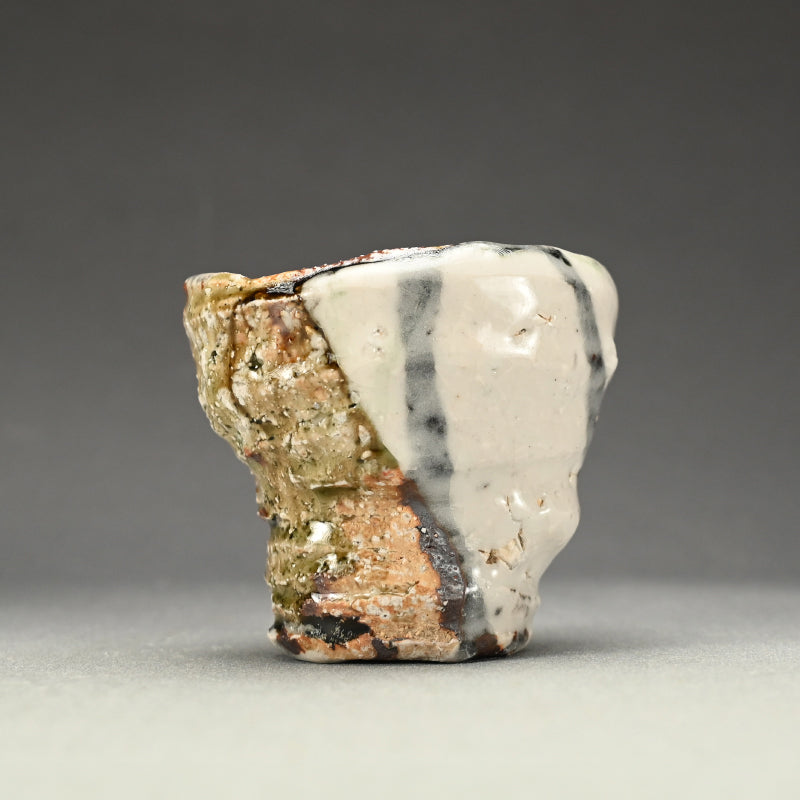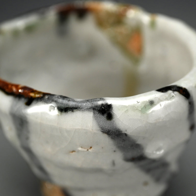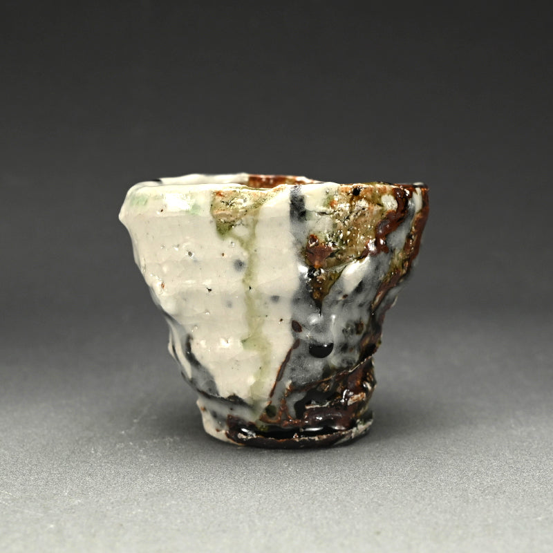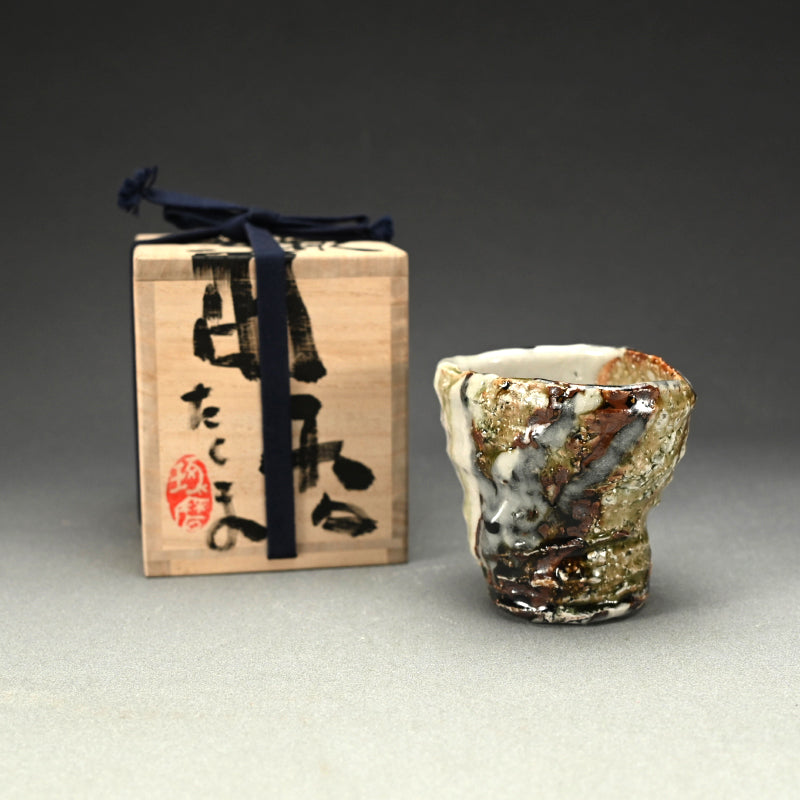 Not just for alcohol, this is perfect for winter tea, a beautifully formed deep cup covered in tri-colored glaze occasionally revealing the rough clay beneath by Murakoshi Takuma enclosed in the original signed wooden box titled Shunju Shochu-nomi. Literally translated Shunju is Spring and Fall, a phrase denoting all the colors of the seasons, and it is the term he has chosen to poetically describe the various colorations of his work. This cup is 12 x 9.5 x 9.5 cm (5 x 4 x 4 inches) and is in excellent condition, directly from the artist.
