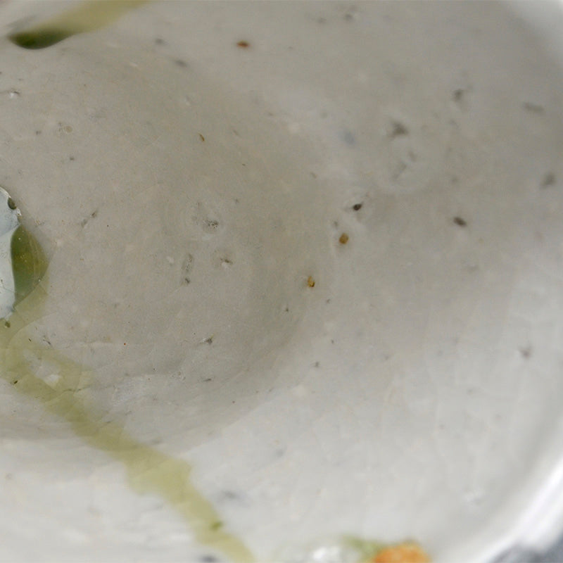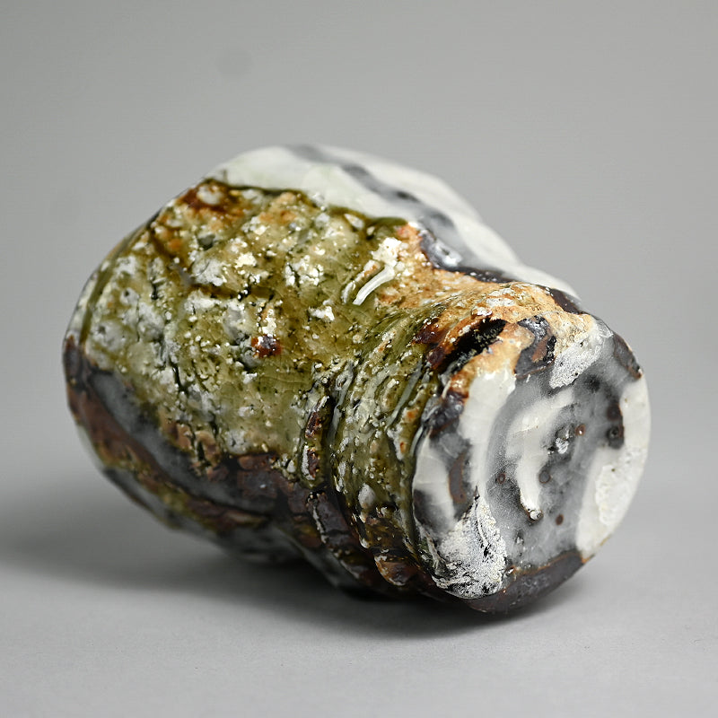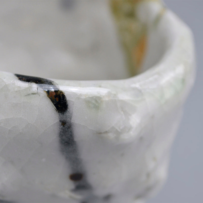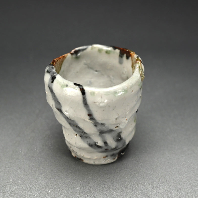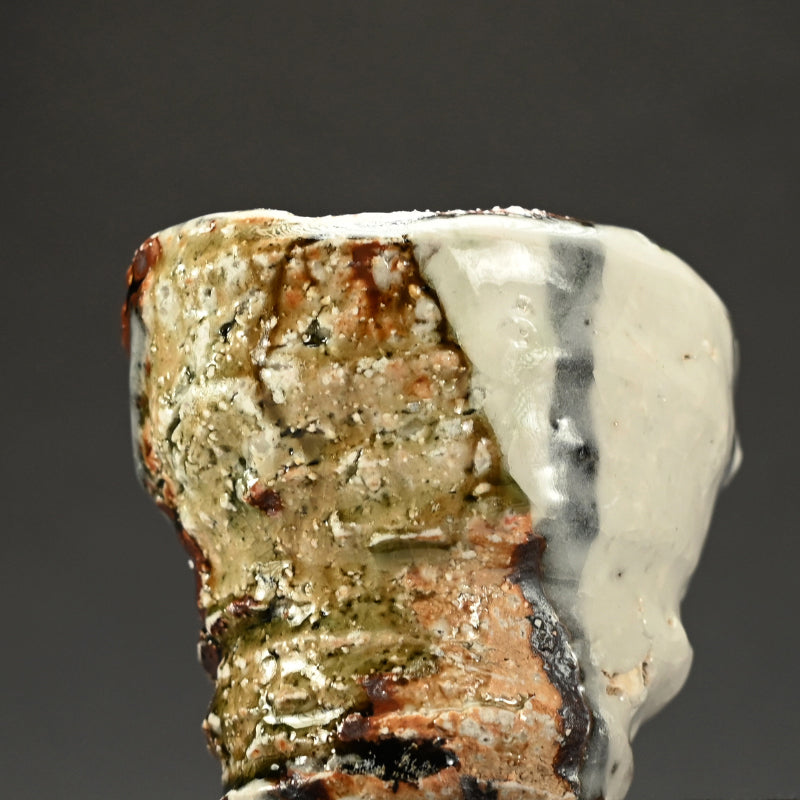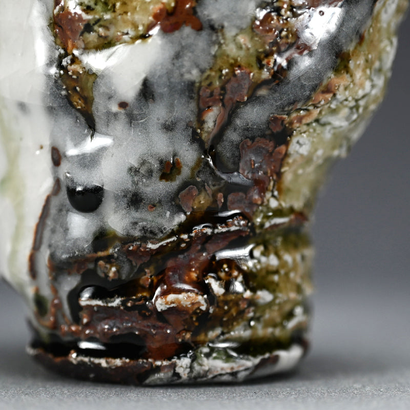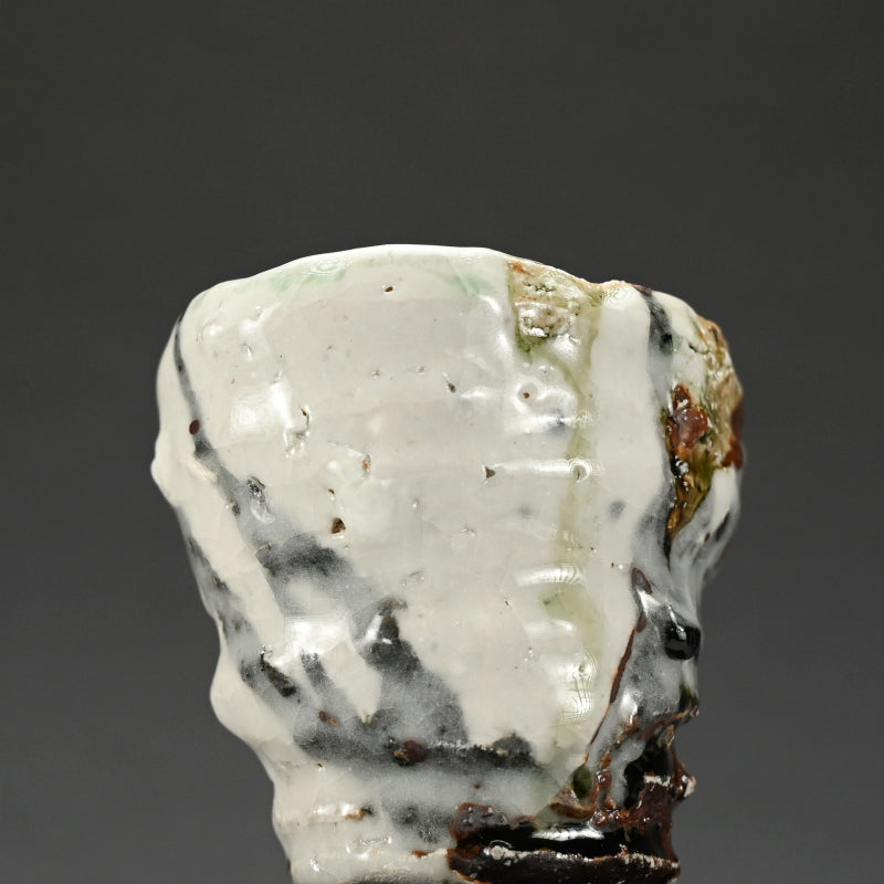 Not just for alcohol, this is perfect for winter tea, a beautifully formed deep cup covered in tri-colored glaze occasionally revealing the rough clay beneath by Murakoshi Takuma enclosed in the original signed wooden box titled Shunju Shochu-nomi. Literally translated Shunju is Spring and Fall, a phrase denoting all the colors of the seasons, and it is the term he has chosen to poetically describe the various colorations of his work. This cup is 12 x 9.5 x 9.5 cm (5 x 4 x 4 inches) and is in excellent condition, directly from the artist.