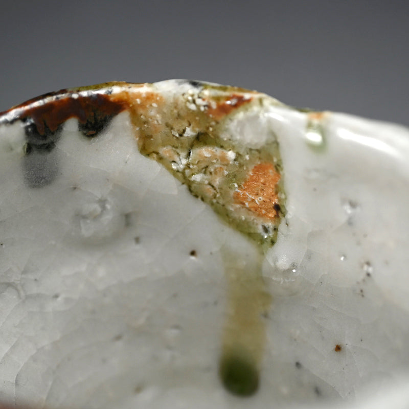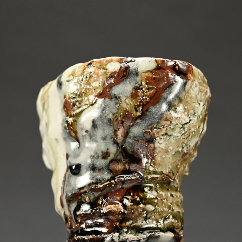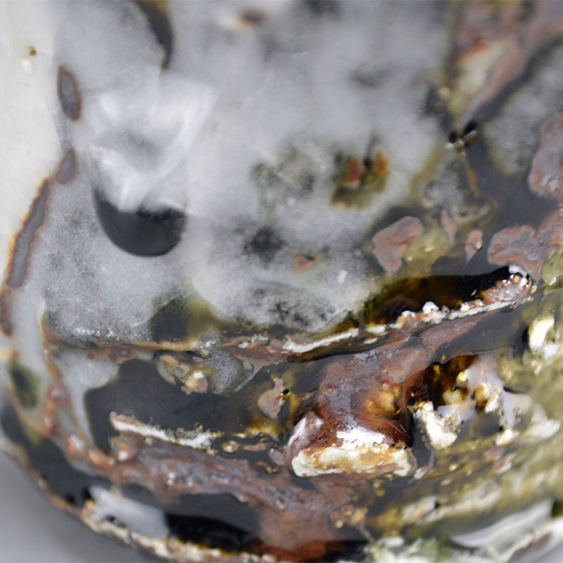Murakoshi Takuma is one of those enigmas who simply lives to work with clay. He does not seek to make a living through pottery, but through his primal approach has earned a following which keeps his work in high demand. He was born in Aichi prefecture in 1954 and began his stroll down the pottery path in 1980 under the tutelage of Kyoto potter Umehara Takehira. Favoring very rough Shigaraki glaze, he established his own kiln in 1997 in the Kiyomizu pottery district of Kyoto, then moved to Nagaoka in 2002. Although eschewing the world of competitive exhibitions, he has been picked up by many of Japan’s preeminent galleries, including private exhibitions at the prestigious Kuroda Toen of Tokyo’s Ginza District.