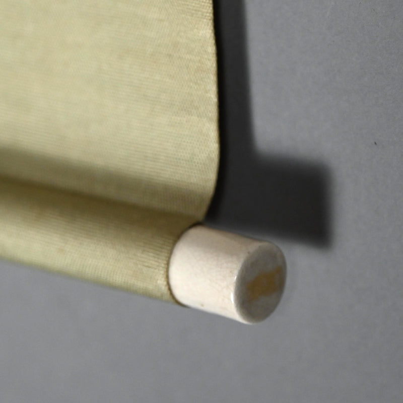 Lurid Umbrella-shaped hills float like clouds beyond a lone sage standing in contemplation of the rain under a tree rendered in wet washes among a cluster of huts on this small delicate image by Fukuda Kodojin. Ink on paper in the original patterned silk border with white glazed ceramic rollers. The pale ichimonji patterned with clouds accentuates the scene. It is 24.5 x 158 cm (10 x 62-1/4 inches) and in overall fine condition.