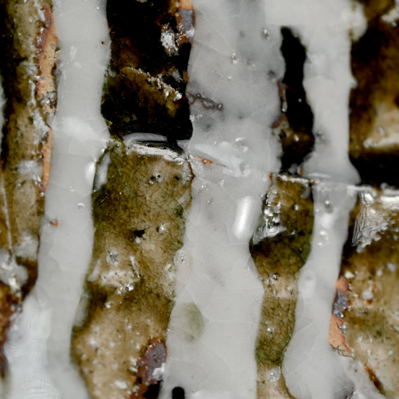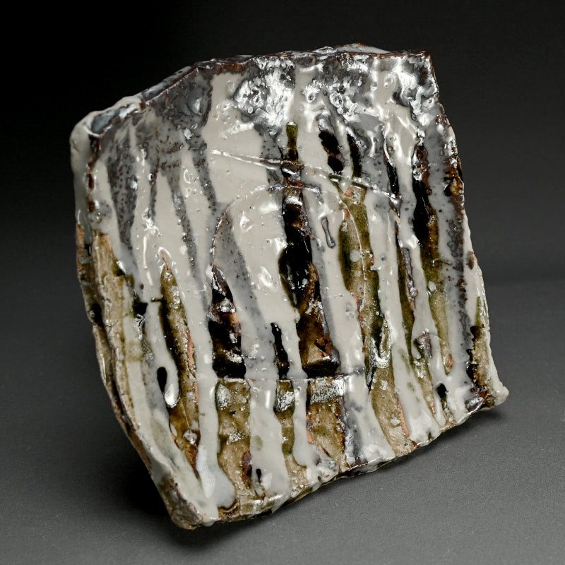 A lot is happening on this beautiful square platter with upturned edges by Murakoshi Takuma covered in his signature Shunju Glaze combination of Kunugi ash, feldspar and iron. It is 29 x 30 x 7.5 cm (roughly 12 inches square, 3 inches tall) and is in excellent condition, directly from the artist this winter. It comes in the origialn signed wooden box titled Shunju Rokuro Kakuzara.