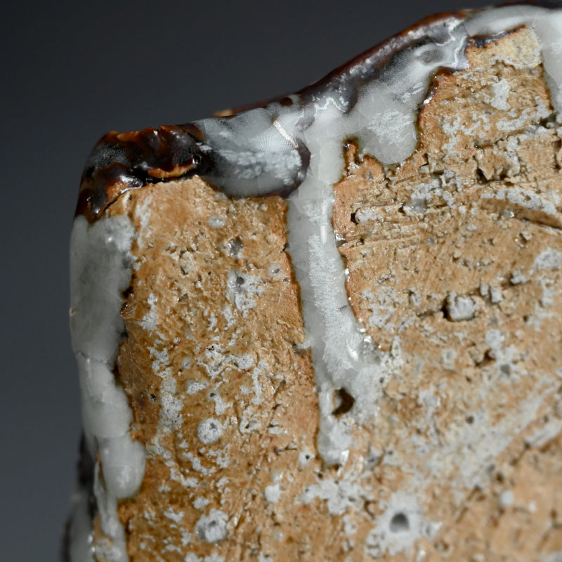 Murakoshi Takuma is one of those enigmas who simply lives to work with clay. He does not seek to make a living through pottery, but through his primal approach has earned a following which keeps his work in high demand. He was born in Aichi prefecture in 1954 and began his stroll down the pottery path in 1980 under the tutelage of Kyoto potter Umehara Takehira. Favoring very rough Shigaraki glaze, he established his own kiln in 1997 in the Kiyomizu pottery district of Kyoto, then moved to Nagaoka in 2002. Although eschewing the world of competitive exhibitions, he has been picked up by many of Japan’s preeminent galleries, including private exhibitions at the prestigious Kuroda Toen of Tokyo’s Ginza District.