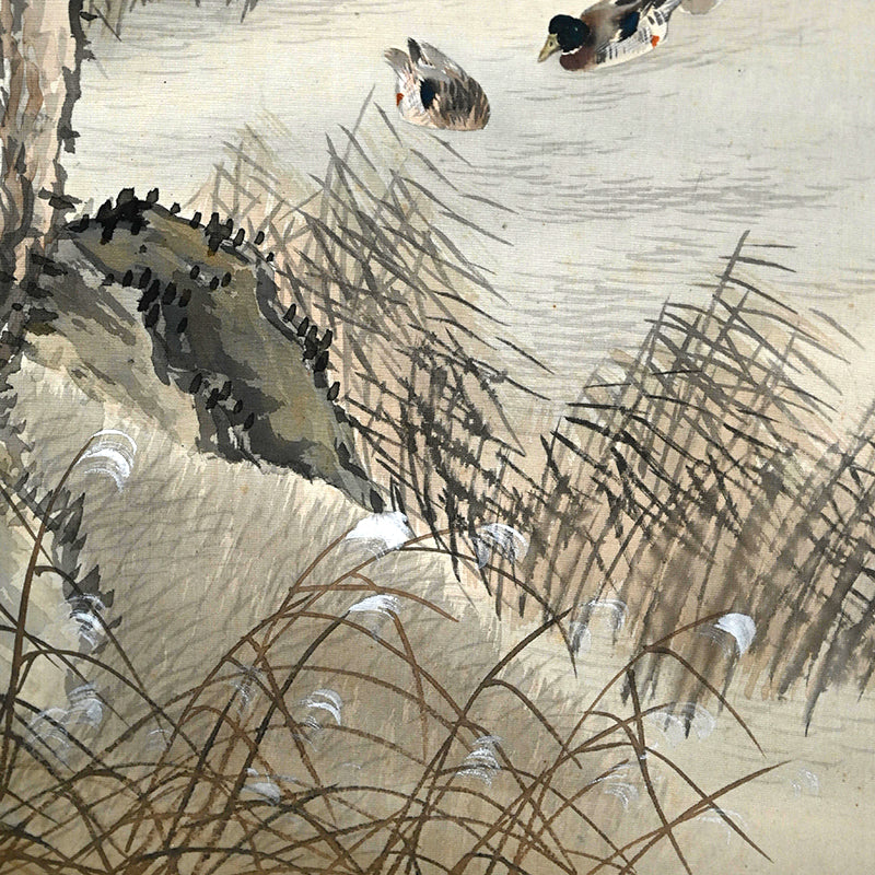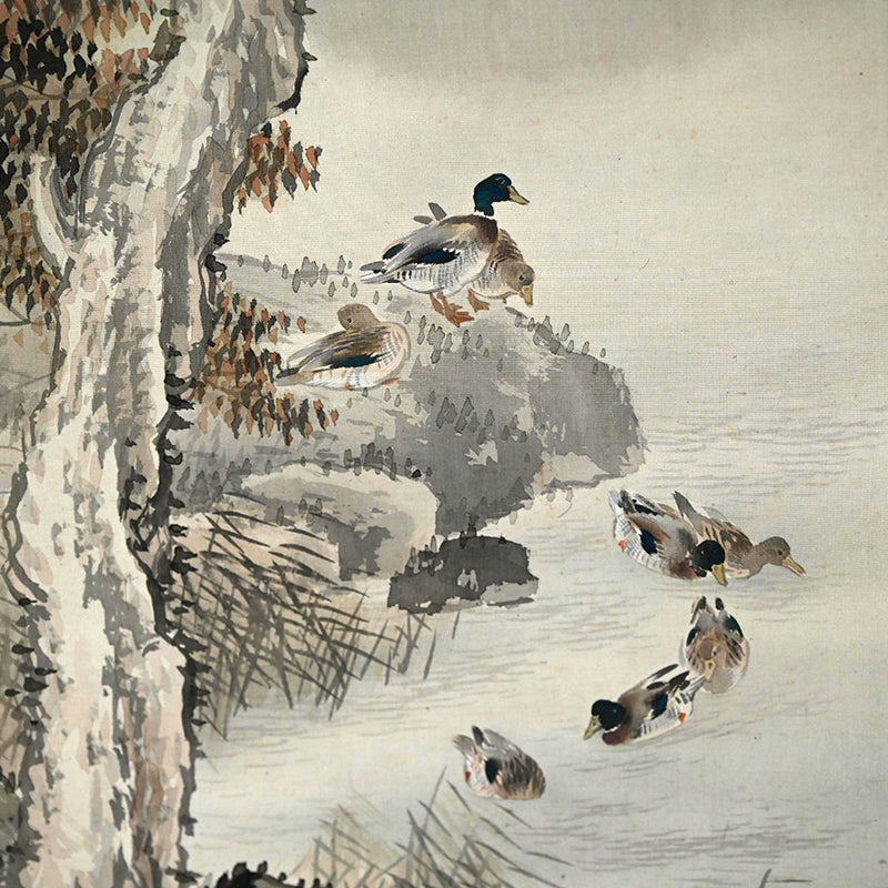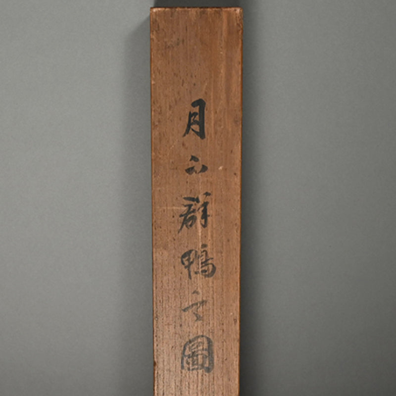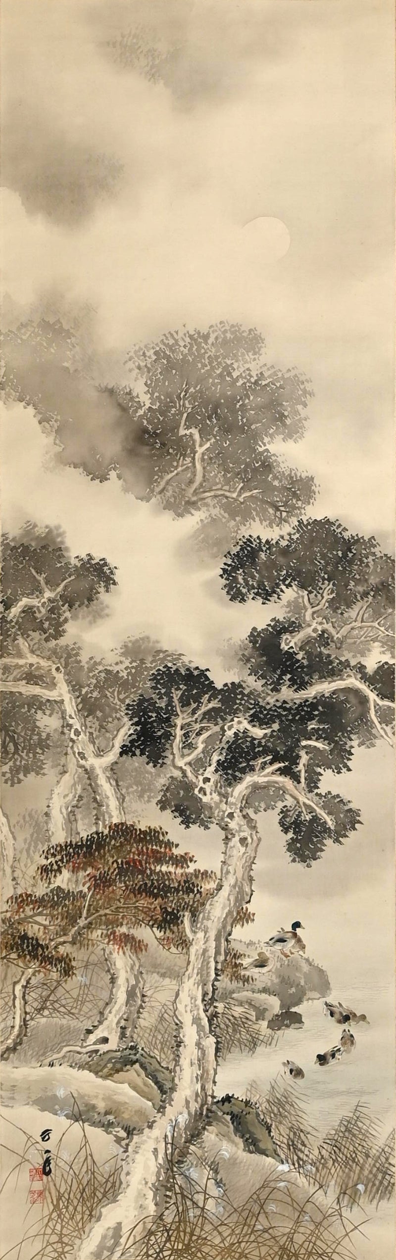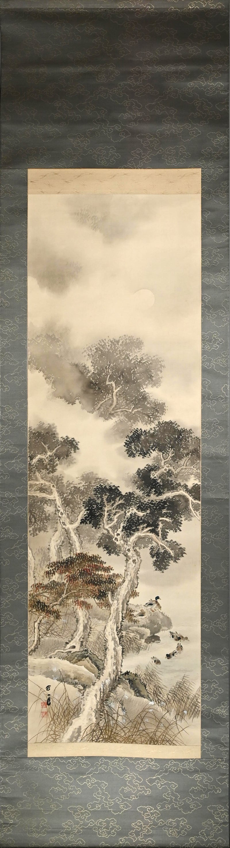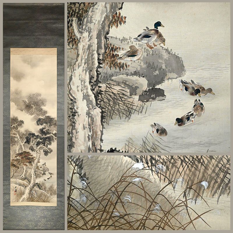 The moon rises high, piercing the misty, cloud laden autumn sky to illuminate a raft of ducks returning to Japan from their summer in Siberia sheltered in the lee of a river bank under the comforting boughs of gnarled trees. Pigment on silk in a superb border of gray silk the color of evening-sky patterned with ripples with an ichimonji of water-skippers on pale white and solid ivory rollers. The scroll is 56 x 210 cm (22 x 83 inches) and in excellent condition. It comes enclosed in the original signed wooden box dated 1917 (Taisho 6).