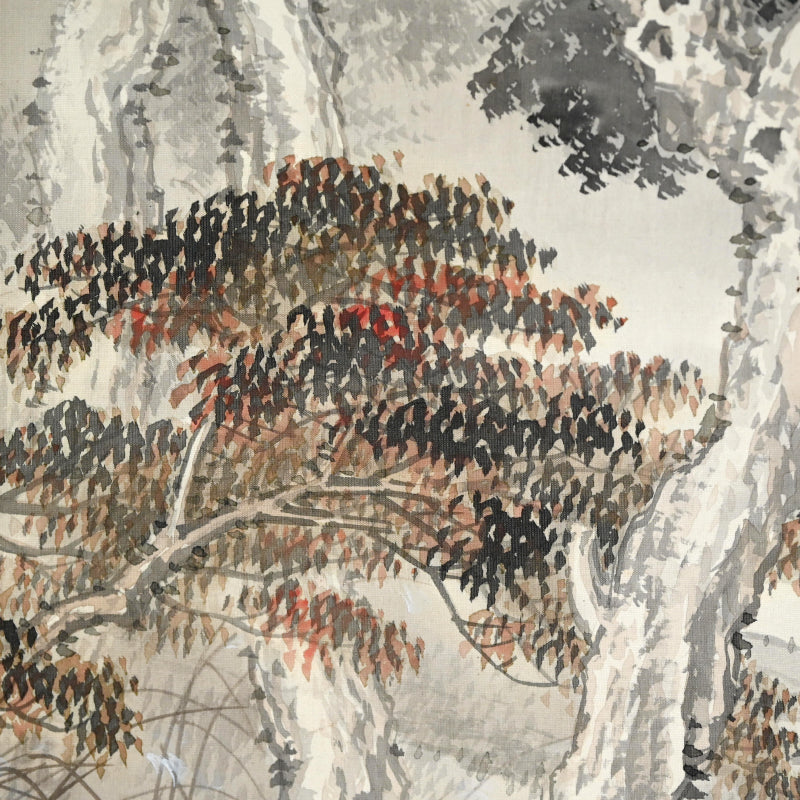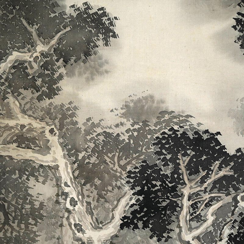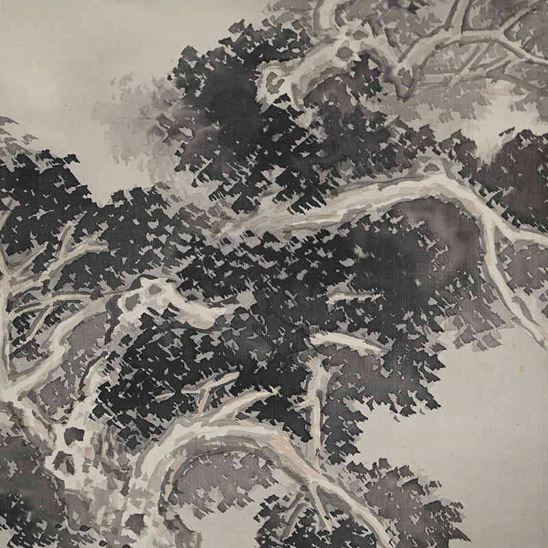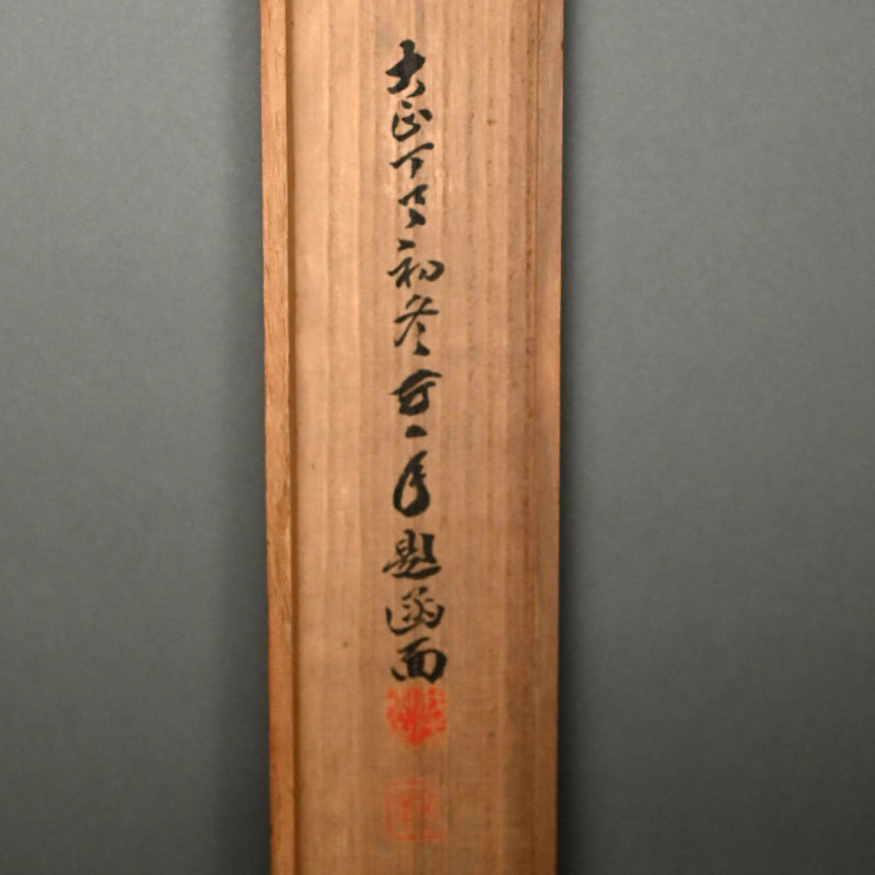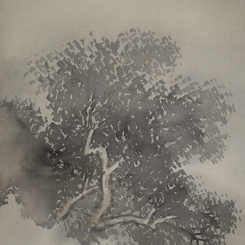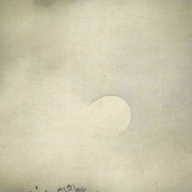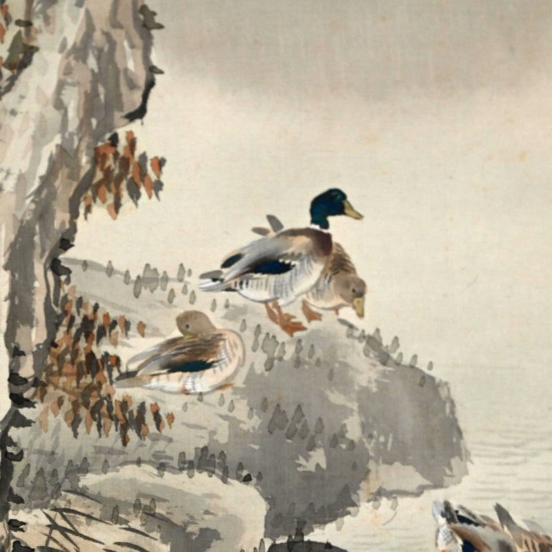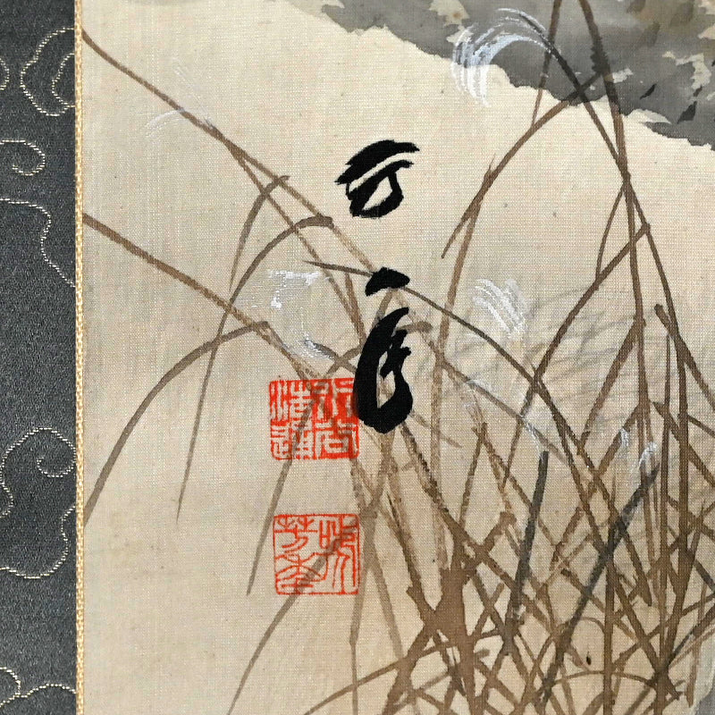 The moon rises high, piercing the misty, cloud laden autumn sky to illuminate a raft of ducks returning to Japan from their summer in Siberia sheltered in the lee of a river bank under the comforting boughs of gnarled trees. Pigment on silk in a superb border of gray silk the color of evening-sky patterned with ripples with an ichimonji of water-skippers on pale white and solid ivory rollers. The scroll is 56 x 210 cm (22 x 83 inches) and in excellent condition. It comes enclosed in the original signed wooden box dated 1917 (Taisho 6).