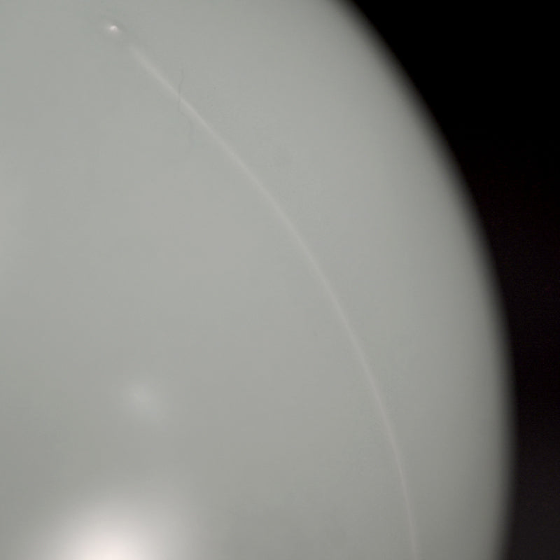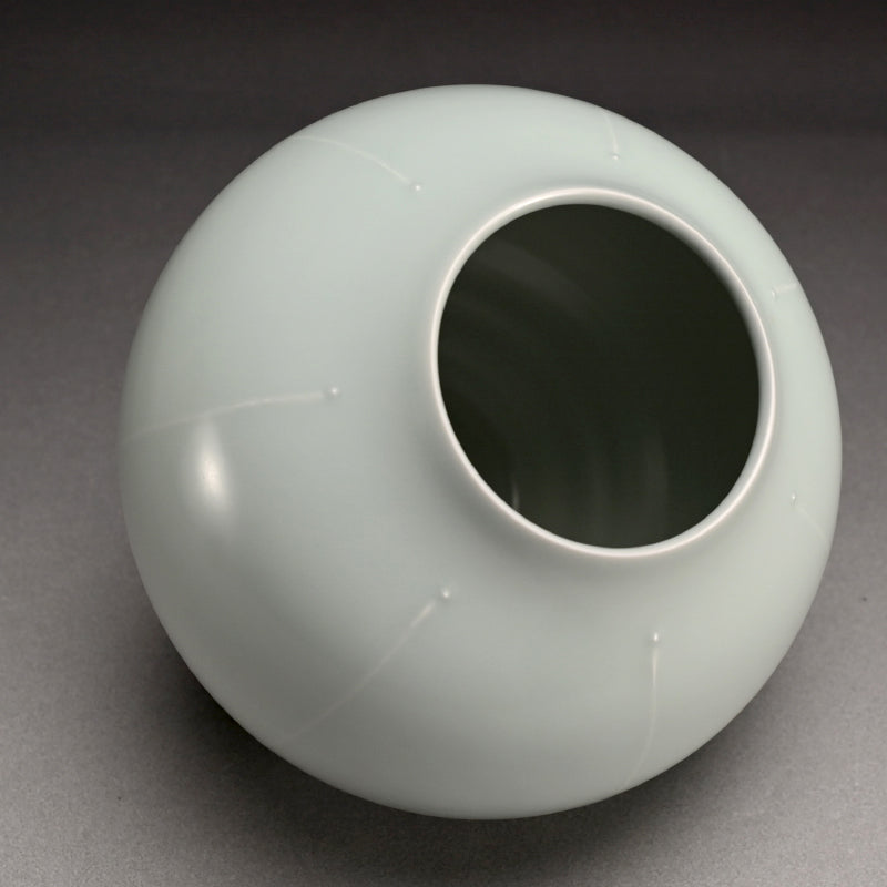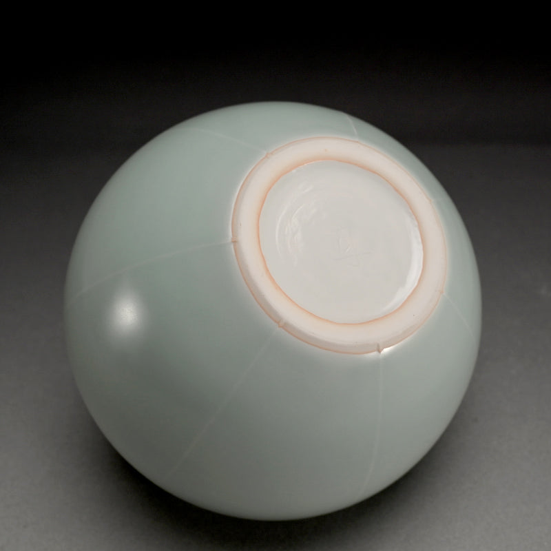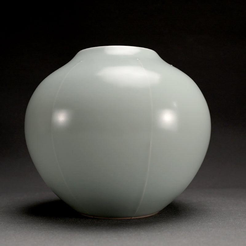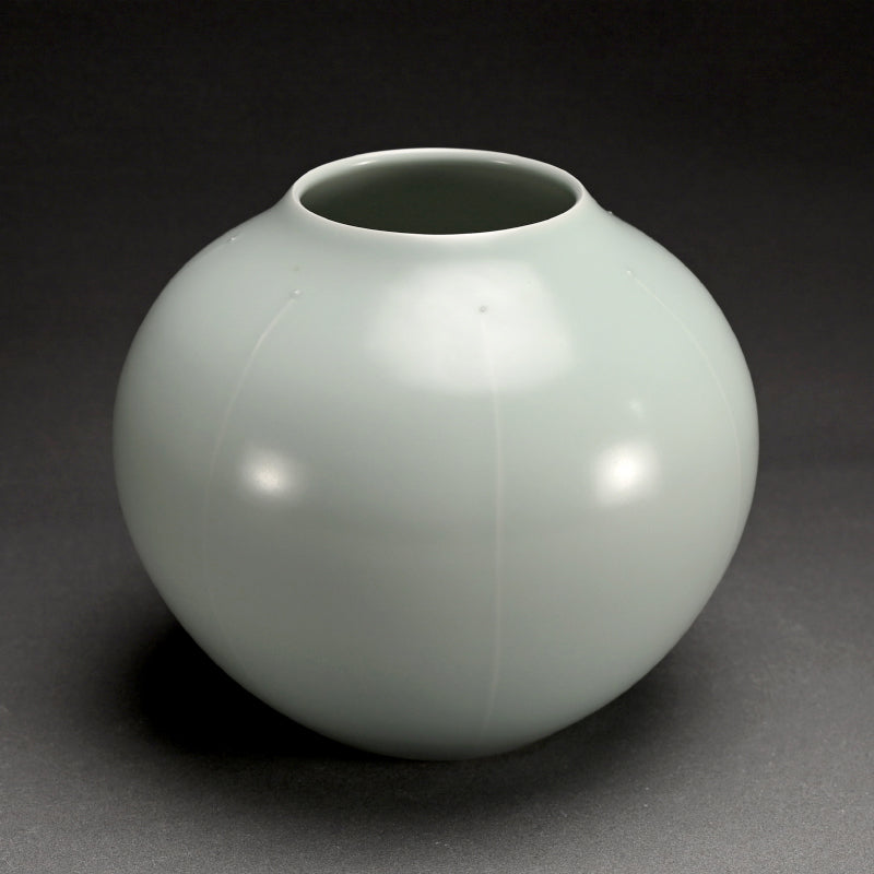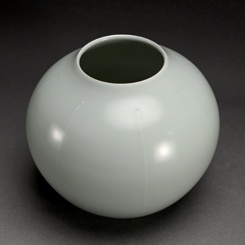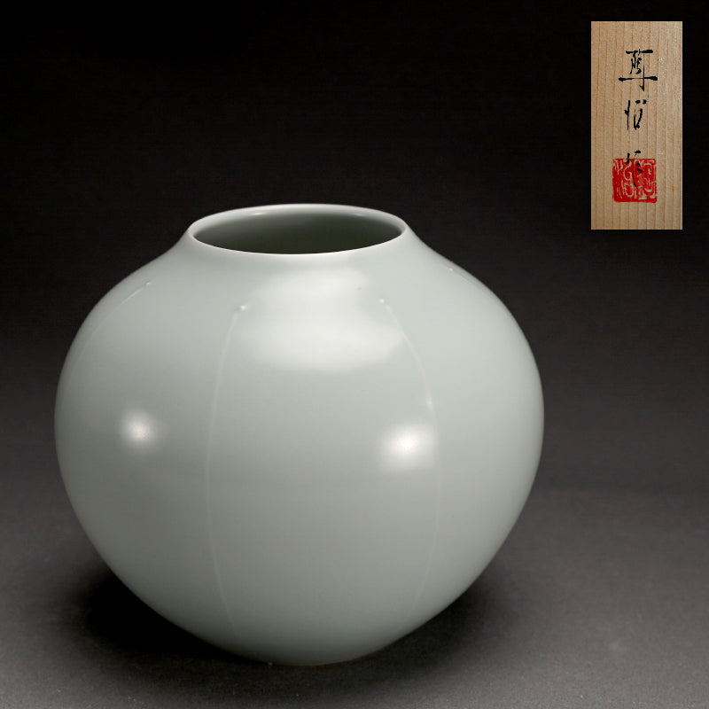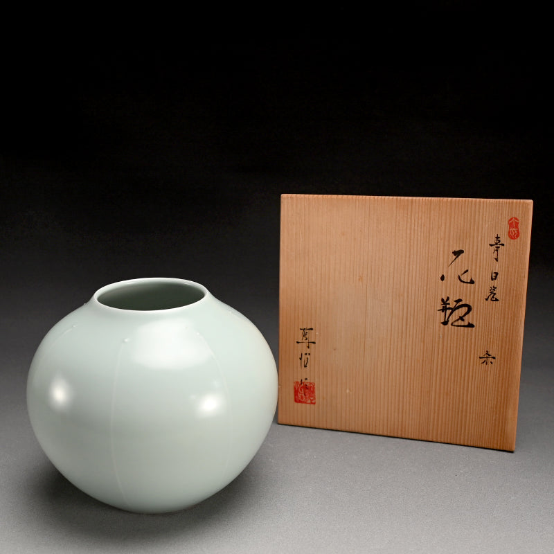 A fine seihakuji vase by celadon master Fukami Sueharu (b. 1947) enclosed in the original signed wooden box and retaining the original cloth pouch. Graceful lines drape from 7 points evenly distributed about the rim, creating a sense of geometry on the simple orb. The vase is roughly 23 cm (9 inches) diameter, 20.5 cm (8 inches) tall and in excellent condition.
