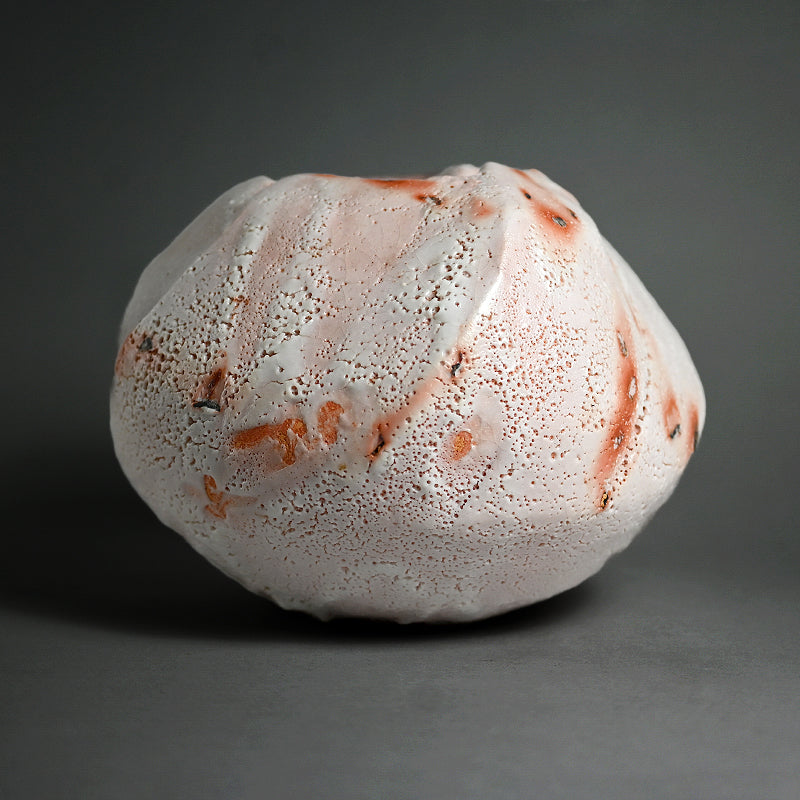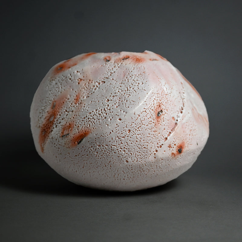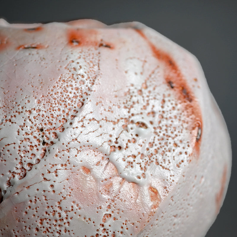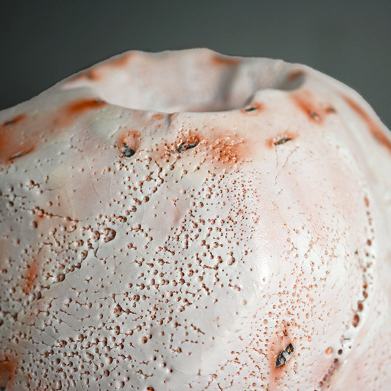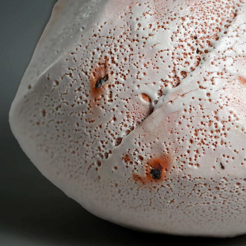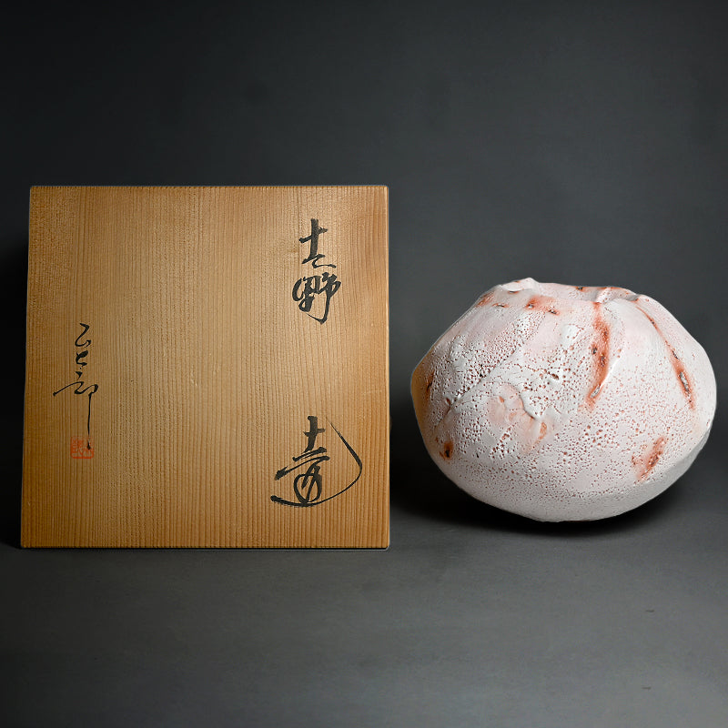 Thick pitted pink-white glaze tinged with burnt orange covers the torm surface of this lovely vase by Shino Legend Hayashi Shotaro enclosed in the original signed wooden box titled simply Shino Tsubo. It is rouhgoy 25 cm (10 inches) diameter, 19 cm (7-1/2 inches) tall and in excellent condition.