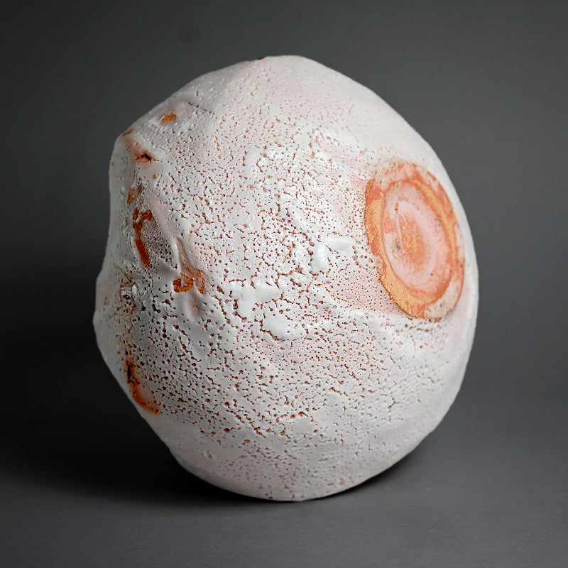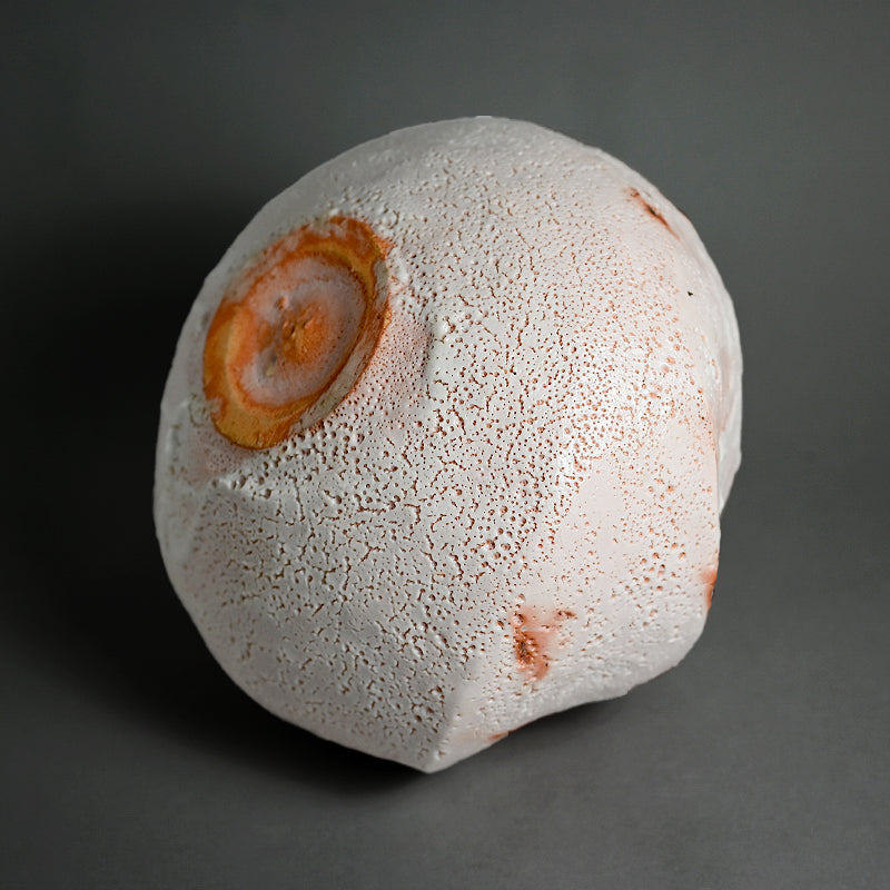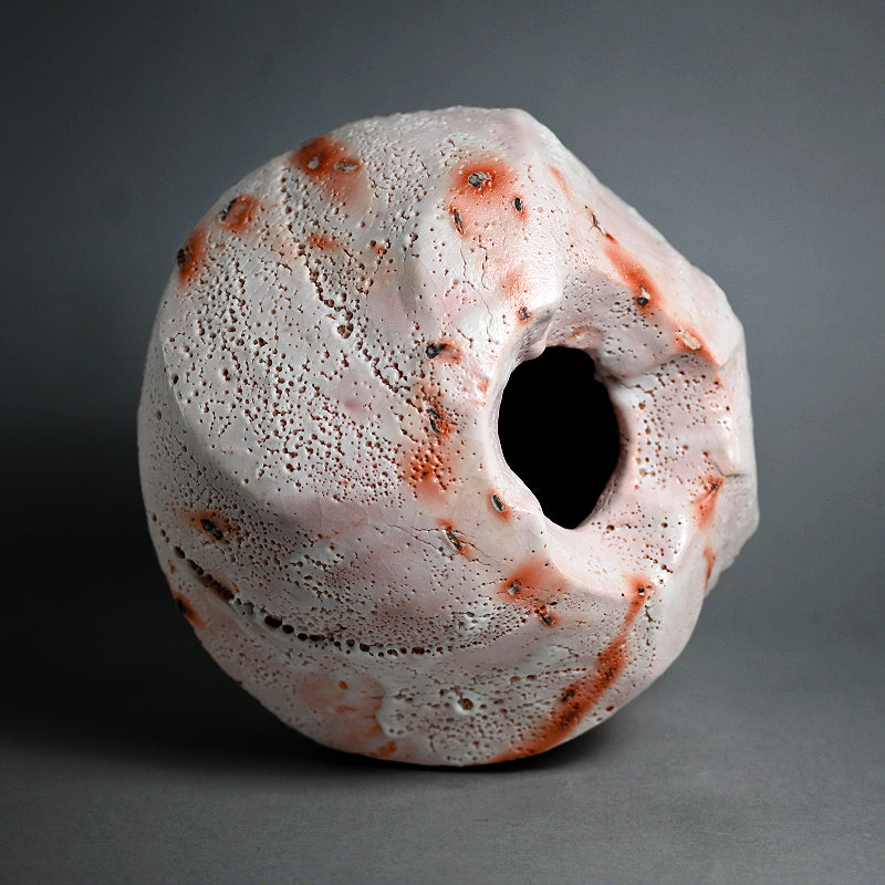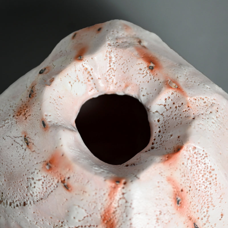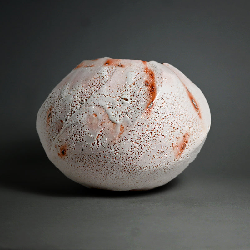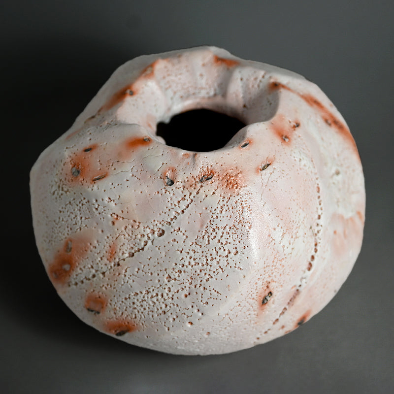 Thick pitted pink-white glaze tinged with burnt orange covers the torm surface of this lovely vase by Shino Legend Hayashi Shotaro enclosed in the original signed wooden box titled simply Shino Tsubo. It is rouhgoy 25 cm (10 inches) diameter, 19 cm (7-1/2 inches) tall and in excellent condition.