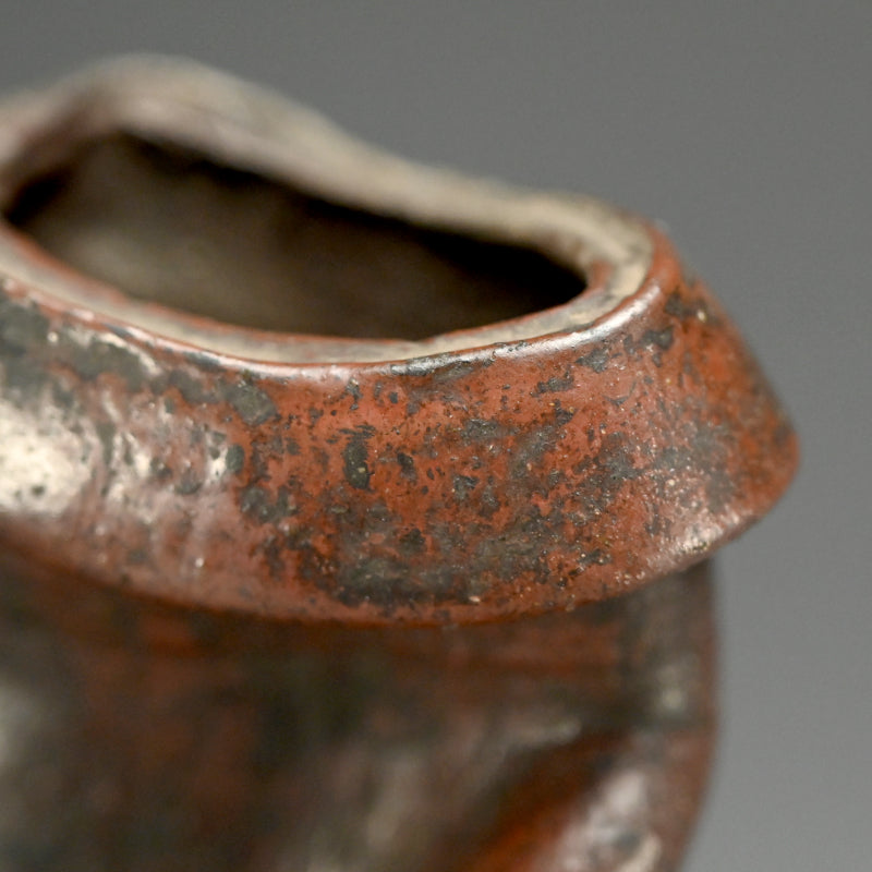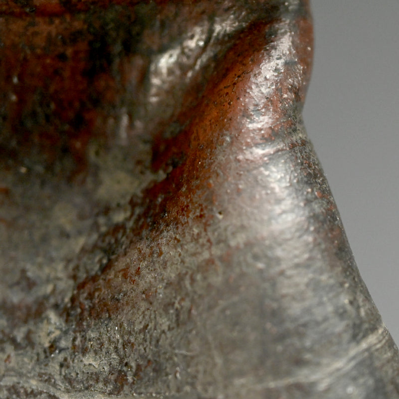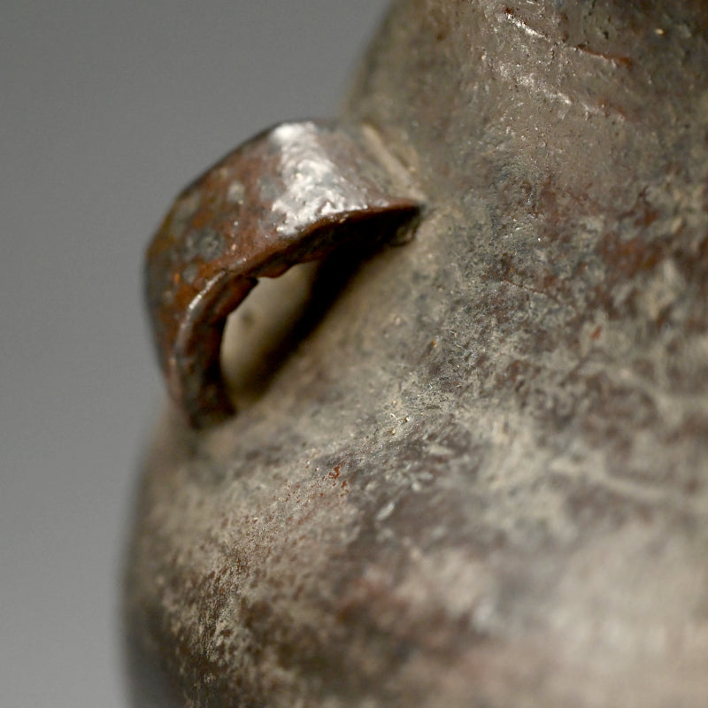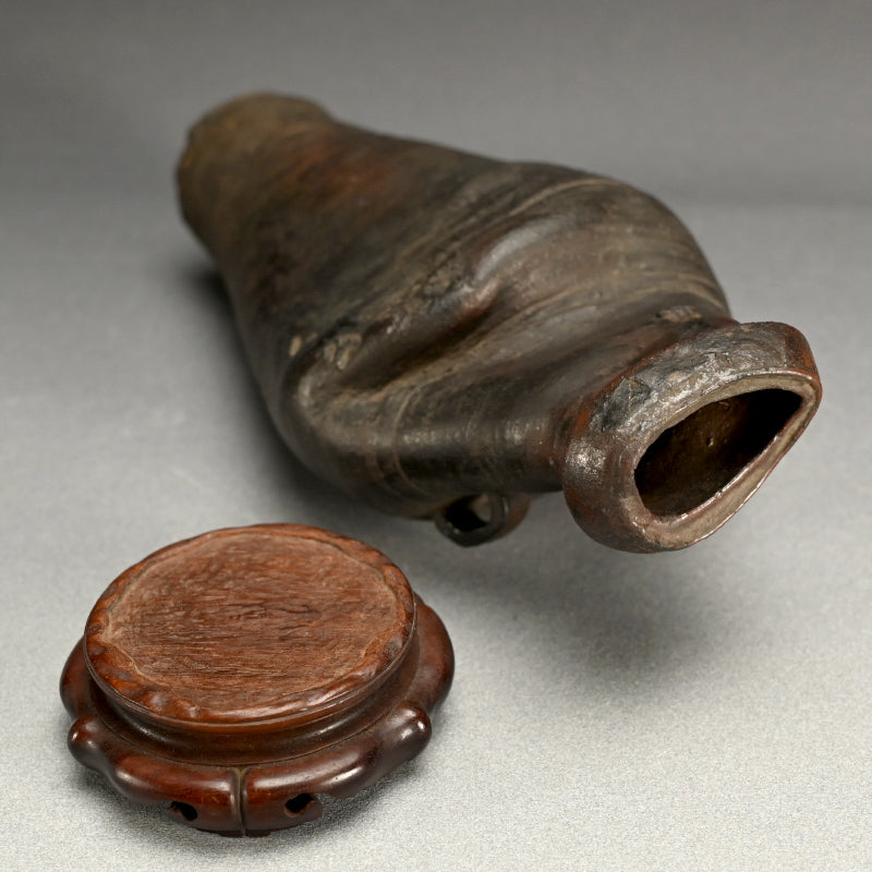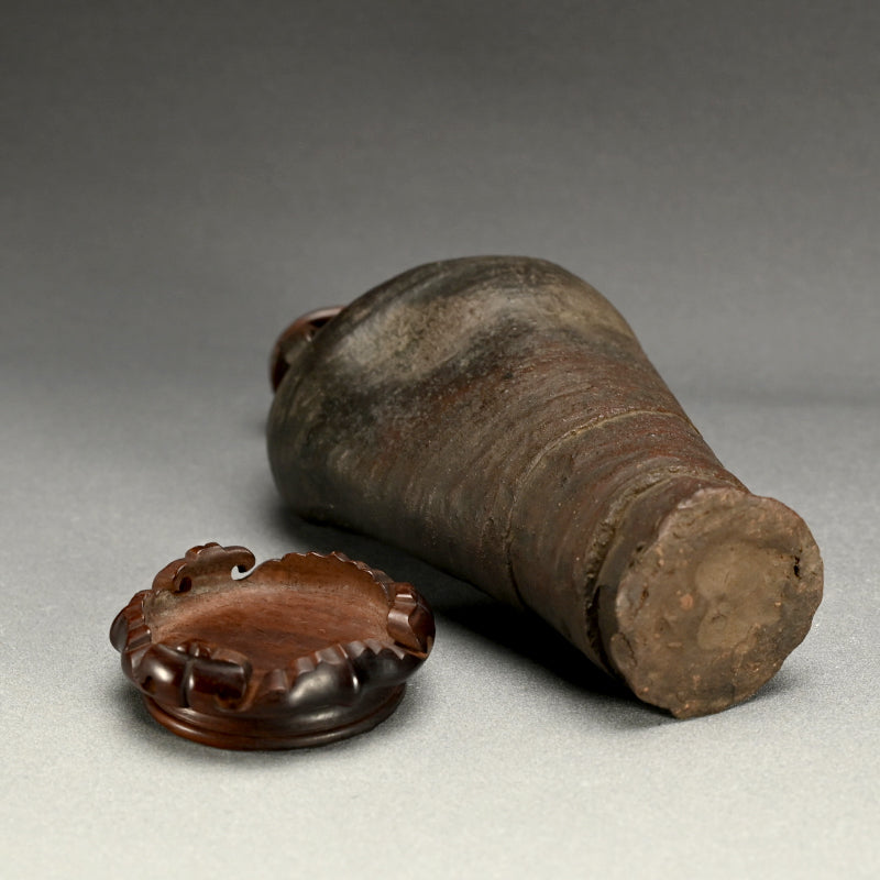 A deformed Nanban vessel set om a custom carved wooden stand made specifically to fit the convex base of the bottle dating from Edo period Japan. The unglazed vessel is dark clay, in a style known as Nanban, named after the imported wares from the south. It is 31 cm (12 inches) tall plus the base, The history of Nanban ware in Japan is connected to the Nanban trade, which was a period of cultural and technological exchange between Japan and Europe. The Nanban trade began in the Sengoku period when Portuguese explorers, merchants, and missionaries established trade routes with Japan. The trade introduced Christianity, matchlock firearms, cannons, and galleon-style shipbuilding to Japan. Pottery was imported from the Philippines, South East Asia, Malaysia and Indonesia, and Taiwan. Lacquerware, Painting and pottery were all influenced by this trade. The term "Nanban art" refers to Japanese art influenced by contact with the Nanban, or "Southern barbarians". This art includes Pottery made in Japan that imitated Nanban containers in such places as Bizen and Ryukyuan Islands, as well as Naeshirogawa ware of Satsuma and Shodai-yaki ware of Kumamoto