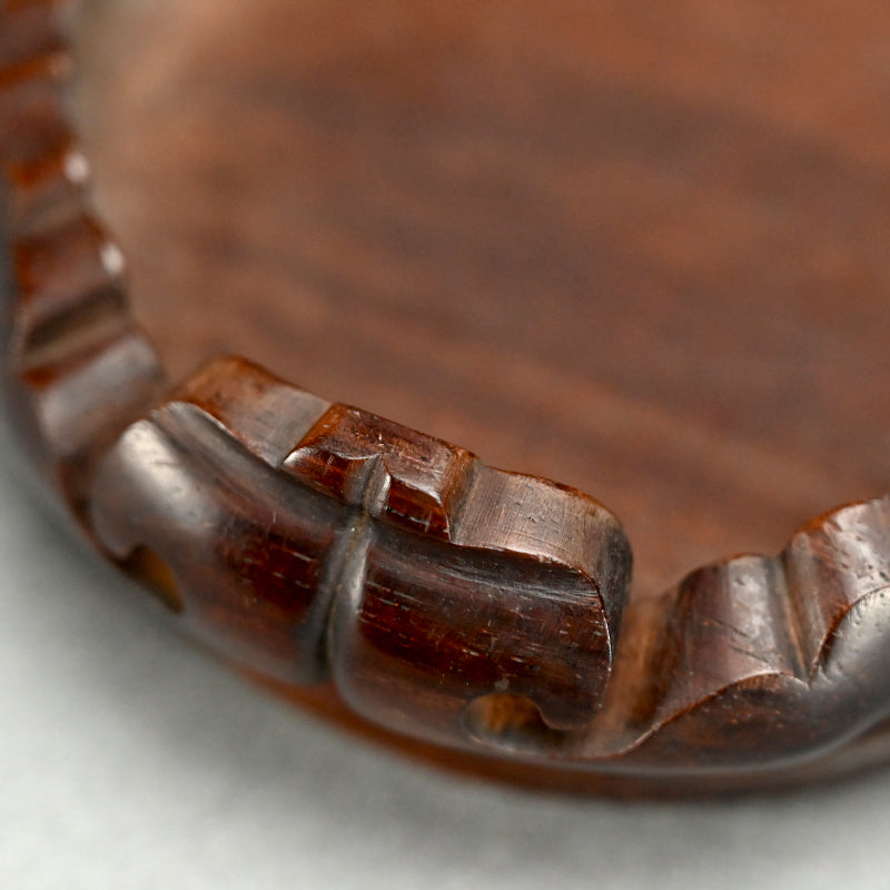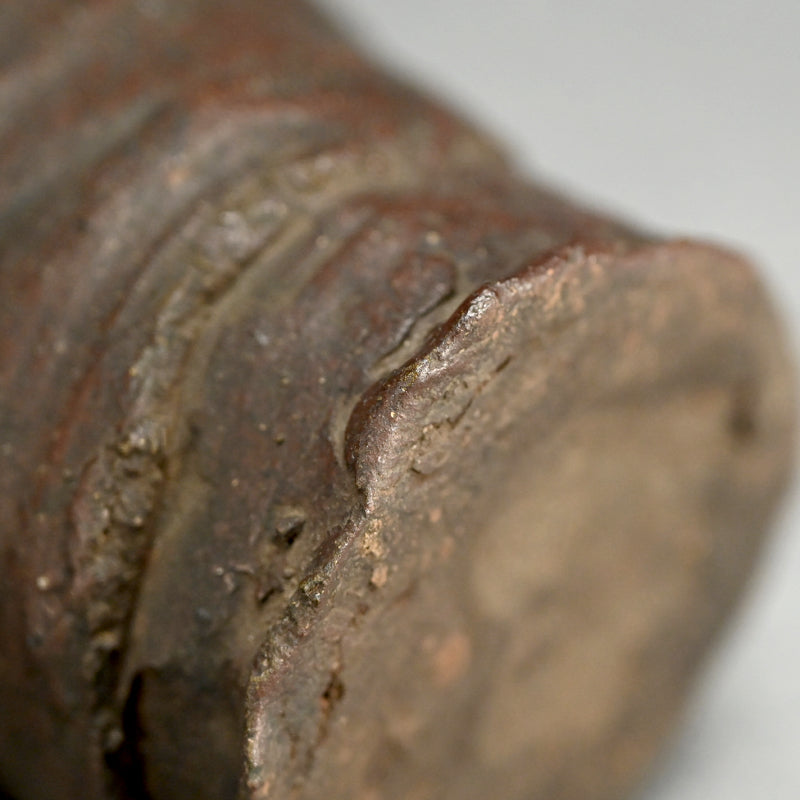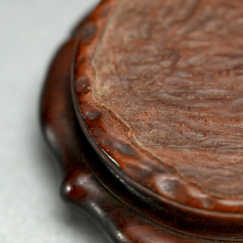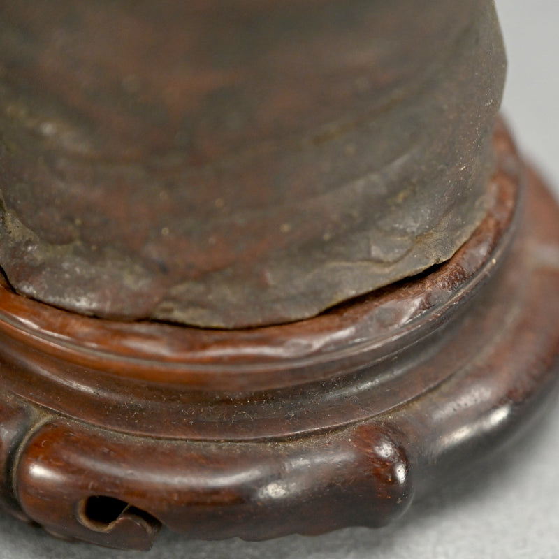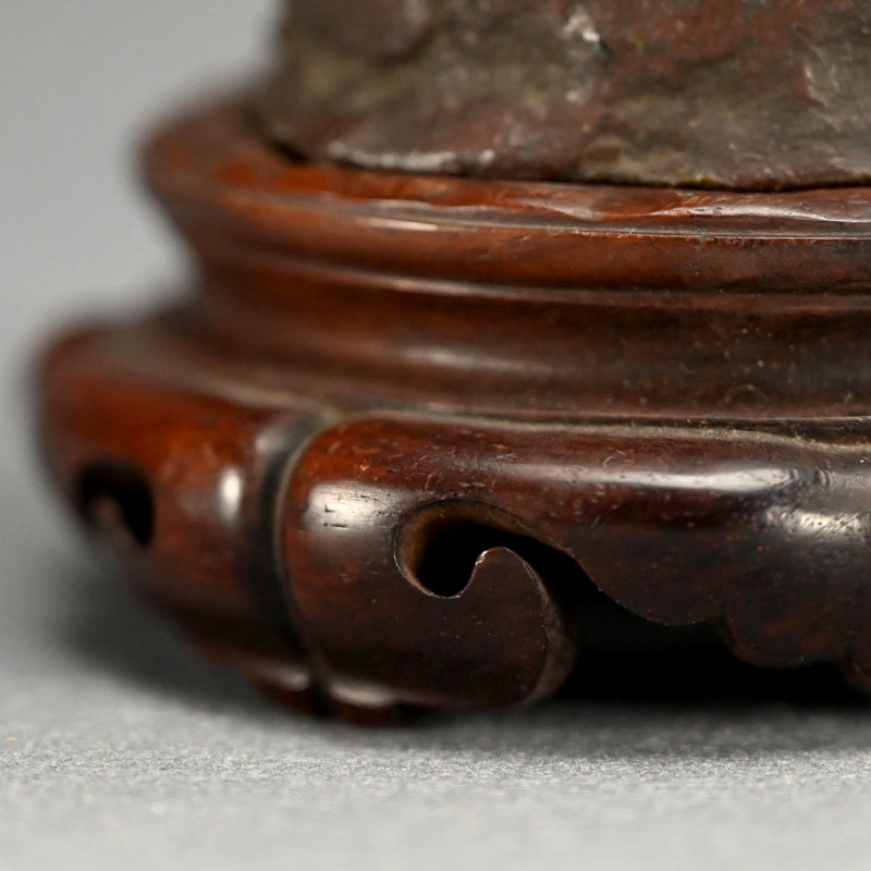 A deformed Nanban vessel set om a custom carved wooden stand made specifically to fit the convex base of the bottle dating from Edo period Japan. The unglazed vessel is dark clay, in a style known as Nanban, named after the imported wares from the south. It is 31 cm (12 inches) tall plus the base, The history of Nanban ware in Japan is connected to the Nanban trade, which was a period of cultural and technological exchange between Japan and Europe. The Nanban trade began in the Sengoku period when Portuguese explorers, merchants, and missionaries established trade routes with Japan. The trade introduced Christianity, matchlock firearms, cannons, and galleon-style shipbuilding to Japan. Pottery was imported from the Philippines, South East Asia, Malaysia and Indonesia, and Taiwan. Lacquerware, Painting and pottery were all influenced by this trade. The term "Nanban art" refers to Japanese art influenced by contact with the Nanban, or "Southern barbarians". This art includes Pottery made in Japan that imitated Nanban containers in such places as Bizen and Ryukyuan Islands, as well as Naeshirogawa ware of Satsuma and Shodai-yaki ware of Kumamoto