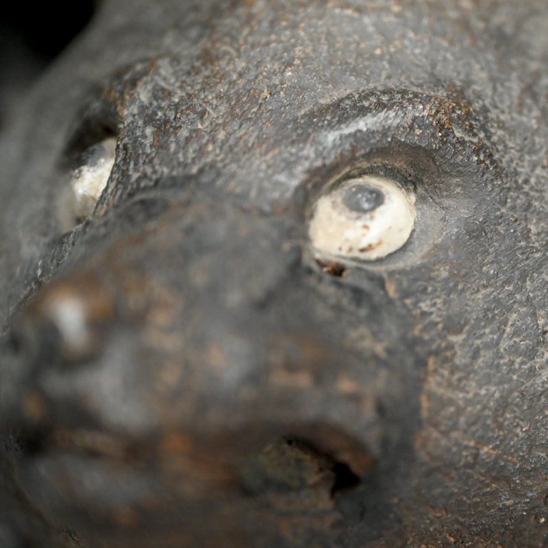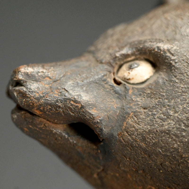 A beautifully sculpted 19th Century image of a mischievous Tanuki dressed in priests robes by Ninnami Dohachi of Kyoto, hands overlapping in a meditative pose dating from the 19th century. Signed on the bottom it measures 24 x 24 x 27 cm (roughly 9-1/2 x 9-1/2 x 10-1/2 inches). There is a firing crack under the right jaw, and in the tail, otherwise is in great condition. It comes enclosed in an age darkened wooden display box.