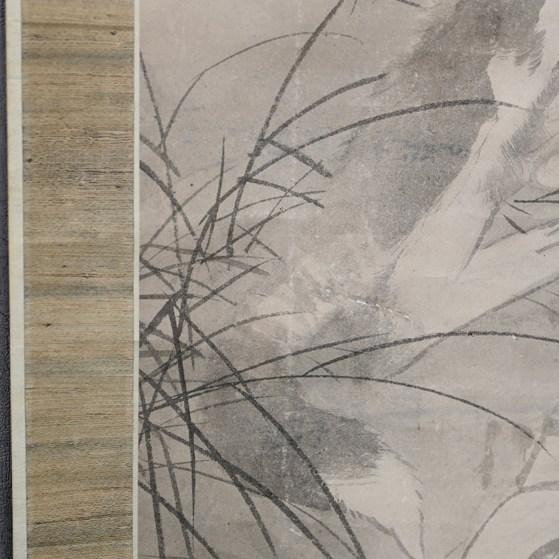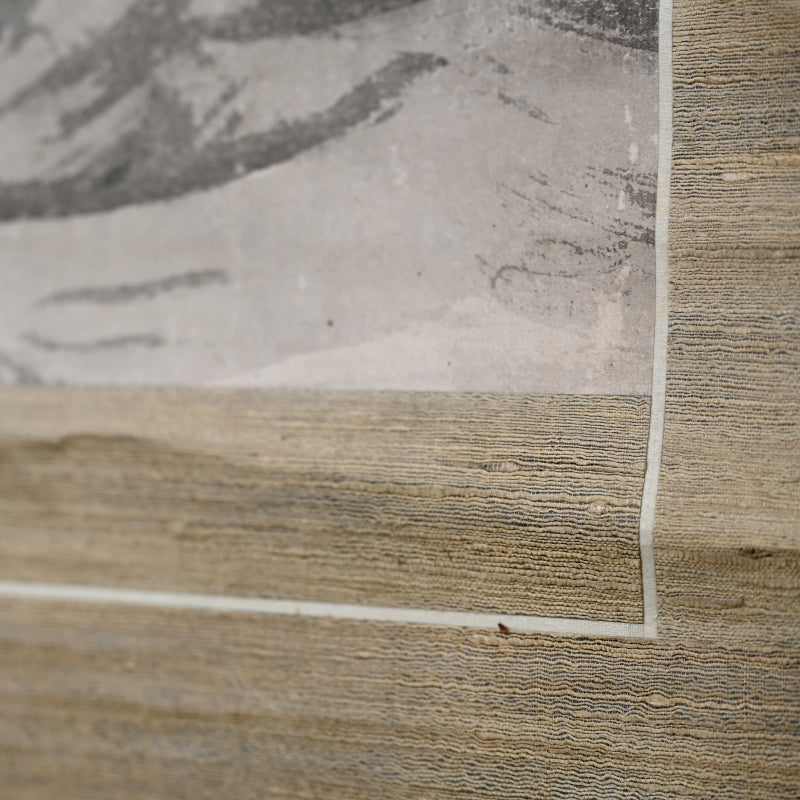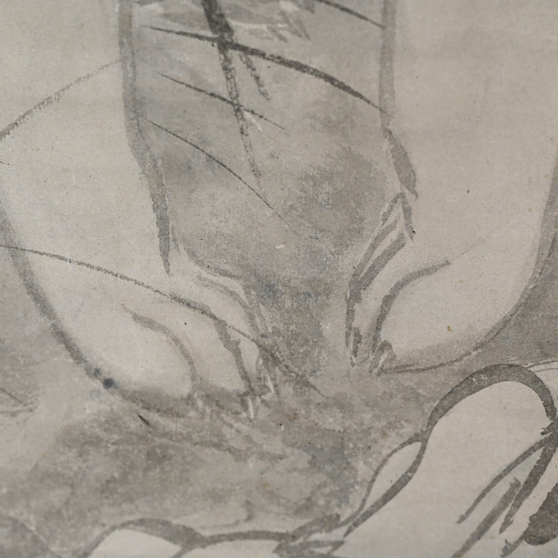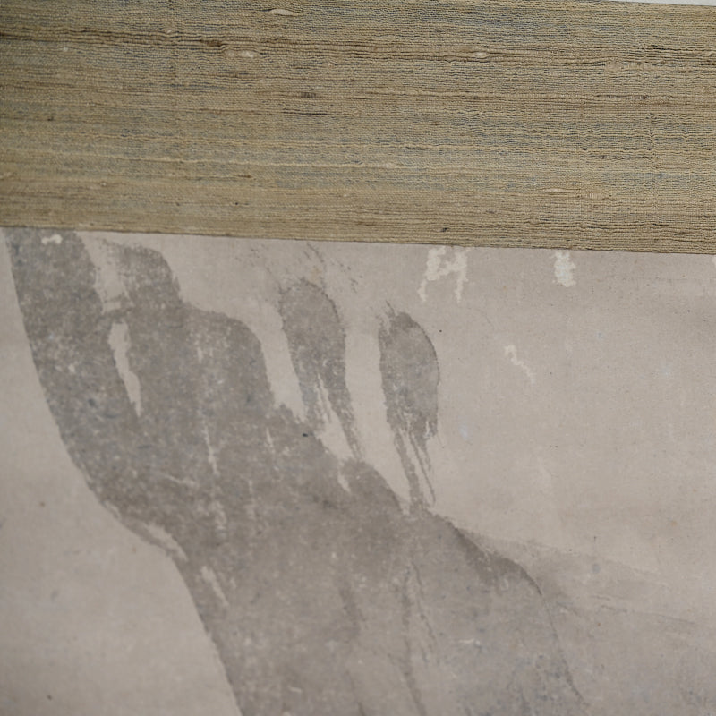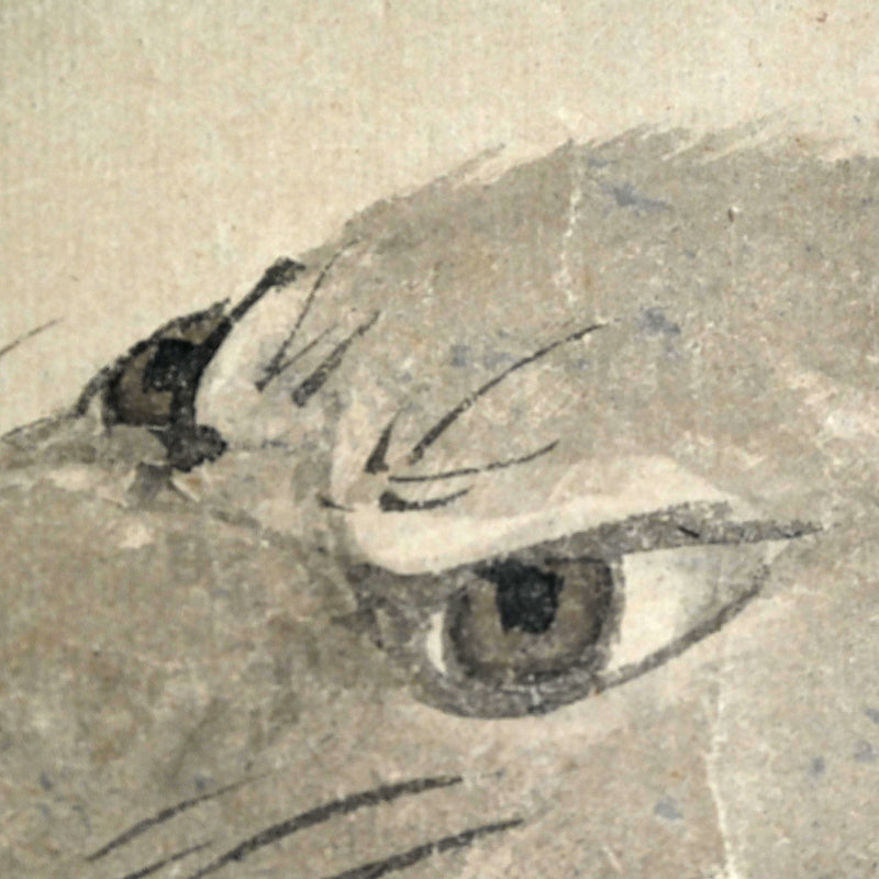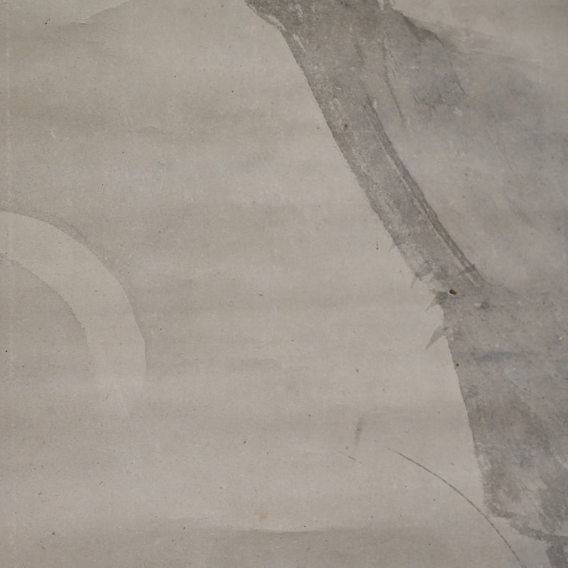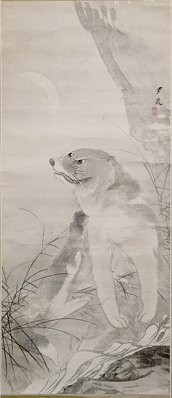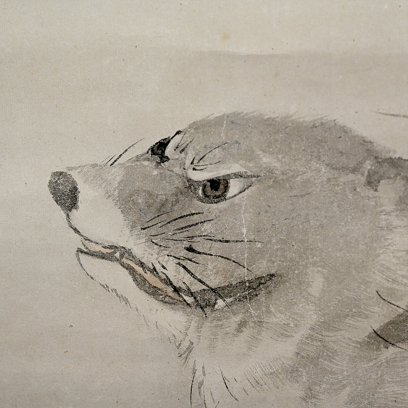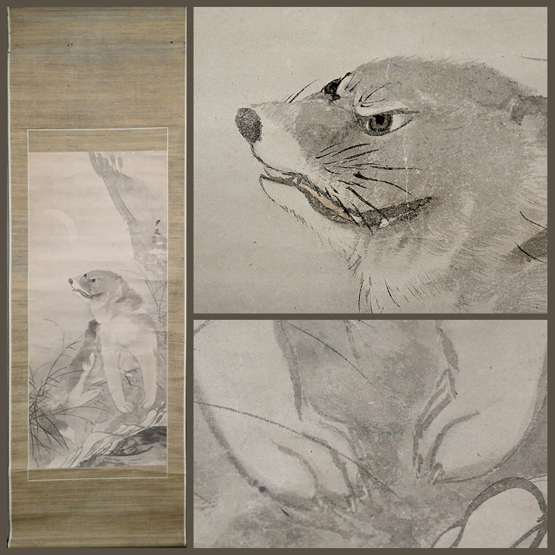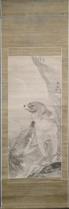 A rare theme in Japanese art of the now extinct Japanese Wolf (Okami) under a crescent moon by Edo period Zen Priest So Gessen enclosed in a wooden box. The artist has depicted the scene as if viewed in the dark, all color and depth bled out by the darkness, just gray washes against gray washes. The scroll retains its original Edo mountings befitting the austerity of a zen quarters. The scroll is 56.5 x 173.5 cm (22-1/4 x 68-1/4 inches). There are minor abrasions to the paper surface, and a few insect holes in the upper border.