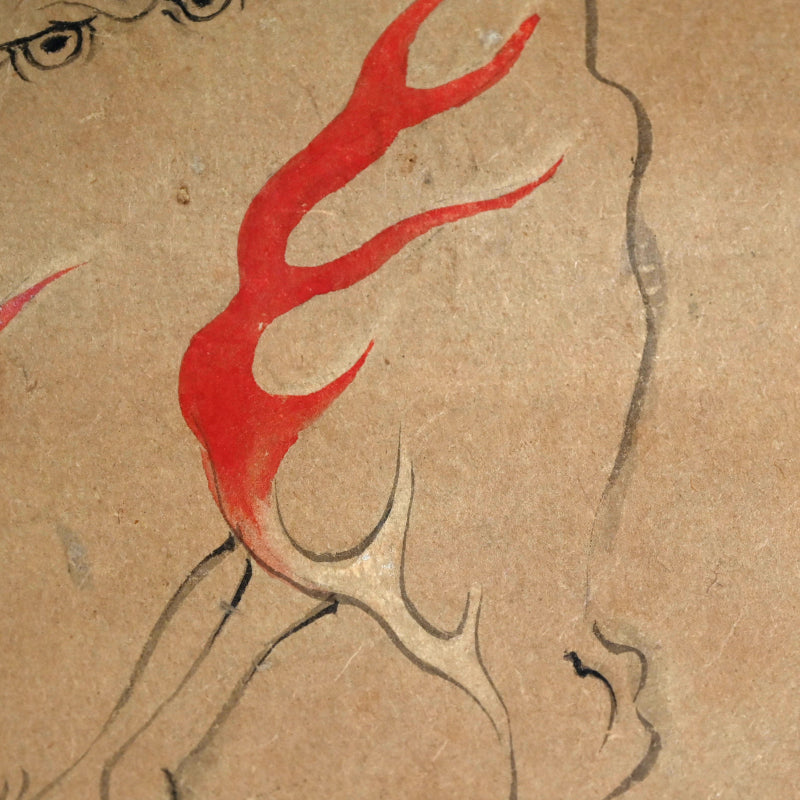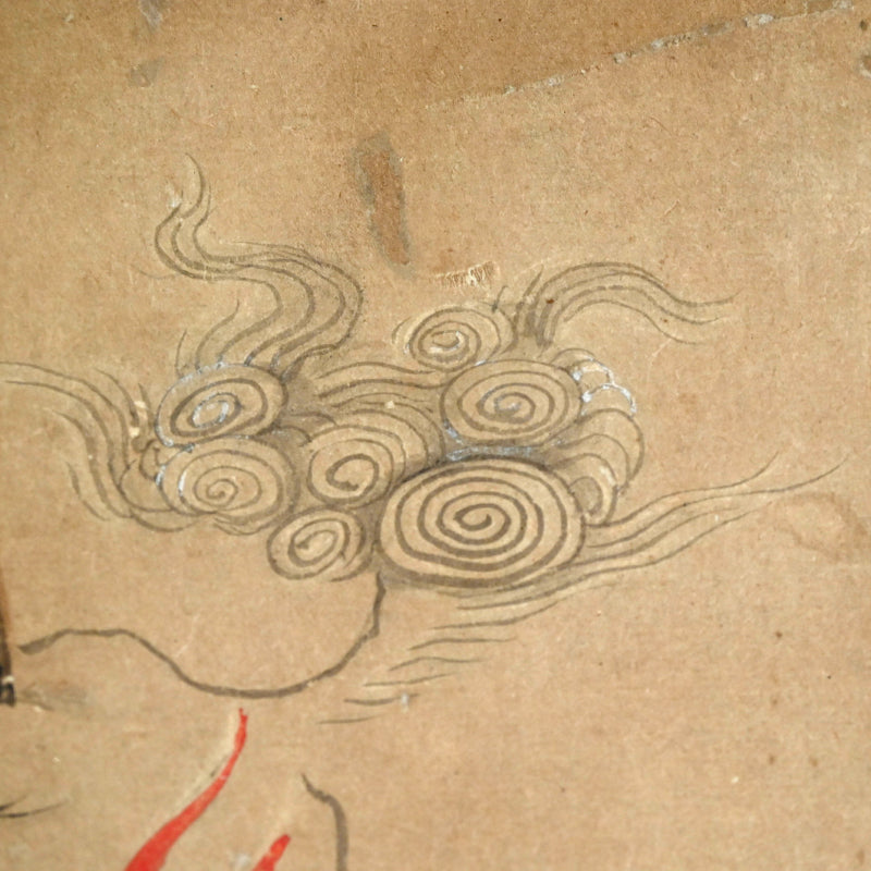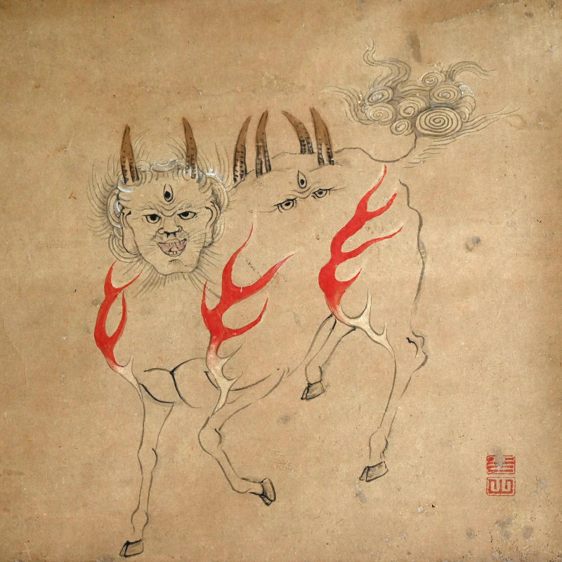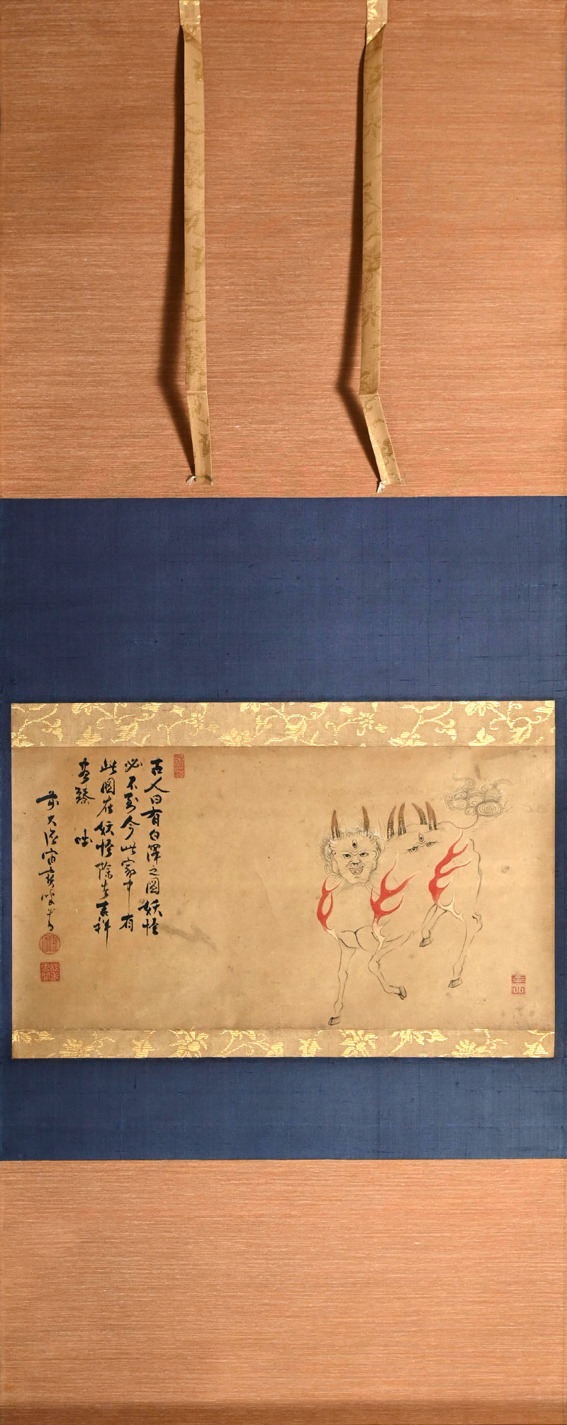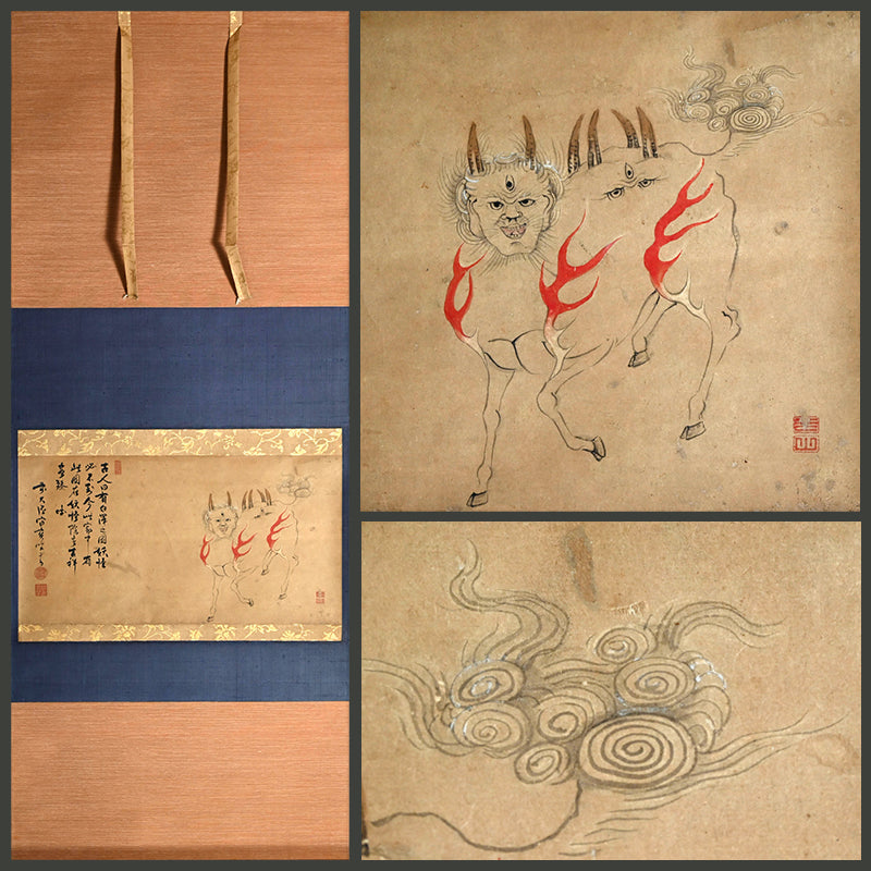 An image of a Hakutaku by 418th head priest of Daitokuji Temple Chuho Sou. Ink and light color on paper remounted in blue cloth extended with beige terminating in black lacquered wooden rollers. Judging by the calligraphy to the left the image was painted as a charm to ward off evil. The scroll is 51 x 130 cm (20 x 51 inches) and is in fine condition. It comes enclosed in an annotated wooden box. A Hakutaku (白沢) is a mythological creature from Chinese and Japanese folklore, known as a wise, benevolent beast with deep connections to the spirit world and esoteric knowledge. Said to appear only to virtuous rulers, this auspicious creature is most commonly depicted as a leonine or bovine figure with multiple eyes—often nine in total—believed to grant it the ability to perceive all things, including the presence of disease and malevolent spirits. According to legend, the Yellow Emperor of China encountered the Hakutaku, who imparted to him detailed knowledge of the world’s myriad supernatural beings and how to guard against them. In Japan, the Hakutaku became especially prominent as a talismanic figure during times of epidemic, its image reproduced in woodblock prints and hung in homes as a ward against illness. Merging esoteric knowledge with benevolence, the Hakutaku endures as a guardian of both body and spirit.