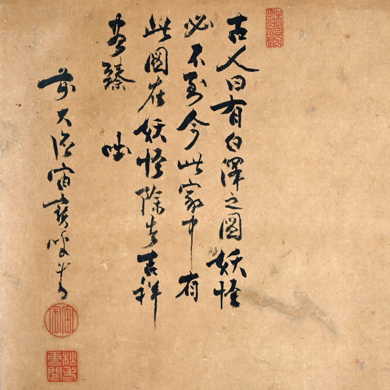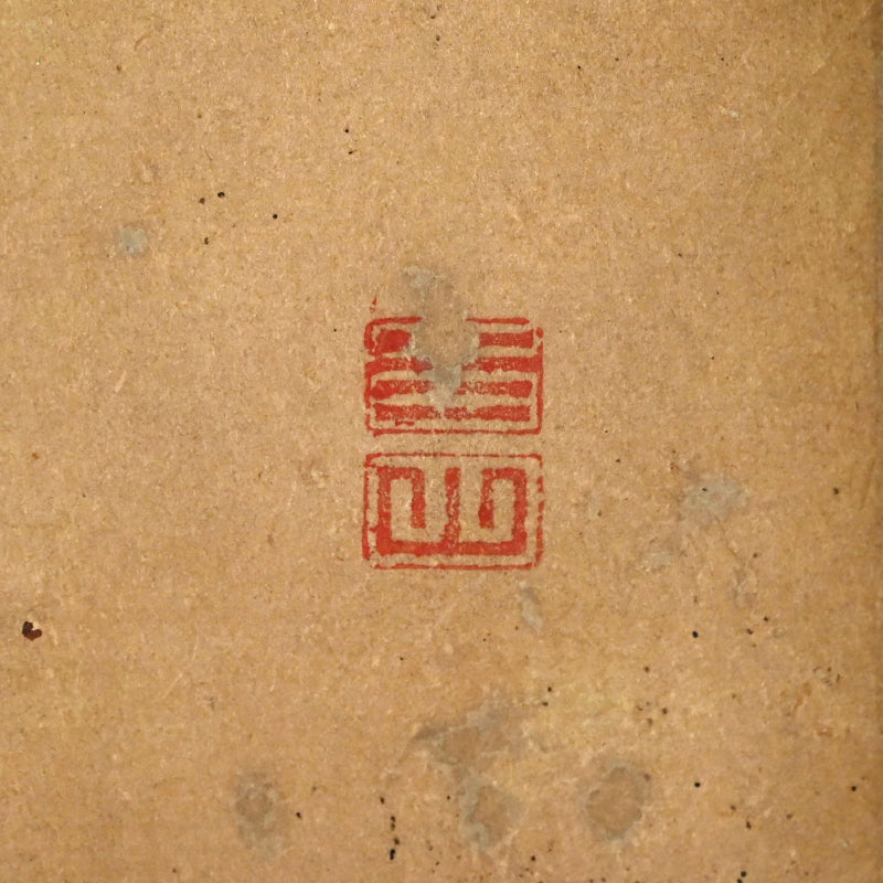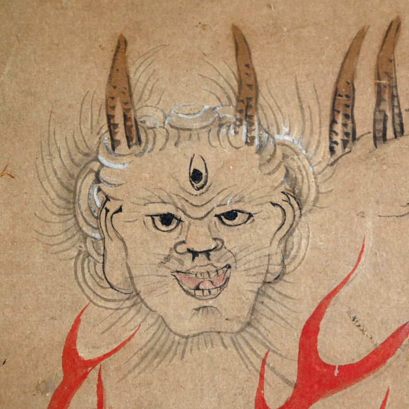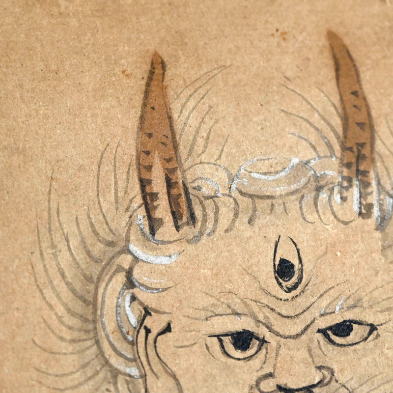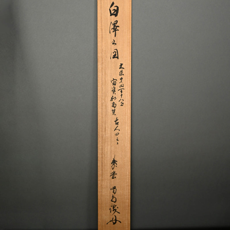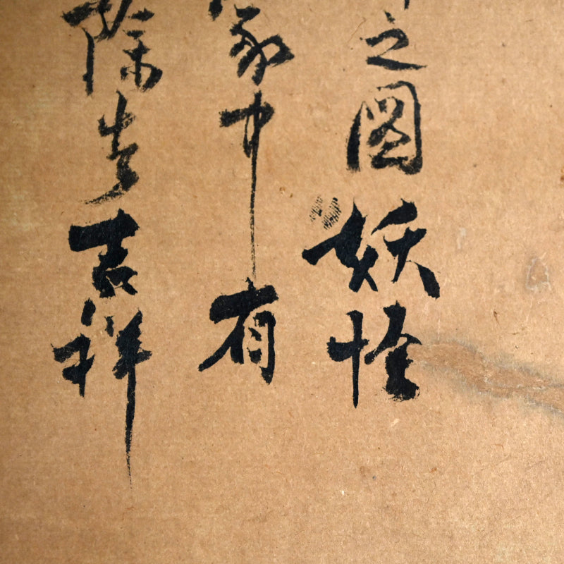 An image of a Hakutaku by 418th head priest of Daitokuji Temple Chuho Sou. Ink and light color on paper remounted in blue cloth extended with beige terminating in black lacquered wooden rollers. Judging by the calligraphy to the left the image was painted as a charm to ward off evil. The scroll is 51 x 130 cm (20 x 51 inches) and is in fine condition. It comes enclosed in an annotated wooden box. A Hakutaku (白沢) is a mythological creature from Chinese and Japanese folklore, known as a wise, benevolent beast with deep connections to the spirit world and esoteric knowledge. Said to appear only to virtuous rulers, this auspicious creature is most commonly depicted as a leonine or bovine figure with multiple eyes—often nine in total—believed to grant it the ability to perceive all things, including the presence of disease and malevolent spirits. According to legend, the Yellow Emperor of China encountered the Hakutaku, who imparted to him detailed knowledge of the world’s myriad supernatural beings and how to guard against them. In Japan, the Hakutaku became especially prominent as a talismanic figure during times of epidemic, its image reproduced in woodblock prints and hung in homes as a ward against illness. Merging esoteric knowledge with benevolence, the Hakutaku endures as a guardian of both body and spirit.