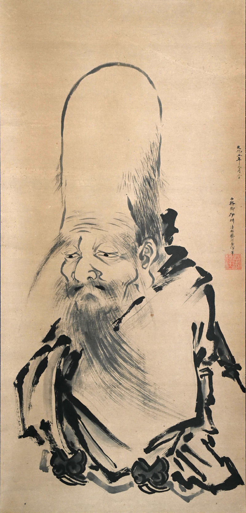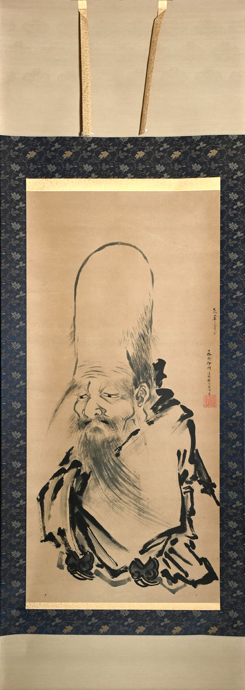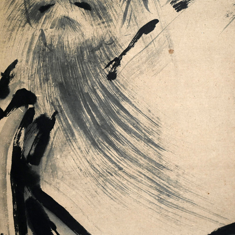 A transcending image of the aged Jurojin dated Bunka 5 (1808) signed Fujiwara Naganobu (attributed to Kano Naganobu, 1775-1828). The powerful dark lines forming his robes are offset by the wispy atmosphere of his hair and flesh, creating an ethereal aura. It has been completely remounted in a manner reflecting the original cloth, and retains the original large wooden rollers. It is 68.5 x 196 cm (27 by 77 inches).
