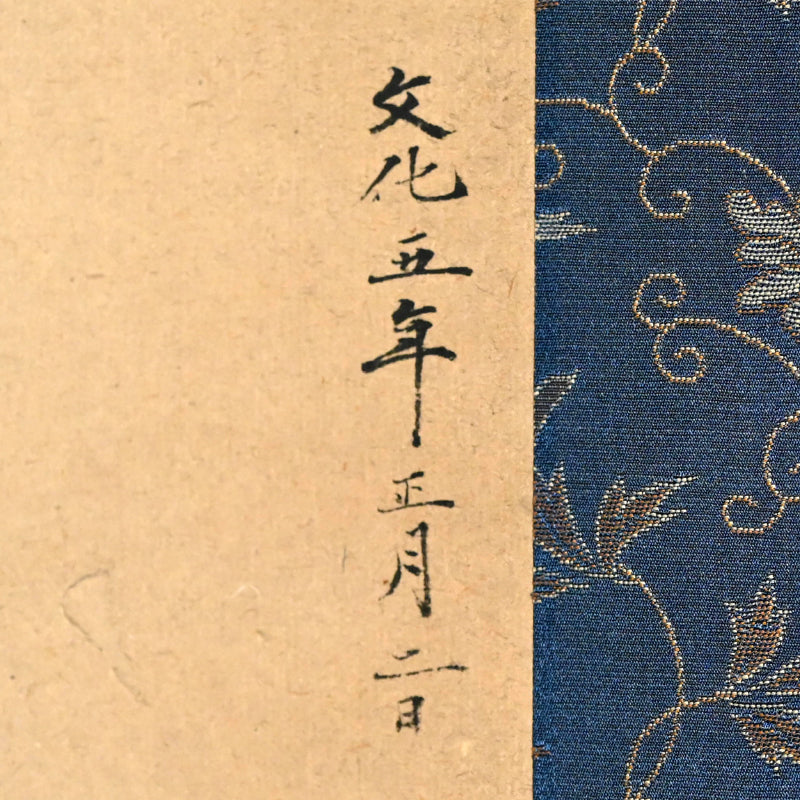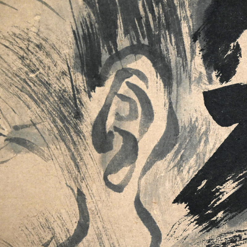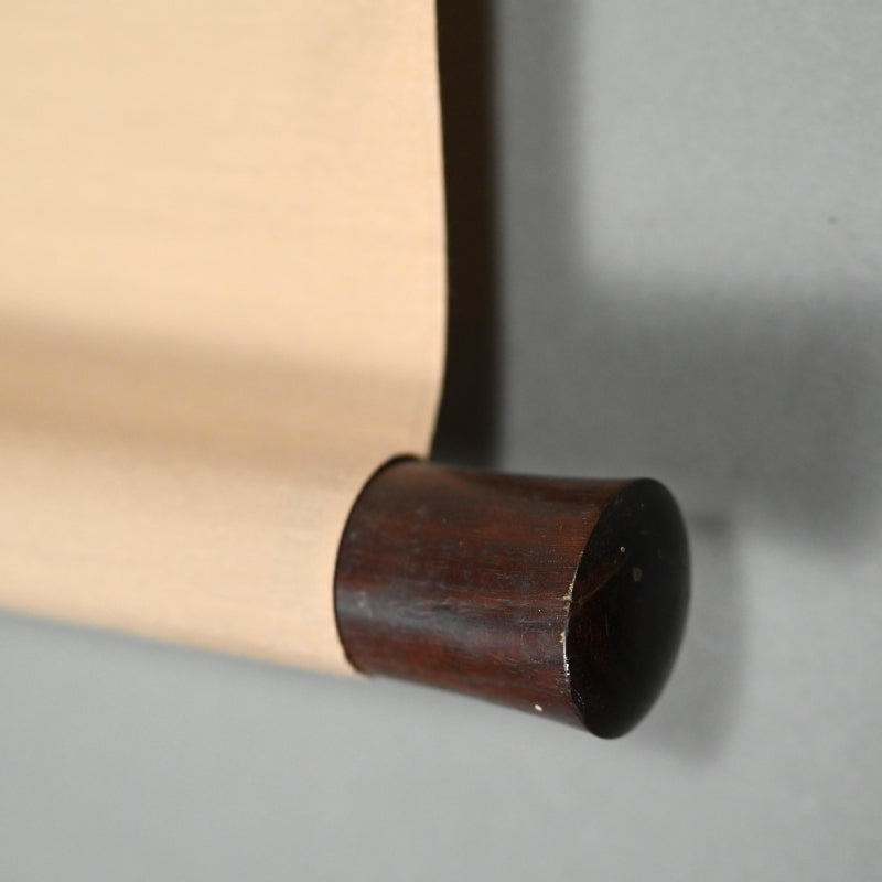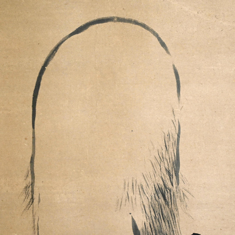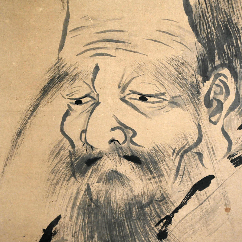 A transcending image of the aged Jurojin dated Bunka 5 (1808) signed Fujiwara Naganobu (attributed to Kano Naganobu, 1775-1828). The powerful dark lines forming his robes are offset by the wispy atmosphere of his hair and flesh, creating an ethereal aura. It has been completely remounted in a manner reflecting the original cloth, and retains the original large wooden rollers. It is 68.5 x 196 cm (27 by 77 inches).