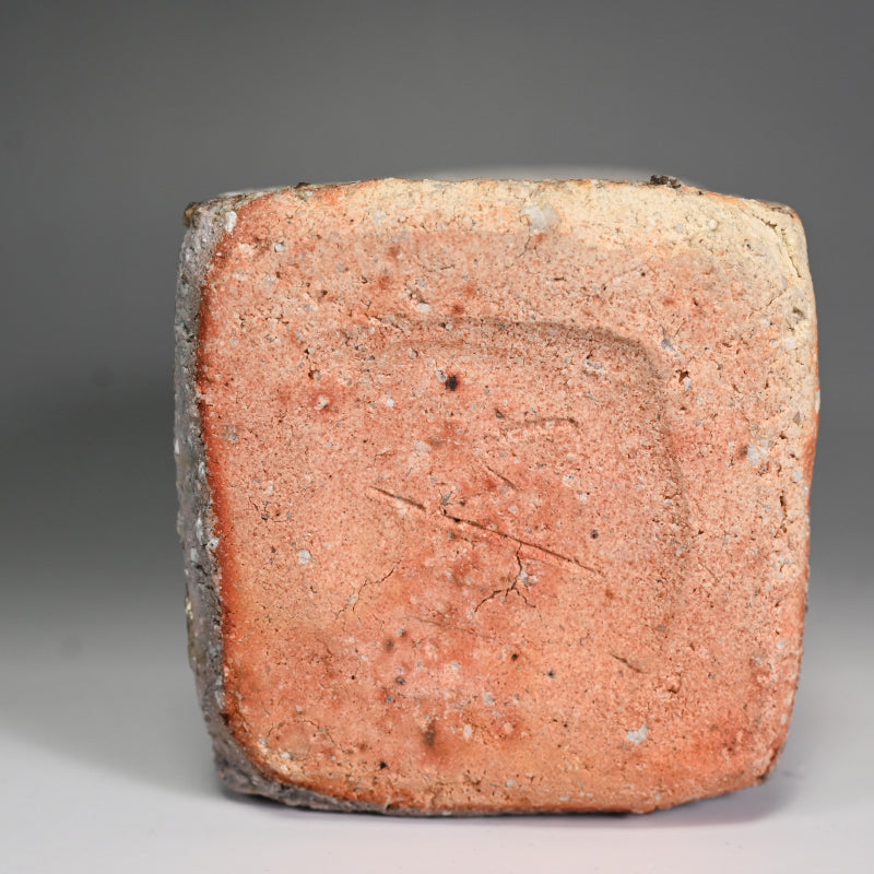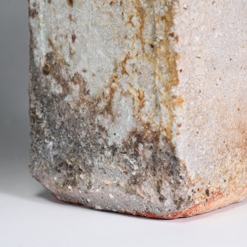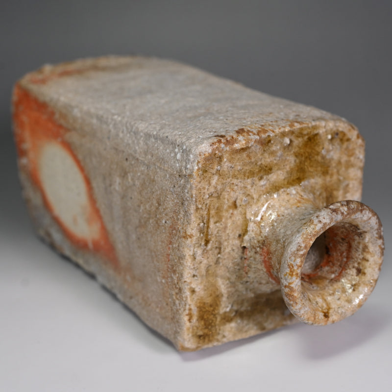 A squared bottle form vase by Furutani Michi enclosed in the original signed wooden box titled Shigaraki Shiho Hanaire.  This piece is subtle, with an element of grace and gentility not associated with wood fired works today.  Glassy green on the shoulder, two sides show charring up the corner, where it was buried in ash a third side a beautiful Hi-iro circle of fire, and the last side is bereft of pretense, simply unadulterated raw clay.  It is 25 cm (10 inches) tall and in excellent condition.