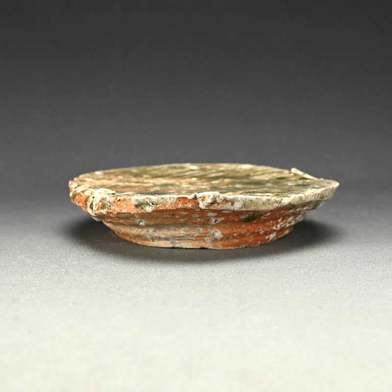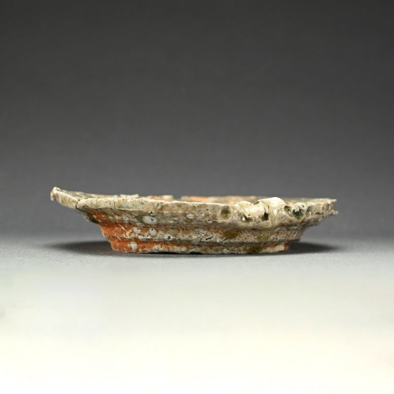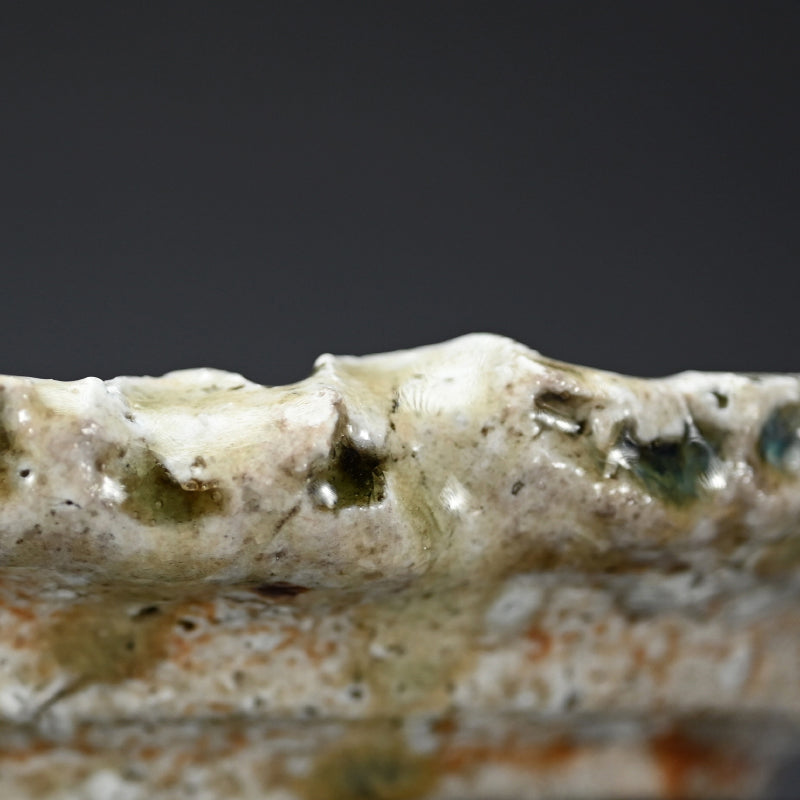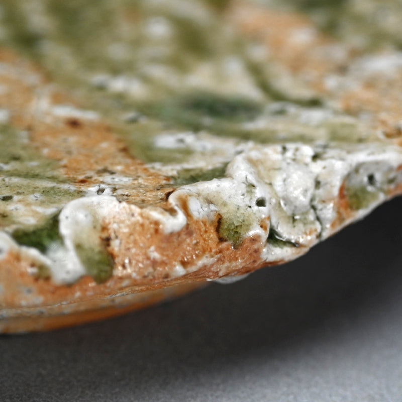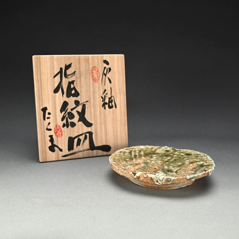 The flattened surface of this elevated dish is scored by the artist fingers and covered in a smattering of green ash glaze by Murakoshi Takuma enclosed in the original signed wooden box titled Hai-yu Yubi-mon Sara. It is 23 x 20 x 5 cm (10 x 8 x 2 inches) and in perfect condition, directly from the artist.