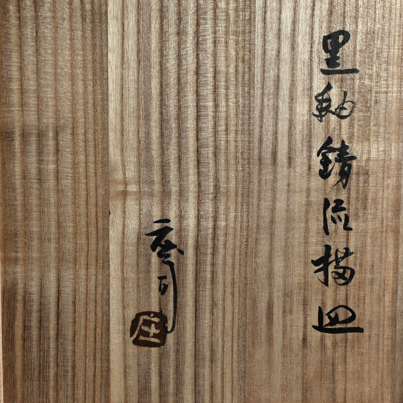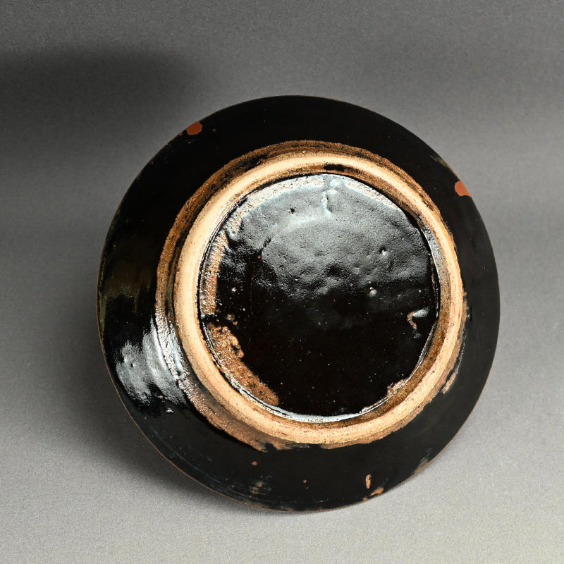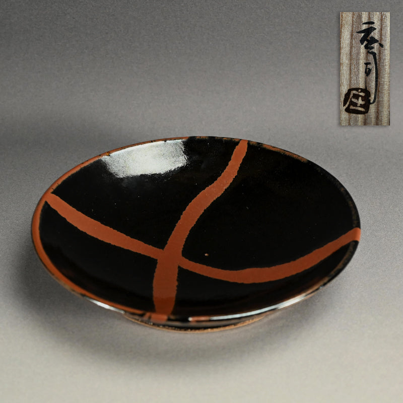 A quintessential work by Living National Treasure and icon of the Mingei movement Hamada Shoji enclosed in the original signed wooden box titled Kuro-yu Sabi-nagashi E-zara.  It is 27 cm (just less than 11 inches) diameter, 5 cm (2 inches) tall and in excellent condition.