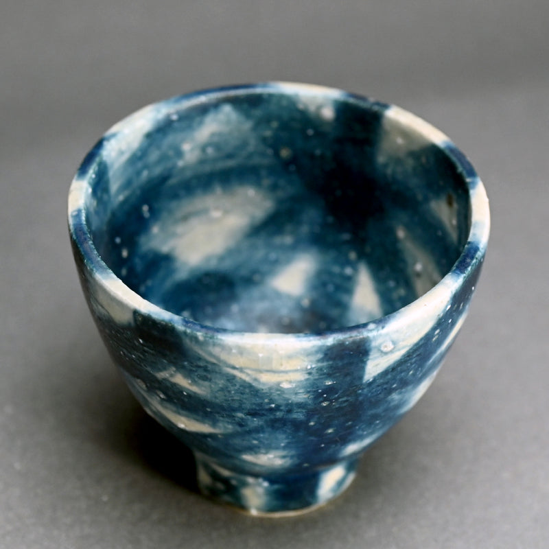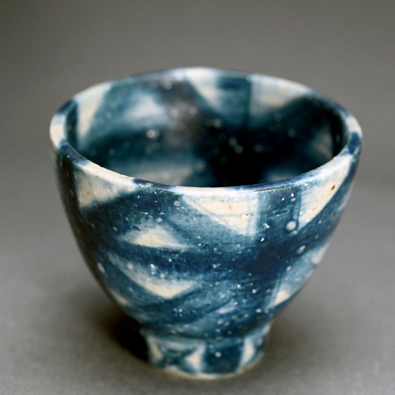 A beautiful tall footed tea bowl by Fukushima Hiroko covered in patterns of her signature blend of indigo-blue enclosed in the original signed wooden box titled Gosu-e Chawan. It is 12 cm (5 inches) diameter, 10.5 cm (4 inches) tall and in excellent condition.