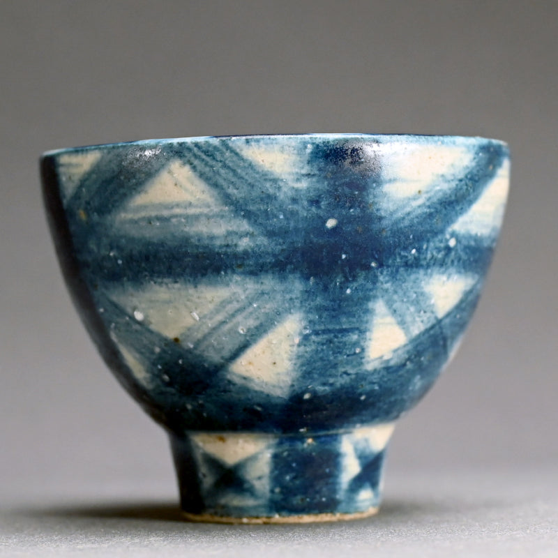 A beautiful tall footed tea bowl by Fukushima Hiroko covered in patterns of her signature blend of indigo-blue enclosed in the original signed wooden box titled Gosu-e Chawan. It is 12 cm (5 inches) diameter, 10.5 cm (4 inches) tall and in excellent condition.