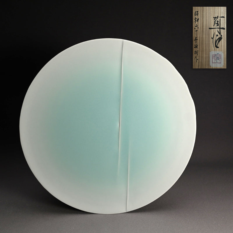 A singular disc of sheer green celadon by Fukami Sueharu enclosed in the original signed wooden box titled Sui. The name is taken from the green of the iridescent Kingfisher plumage. The disc is 42 cm (17 inches) diameter, and in perfect condition.