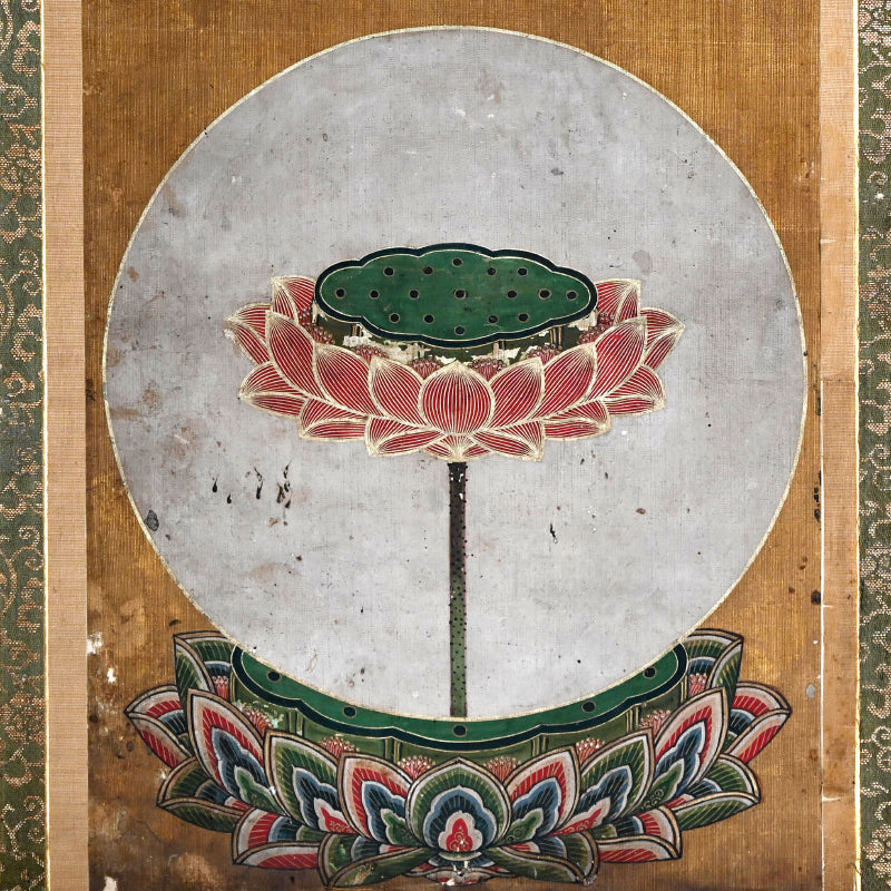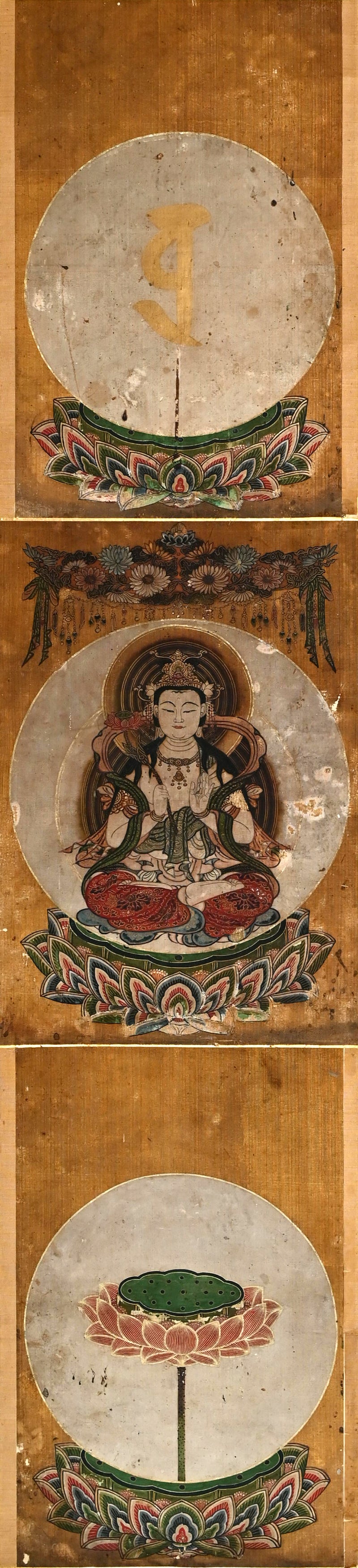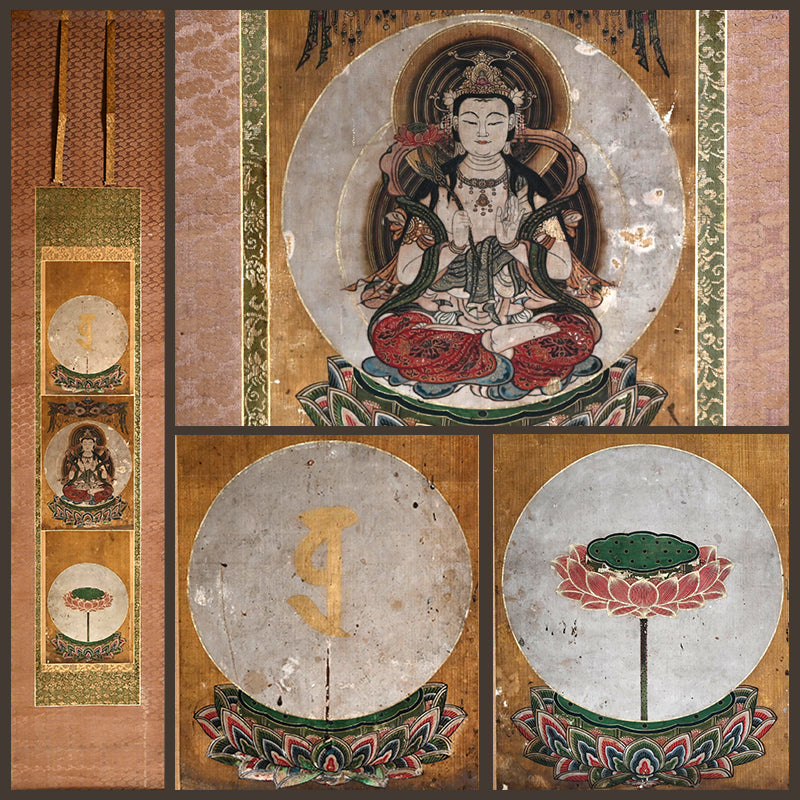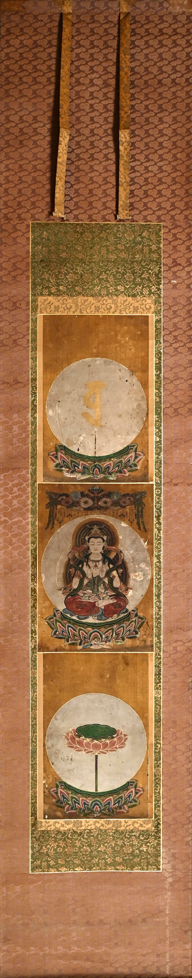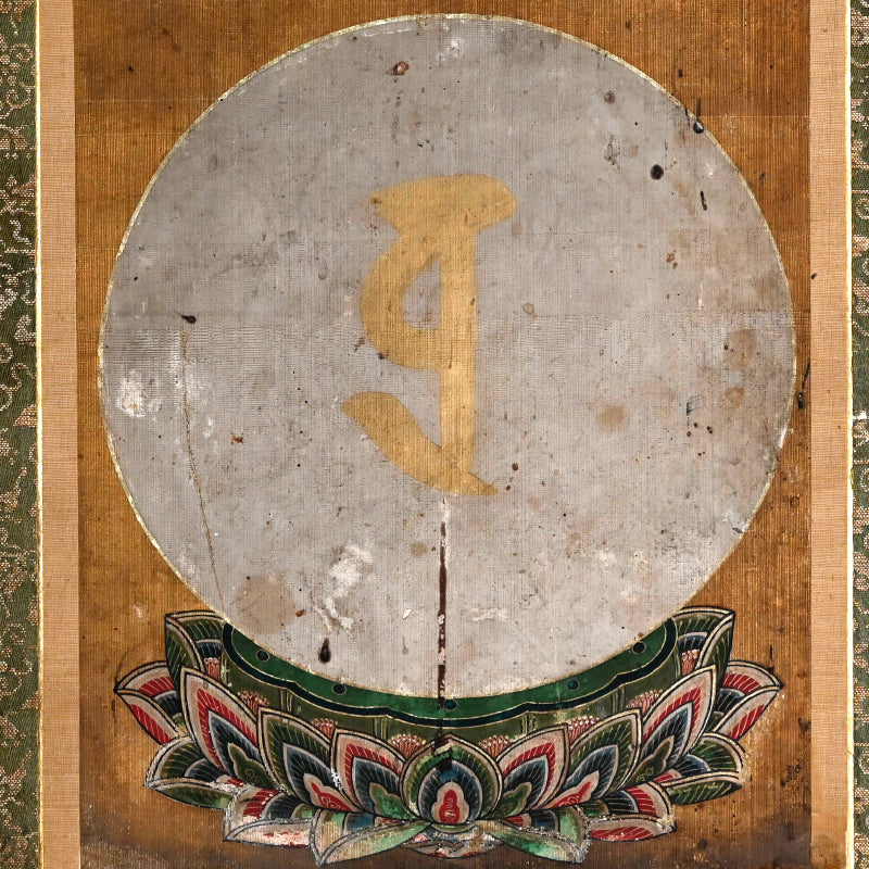 Gracefully enthroned upon a blossoming lotus, this Bosatsu radiates quiet clarity Holding a lotus blossom in the right hand and raising the left in a gesture of reassurance, the bodhisattva exudes gentle compassion. With hands held in the gesture of devotion, the bodhisattva appears suspended in luminous serenity, framed by delicately layered halos and flanked by ethereal blossoms. Above, a garland of lotus flowers drapes like a celestial canopy, while the richly patterned garments and fine detailing in gold leaf evoke the refined devotional aesthetics of the Edo period. This figure very likely represents a classical or slightly esoteric interpretation of Shō Kannon, the Sacred Form of Avalokiteśvara, one of the 33 manifestations of Kannon in Japanese Buddhism. Shō Kannon is often portrayed seated in contemplative repose upon a lotus pedestal, bearing a lotus, and displaying a serene, compassionate demeanor. Crowned and adorned with princely ornaments, Shō Kannon appears as a timeless protector of beings in distress. A lotus in hand is a common attribute of Kannon while the left hand open with palm facing outward at chest height is can be interpreted as a variation of the abhaya mudrā (gesture of reassurance or blessing), though it may also reference a localized esoteric gesture. In this vertical triptych, the central figure is flanked above and below by a Siddhaṃ seed syllable and a single lotus flower respectively. The seed character representing Brahmā, one of the celestial deities (tenbu) derived from Brahman, the supreme cosmic principle described in the Brāhmaṇa texts and the Upaniṣads. Brahman came to be conceived as the ultimate essence underlying the universe. Over time, Brahmā emerged as a personified form of this principle, eventually replacing Prajāpati as the creator god responsible for bringing all things into being and is revered as the sovereign of the Brahmā-world (Brahmaloka), one of the highest realms of existence.
