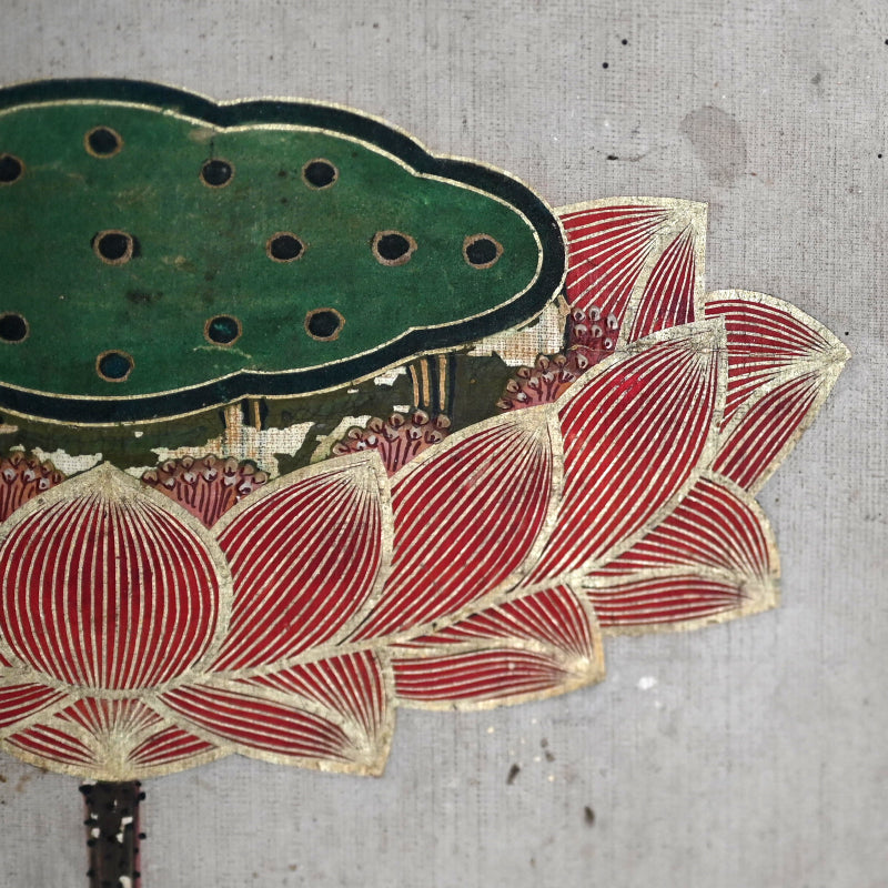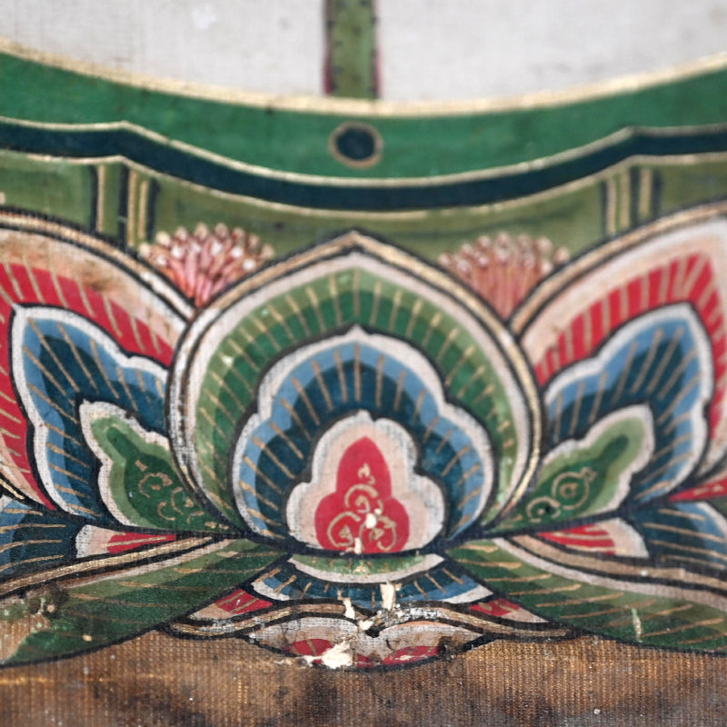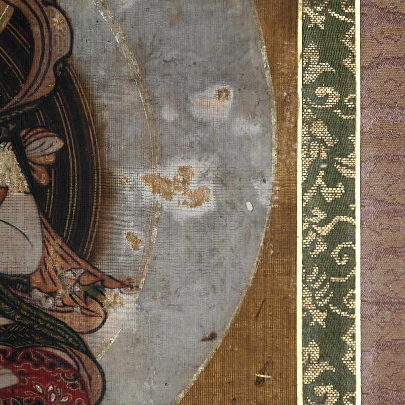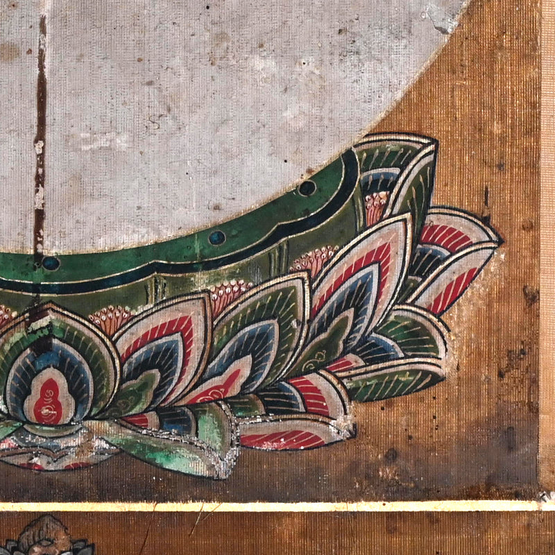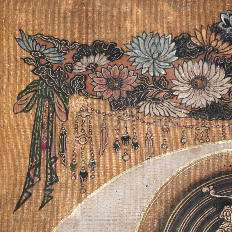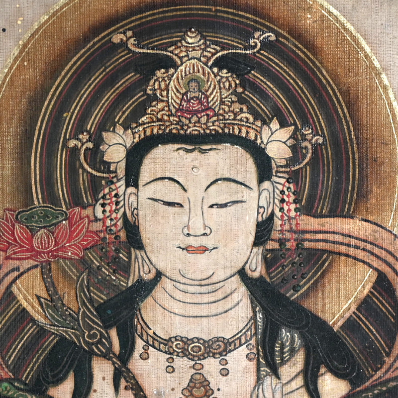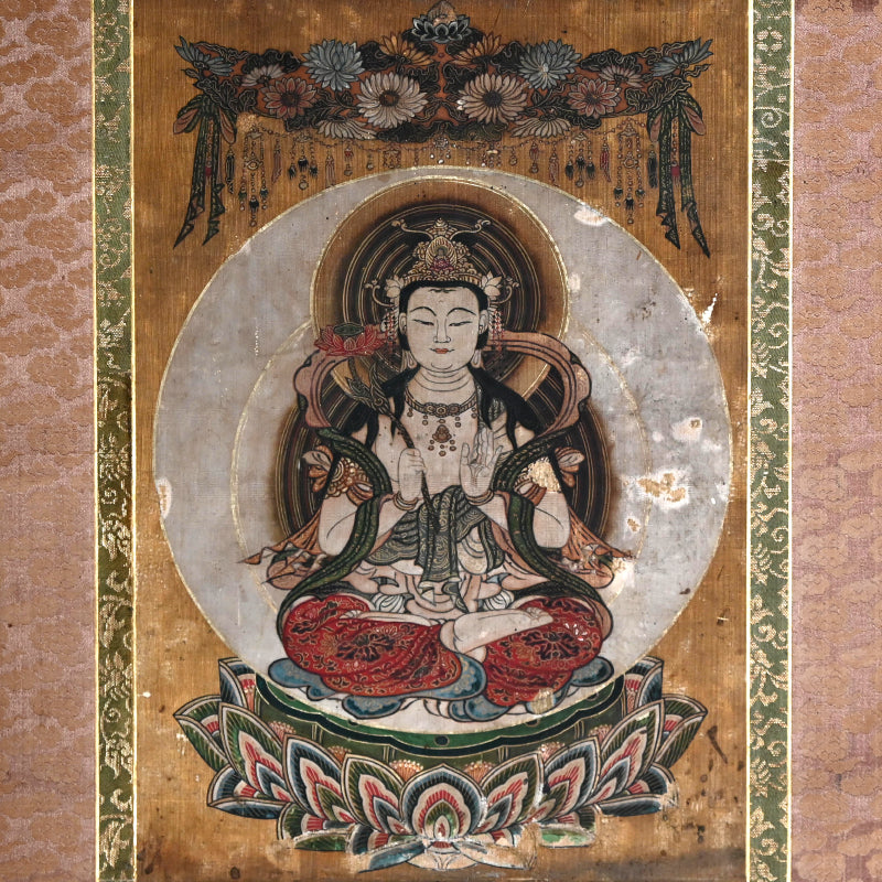 Gracefully enthroned upon a blossoming lotus, this Bosatsu radiates quiet clarity Holding a lotus blossom in the right hand and raising the left in a gesture of reassurance, the bodhisattva exudes gentle compassion. With hands held in the gesture of devotion, the bodhisattva appears suspended in luminous serenity, framed by delicately layered halos and flanked by ethereal blossoms. Above, a garland of lotus flowers drapes like a celestial canopy, while the richly patterned garments and fine detailing in gold leaf evoke the refined devotional aesthetics of the Edo period. This figure very likely represents a classical or slightly esoteric interpretation of Shō Kannon, the Sacred Form of Avalokiteśvara, one of the 33 manifestations of Kannon in Japanese Buddhism. Shō Kannon is often portrayed seated in contemplative repose upon a lotus pedestal, bearing a lotus, and displaying a serene, compassionate demeanor. Crowned and adorned with princely ornaments, Shō Kannon appears as a timeless protector of beings in distress. A lotus in hand is a common attribute of Kannon while the left hand open with palm facing outward at chest height is can be interpreted as a variation of the abhaya mudrā (gesture of reassurance or blessing), though it may also reference a localized esoteric gesture. In this vertical triptych, the central figure is flanked above and below by a Siddhaṃ seed syllable and a single lotus flower respectively. The seed character representing Brahmā, one of the celestial deities (tenbu) derived from Brahman, the supreme cosmic principle described in the Brāhmaṇa texts and the Upaniṣads. Brahman came to be conceived as the ultimate essence underlying the universe. Over time, Brahmā emerged as a personified form of this principle, eventually replacing Prajāpati as the creator god responsible for bringing all things into being and is revered as the sovereign of the Brahmā-world (Brahmaloka), one of the highest realms of existence.