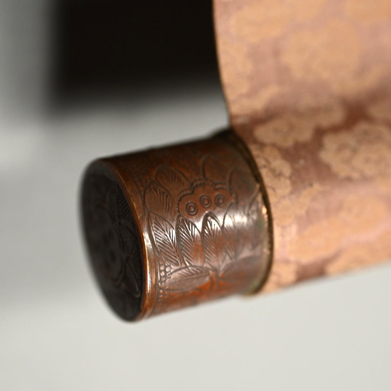 Ink, color, and gold on silk, it maintains the original silk mounting patterned with clouds over applied gold leaf terminating in etched brass rollers typical of Buddhist art. The scroll is 31 x 161 cm (12-1/2 x 63-1/2 inches) and is in overall fine condition, with some wear do to centuries of handling. It comes in an old wooden storage box.