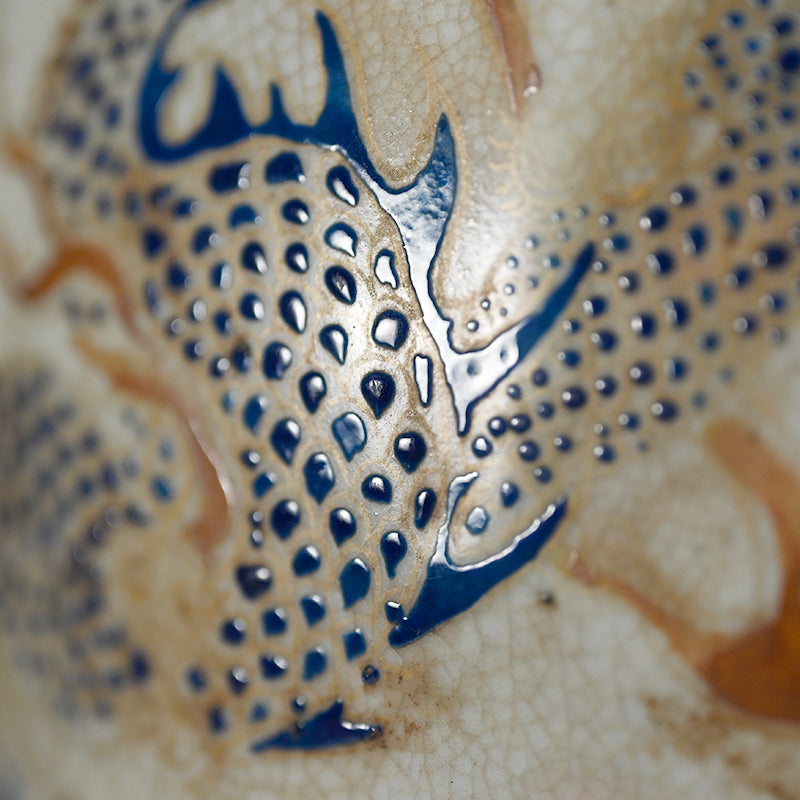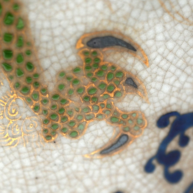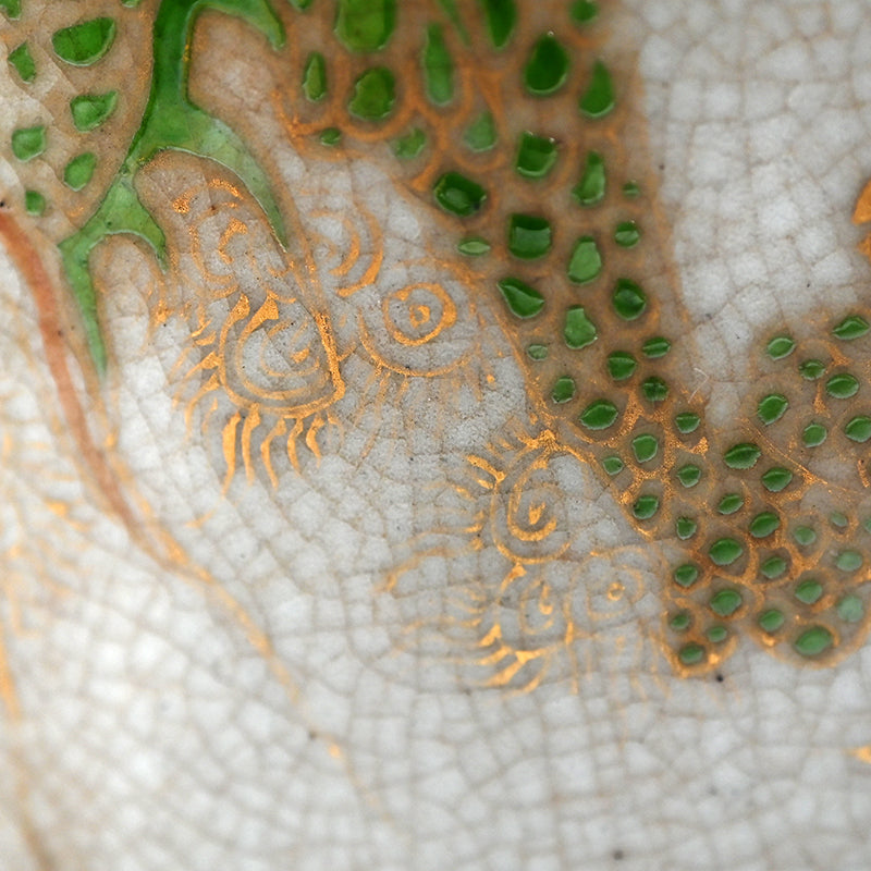 Dragons writhe over tempestuous waves on this large Kyoto Ninsei style pottery vase dating from the 19th century wrapped in a padded silk pouch and enclosed in a period wooden box. Meticulously crafted and decorated, it is a superb example of the late Edo to Meiji period aesthetic. The vase is 23 cm (9 inches) diameter, 31.5 cm (12-1/2 inches) tall and in overall excellent condition.