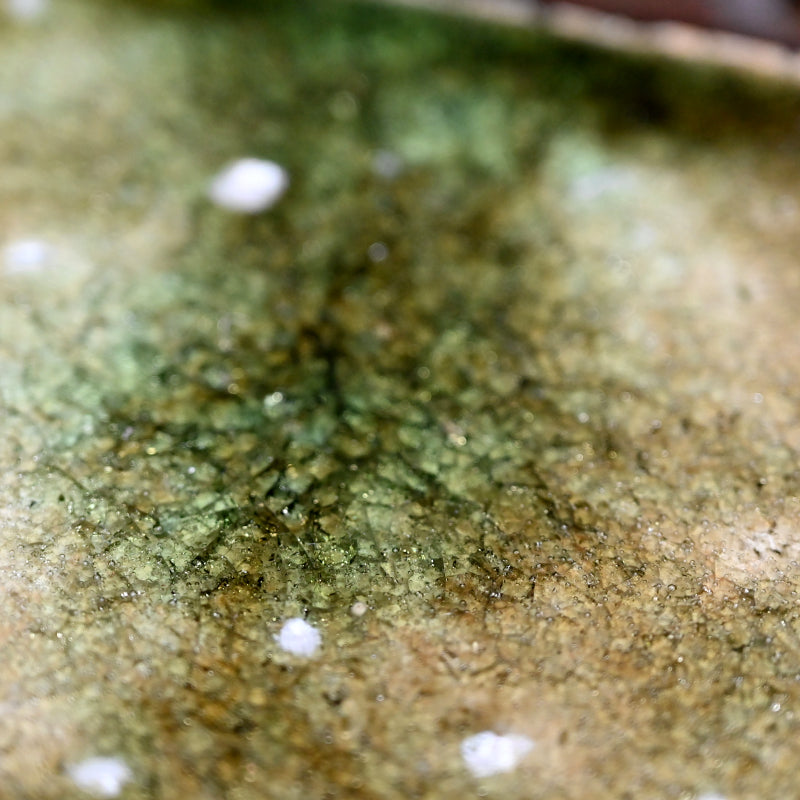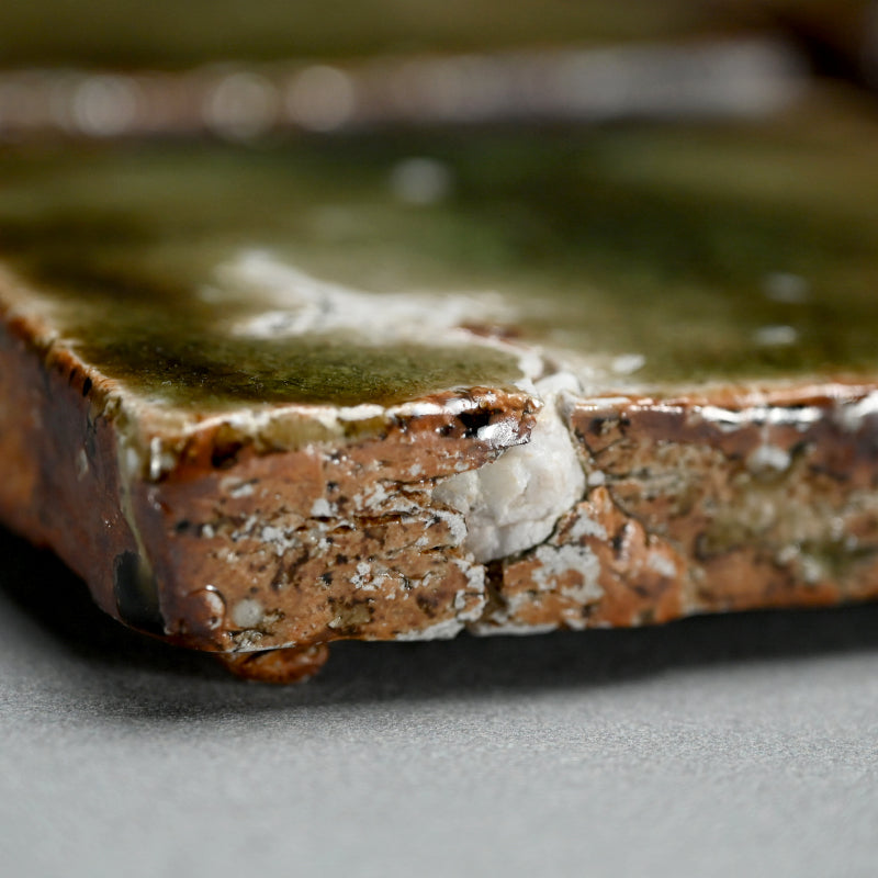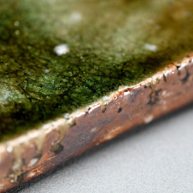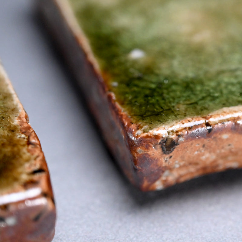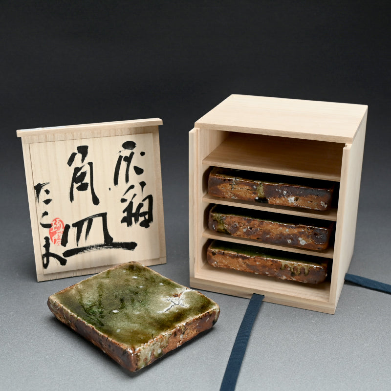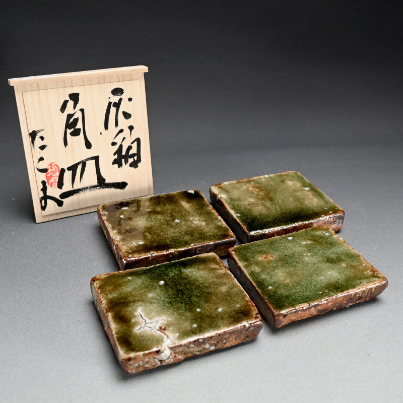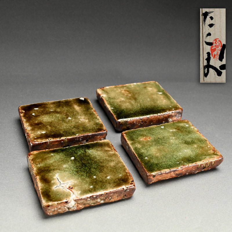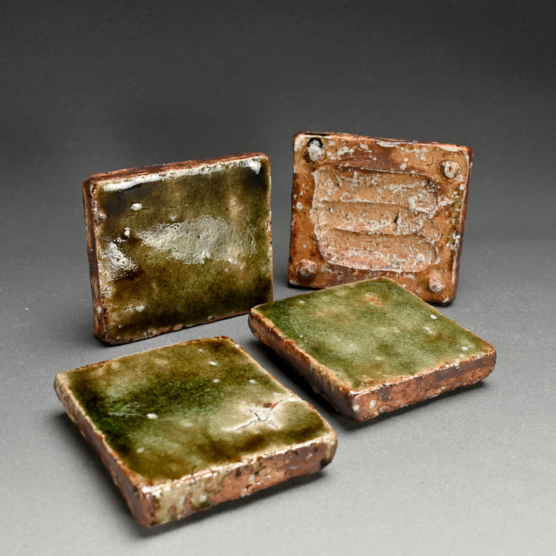 A striking set of four heavy ash glazed slabs in rich deep green by Murakoshi Takuma enclosed in the original signed wooden box titled Haiyu Kakuzara. They are 14.5 x 12.5 x 3 cm (5-1:2 x 5 x 1 inches) ad in excellent condition, directly rom the artist.