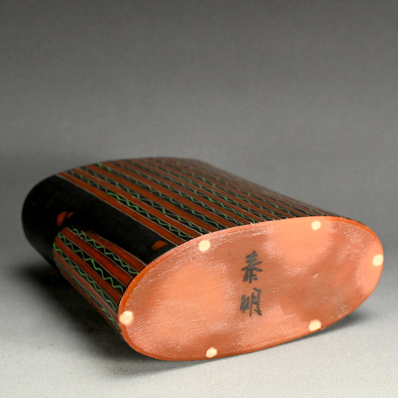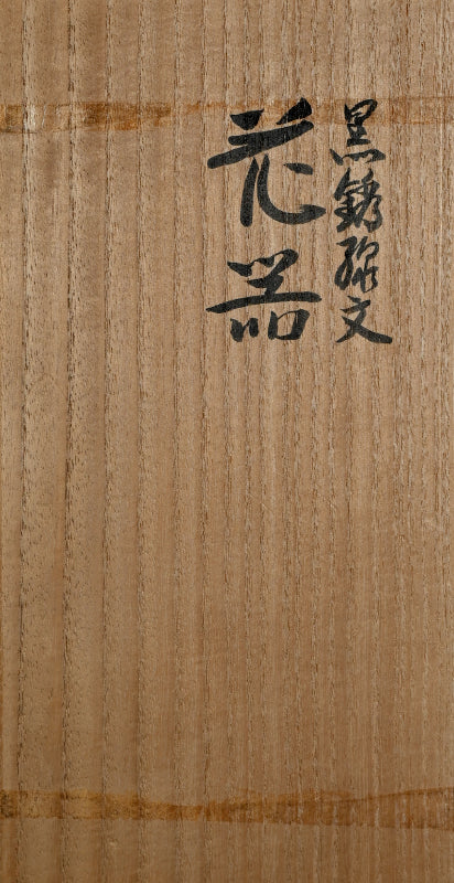 A masterpiece by contemporary ceramic legend Morino (Hiroaki) Taimei enclosed in the original signed wooden box titled Kurosabi Senmon Kaki. It is 21.5 x 10 x 25 cm (8-1/2 x 4 x 10 inches) and is in excellent condition.