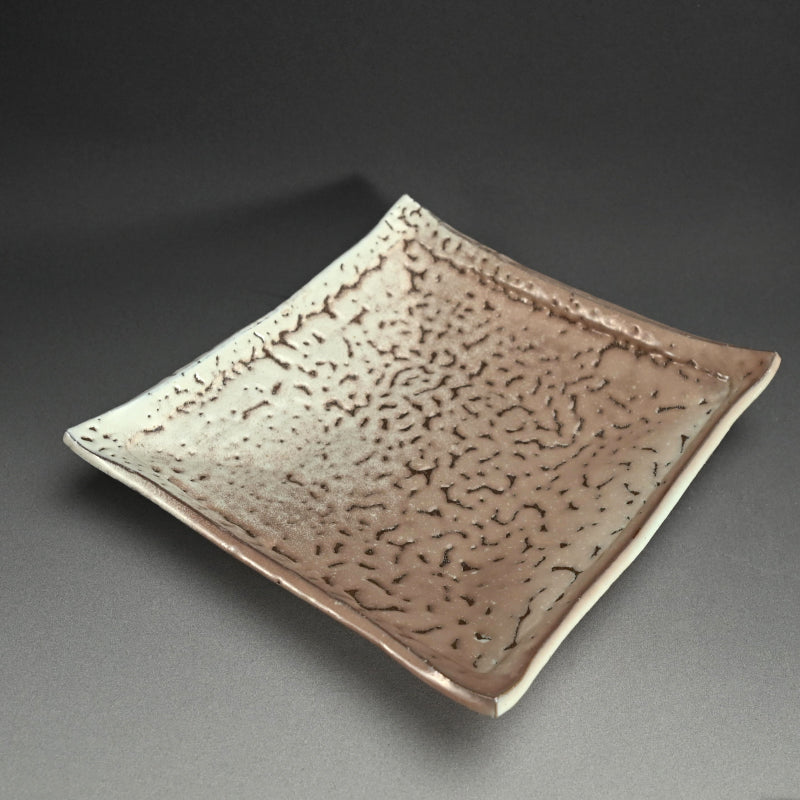A spectacular platter covered in crawling sunrise glaze by Miwa Eizo enclosed in the original signed wooden box simply titled Hagi Sara. It is 31.5 cm (12-1/2 inches) square, 7 cm (2-3/4 inches) tall and in excellent condition.