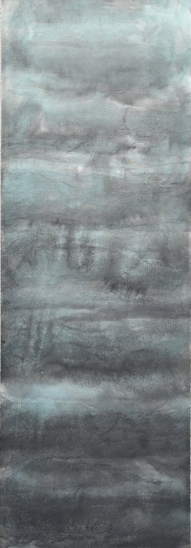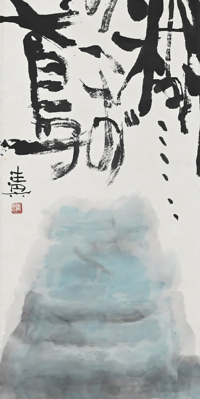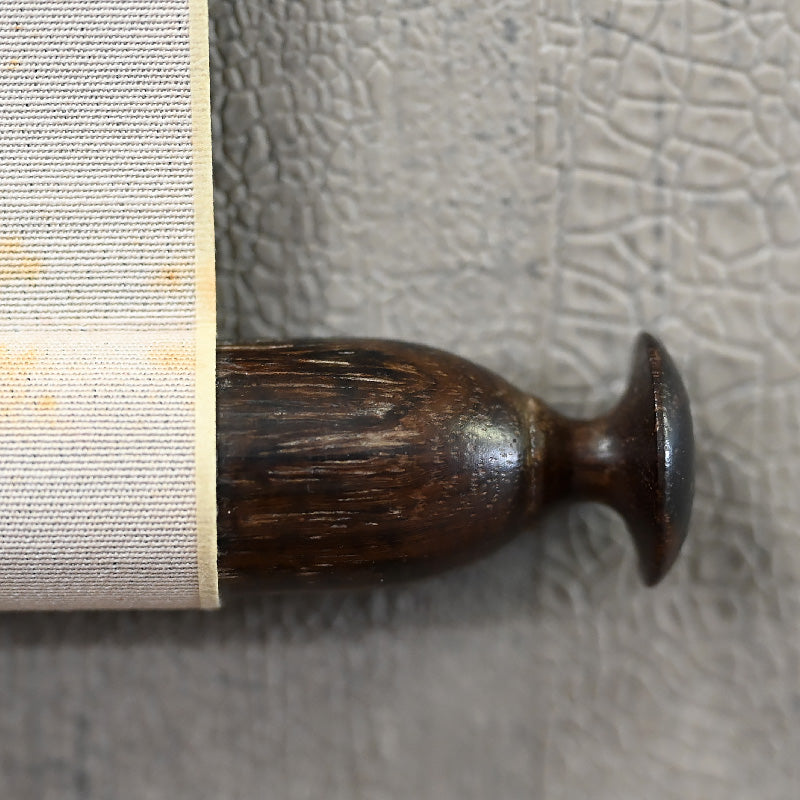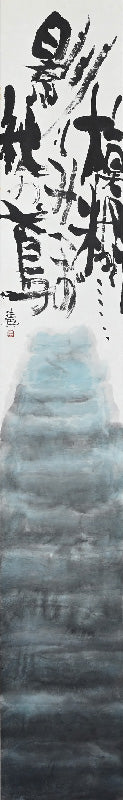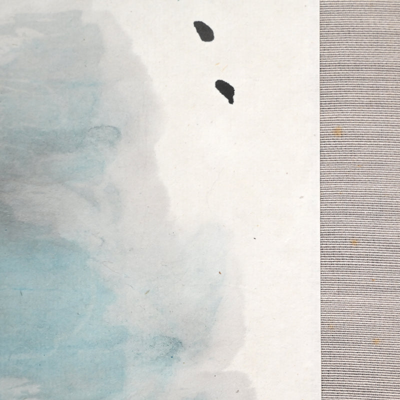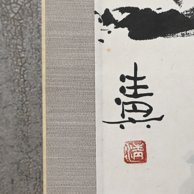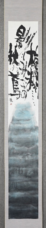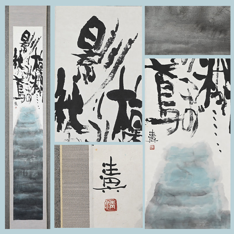 A fabulous scroll featuring a poem in rich, dark ink raining down upon a fog bank rising to meet the erratic verse by Nomura Seiroku. The poem reads Mokomokomokomoko kage mo mihezu aki no tsuta. Ink and light color on paper in a cool toned cloth border with turned wood rollers. It is 43 x 147.5 cm (16-1/2 x 58 inches) and is in excellent condition.