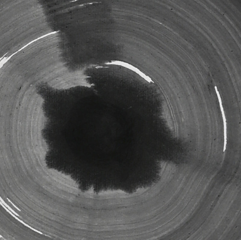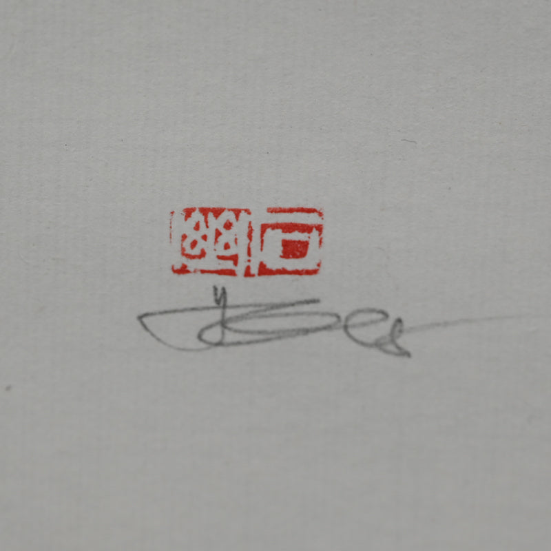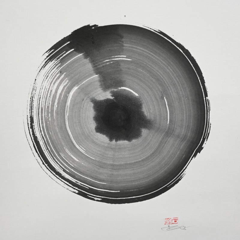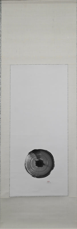 A simple circle, symbol of life, the journey, all and nothing, full and empty, so much can be said with this singular stroke punctuated by a stamp reading Yuseki. Ink on paper in a white tsumugi cloth border with momigami borders, a very stylish design with white faux ivory rollers enclosed in a kiri-wood box. It is 46.5 x 140.5 cm (18-1/4 x 55 inches) and is in excellent condition.