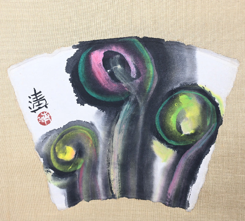 Fiddle head ferns sprout in vivid color on the fan shaped paper canvas of this scroll by Nomura Seiroku enclosed in the original signed wooden box titled Zenmai Ink and light color on paper mounted on cool fabric featuring wooden rollers. The scroll is 41.7 x 115.5 (16 × 45-1/2 inches) and is in excellent condition.